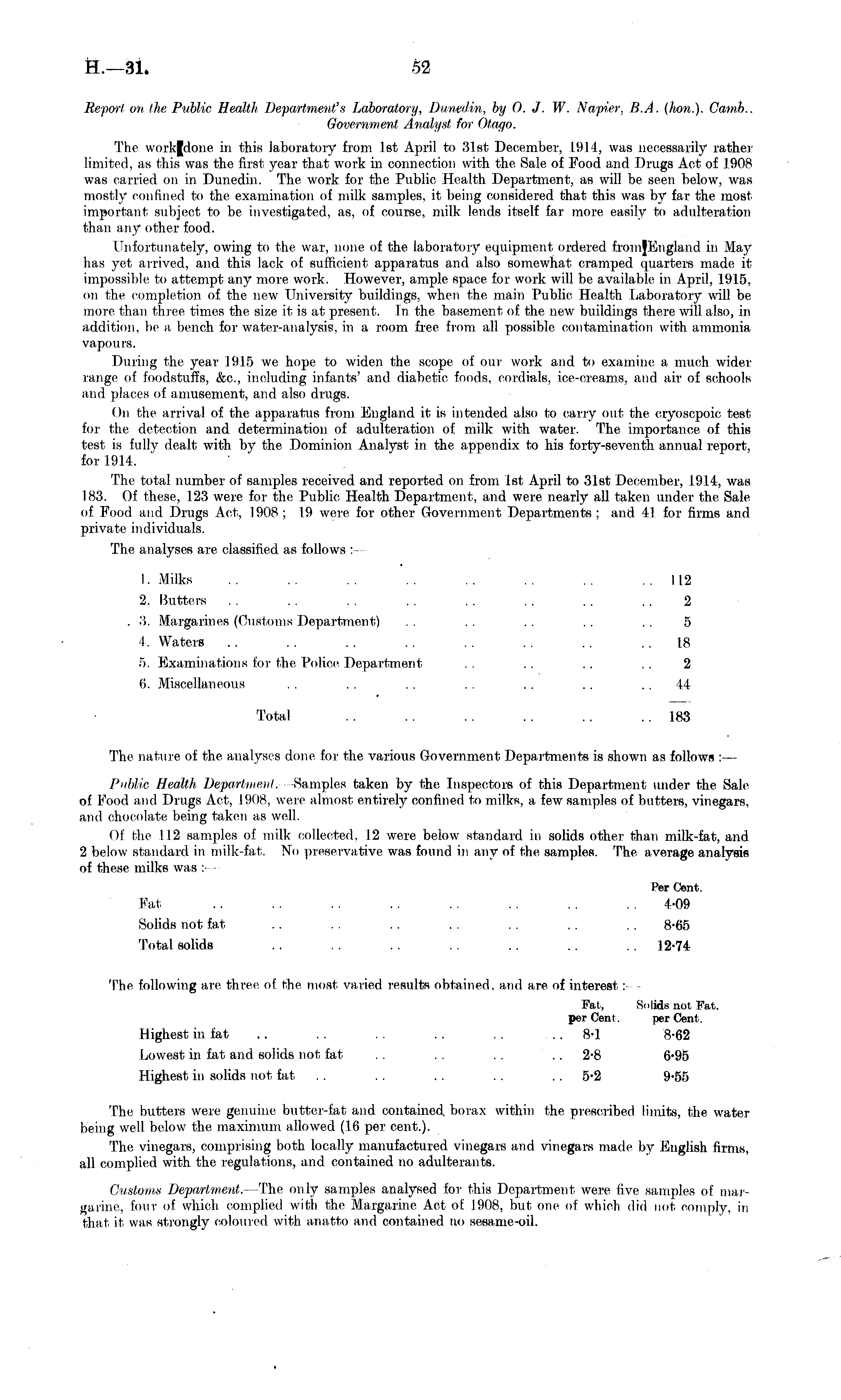 Report on the Public Health Department's Laboratory, Dunedin, by 0. J. W. Napier, B.A. (lion.). Camb.. Government Analyst for Otago. The work|done in this laboratory from Ist April to 31st December, 1.914, was necessarily rather limited, as this was the first year that work in connection with the Sale of Food and Drugs Act of 1908 was carried on in Dunedin. The work for the Public Health Department, as will be seen below, was mostly confined to the examination of milk samples, it being considered that this was by far the most important subject to be investigated, as, of course, milk lends itself far more easily to adulteration than any other food. Unfortunately, owing to the, war, none of the laboratory equipment ordered fromJEngland in May has yet arrived, and this lack of sufficient apparatus and also somewhat cramped quarters made it impossible to attempt any more work. However, ample space for work will be available, in April, 1915, on the completion of the new University buildings, when the main Public Health Laboratory will be more than three times the size it is at present. In the basement of the new buildings there will also, in addition, be a bench for water-analysis, in a room free from all possible contamination with ammonia vapours. During the year 1915 we hope to widen the scope of our work and to examine a much wider range of foodstuffs, &c, including infants' and diabetic foods, cordials, ice-creams, and air of schools and places of amusement, and also drugs. On the arrival of the apparatus from England it is intended also to carry out the oryoscpoio test for the detection and determination of adulteration of milk with water. The importance of this test is fully dealt with by the Dominion Analyst in the appendix to his forty-seventh annual report, for 1914. The total number of samples received and reported on from Ist April to 31st December, 1914, was 183. Of these, 123 were for the Public Health Department, and were nearly all taken under the. Sale of Food and Drugs Act, 1908; 1.9 were for other Government Departments; and 41 for firms and private individuals. The analyses are classified as follows : — 1. Milks .. .. .. .. .. .. ~ ..112 2. Butters . . . . . . . . . . .. .. .. 2 . 3. Margarines (Customs Department) . . . . .. . . 5 4. Waters .. . . . . .. . . . . . . 18 5. Examinations for the, Police Department . . . . . . 2 6. Miscellaneous . . . . . . .. 44 Total . . .. .. . . .. . . 183 The nature of the. analyses done for the various Government Departments is shown as follows :— Public Health Department. Samples taken by the Inspectors of this Department under the Sale of Food and Drags Act, 1908, were almost entirely confined to milks, a few samples of butters, vinegars, and chocolate being taken as well. Of the 112 samples of milk collected, 12 were below standard in solids other than milk-fat, and 2 below standard in milk-fat. No preservative was found in any of the samples. The average analysis of these milks was :— Per Cent. Fat .. .. .. . . . . . . 4-09 Solids not fat .. . . .. .. . . . . 8-65 Total solids .. .. .. .. .. .. .. 12-74 The following are three of. the most varied results obtained, and are of interest: Fat, Solids not Fat. per Cent. per Cent. Highest in fat .. .. .. .. . . 8-1 8-62 Lowest in fat and solids not fat .. . . . . .. 2-8 6-95 Highest in solids not fat .. . . .. 5-2 9-55 The butters were genuine butter-fat and contained, borax within the prescribed limits, the water being well below the maximum allowed (1.6 per cent.). The vinegars, comprising both locally manufactured vinegars and vinegars made by English firms, all complied with the regulations, and contained no adulterants. Customs Department. —The only samples analysed for this Department were five samples of margarine, four of which complied with this Margarine Act of 1908, but one of which did not comply, in that it was strongly coloured with anatto and contained no sesame-oil.