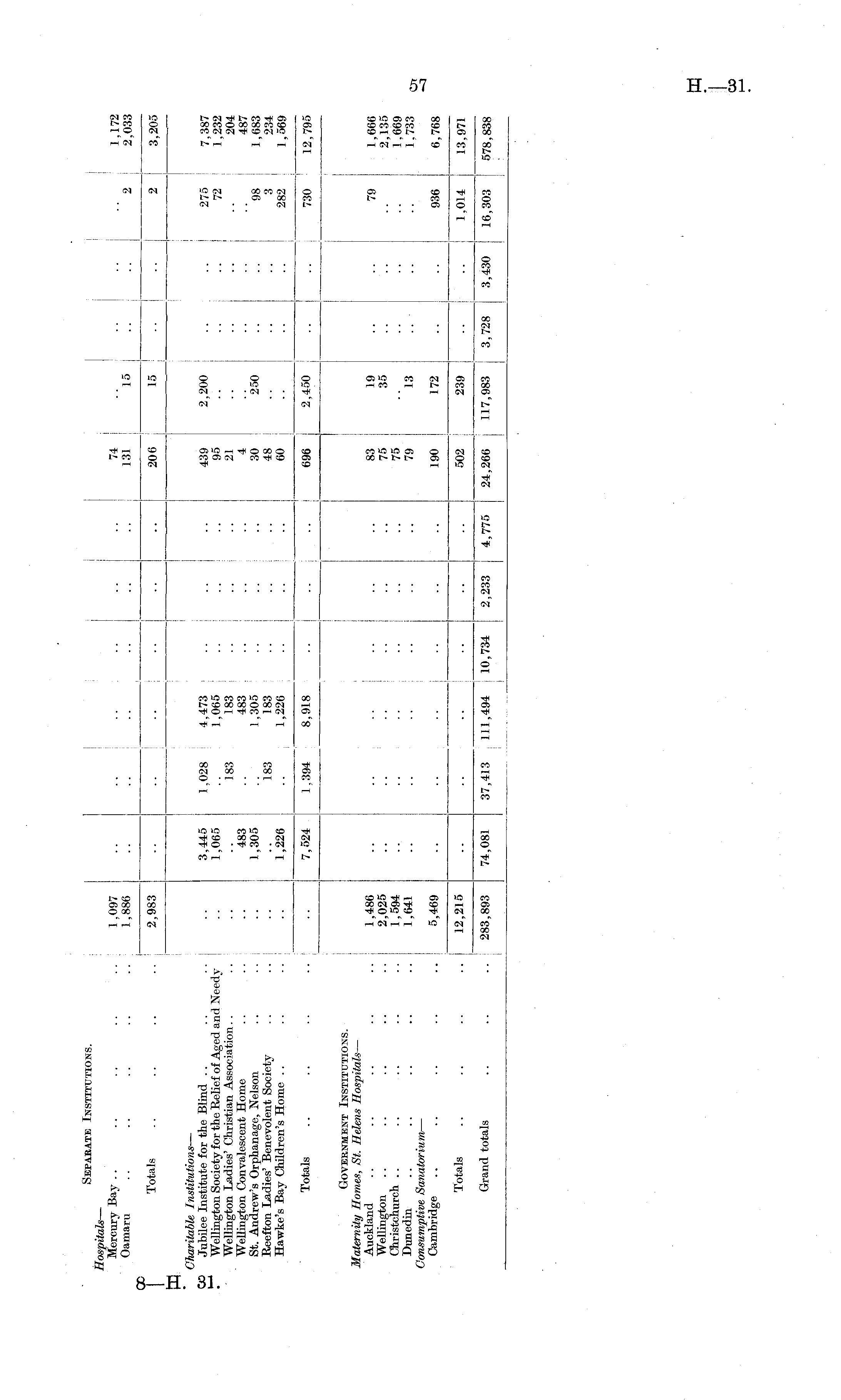 Separate Isstitutiohs. Hospitals — Mercury Bay .. .. .. .. .. 1.097 Oamaru .. .. .. .. .. 1,886 15 _L_ 2 1,17. 2,031 74 131 I Totals .. .. .. .. 2,983 2,983 206 15 I 2 3,20; Charitable Institutions — Jubilee Institute for the Blind Wellington Society for the Belief of Aged and Needy Wellington Ladies' Christian Association Wellington Convalescent Home .. St. Andrew's Orphanage, Nelson .. Reefton Ladies' Benevolent Society Hawke's Bay Children's Home 3.445 1,065 483 1,305 1,028 183 183 4.473 I 1,065 : 183 ; 483 1,305 183 1,226 439 95 21 4 30 48 60 2,200 250 275 ! 72 "98 3 282 : 7,387 1,232 204 487 1,683 234 1,569 1,226 Totals .. .. .. .. 7,524 1.394 8,918 696 2,450 730 12,795 ! GOVEBNMEST INSTITUTIOXS. Maternity Homes, St. Helens Hospitals — Auckland .. .. .. .. .. 1,486 Wellington .. .. .. .. .. 2,025 Christchurch .. .. .. .. .. 1,594 Dunedin .. .. .. .. .. 1,641 Consumptive Sanatorium — Cambridge .. .. .. .. .. 5,469 I 83 75 i 75 79 ' 19 35 13 79 1,666 2,135 1.669 1,733 i ! 190 j 172 936 6,768 ,014 ! 13,971 Totals .. .. .. .. 12,215 502 239 1,014 ! Grand totals .. .. .. j 283,893 74,081 37,413 111,494 10,734 2,233 ; 4,775 24,266 117,983 3,728 3,430 16,303 578,838