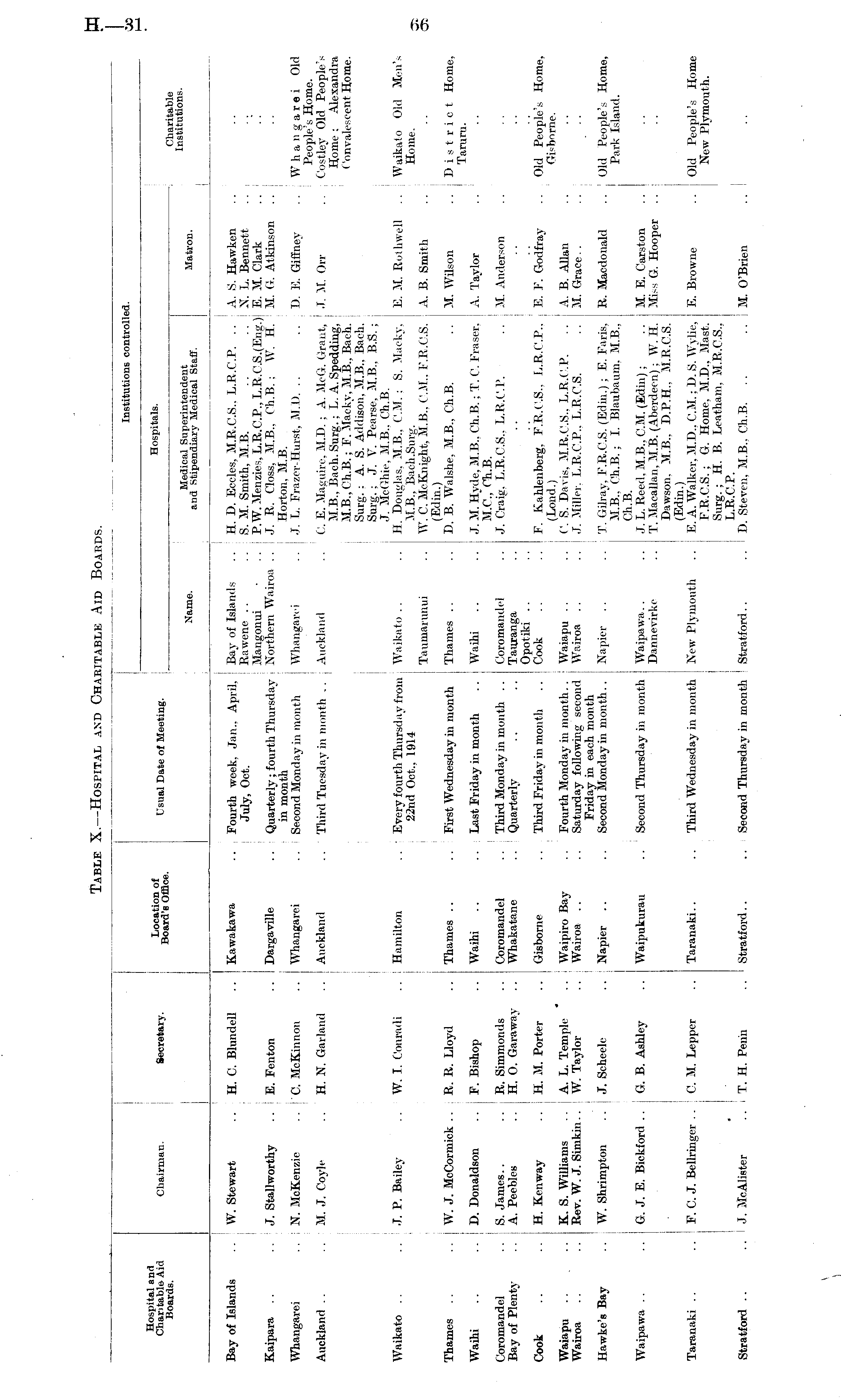 Institutions controlled. ■ Hospital and Charitable Aid Boards. Chairman. Secretary. Location of Board's Office. Usual Date of Meeting. Hospitals. Medical Superintendent and Stipendiary Medical Staff. Charitable Institutions. Name. Matron. i i Bay of Islands Kaipara . . .. W. Stewart .. H. C. Blundell J. Stallworthy .. E. Fenton Kawakawa Dargaville Whangarei Fourth week, Jan., April, Baj' of Islands July, Oct. Rawene Mangonui Quarterly; fourth Thursday Northern Wairoa .. in month Second Monday in month Whangarei H. D. Eccles, M.R.C.S.. L.R.C.P. .. A. S. Hawken S. M. Smith, M.B. .. .. N. L. Bennett. P.W. Menzies, L.R.C.P., L.R.C.S.(Eng.) E. M. Clark J. R. Closs, M.B., Ch.B. ; W. H. M. G. Atkinson Horton, M.B. J. L. Frazer-Hurst, M.D. . . .. D. E. Gifiney C. E. Maguire, M.D. ; A. McG. Grant, J. M. OnM.B., Bach. Surg.; L. A. Spedding, M.B., Ch.B.; F. Maeky, M.B., Bach. Surg. : A. S. Addison, M.B.. Bach. Surg. ; J. V. Pearse, M.B., B.S. ; J. MeOhie, M.B.. Ch.B. H. Douglas. M.B., CM. ; S. Maeky, E. M. Rothwell M.B., Bach.Surg. W. C. McKnight, M.B.. CM., F.R.C.S. A. B. Smith (Edin.) D. B. Walshe, M.B., Ch.B. .. M. Wilson Whangarei Old People's Home. .. Costley Old People's Home: Alexandra Convalescent Home. Waikato Old Men's Home. District Home, Taruru. Whangarei .. IN. McKenzie .. j'C. McKinnon Auckland . . M. J. Coyle .. H. N. Garland Auckland Third Tuesday in month .. Auckland Waikato . . .. j J. P. Bailey ' .. ] W. I. Conradi Hamilton Every fourth Thursday from ', Waikato 22nd Oct., 1914 - Taumarunui Thames .. | W. J. McCormick .. R. R. Lloyd Thames .. First Wednesday in month Thames . . Waihi Coromandel Bay of Plenty Cook Waiapu Wairoa .. D. Donaldson . . F. Bishop .. I S.James.. .. R. Sirnmonds .. j A. Peebles .. H. 0. Garaway .. H. Kenway .. H. M. Porter .. K. S. Williams .. A. L. Temple .. Rev. W. J. Simkin. . W. Taylor Waihi .. .. ; Last Friday in month .. Waihi J. M. Hvde, M.B.. Ch.B.; T. C Fraser. A. Tavlor M.C, Ch.B. J. Craig. L.R.C.S.. L.R.C.P. . . M. Anderson I _ Coromandel Whakatane Gisborne Third Monday in month .. Coromandel Quarterly .. .. Tauranga Opotiki Third Friday in month .. Cook " " F. Kahlenberg. F.R.C.S., L.R.C.P.. E. F. Godfray (Lond.) C S. Davis. M.R.C.S.. L.R.C.P. .. A. B. Allan J. Miller. L.R.C.P., L.R.C.S. -• M.Grace.. Old People's Home, Gisborne. Waipiro Bay Wairoa .. Napier .. : Fourth Monday in month.. Waiapu Saturday following second Wairoa Friday in each month Second Monday in month.. Napier Hawke's Bay Waipawa . . Taranaki .. W. Shrimpton .. J. Scheelo .. G. J. E. Bickford .. G. B. Ashley F. C. J. Bellringer .. C. M. Lepper Waipukurau Tarana ki.. Second Thursday in month Waipawa.. Dannevirke Third Wednesday in month New Plymouth T. Gilrav, F.R.C.S. (Edin.) ; E. Faris, R. Macdonald M.B.,* Ch.B. ; I. Blaubaum. M.B., Ch.B. J. L. Reed, M.B., CM. (Edin) ; .. M. E. Carston T. Macallan, M.B. (Aberdeen) ; W. H. Miss G. Hooper Dawson. M.B.. D.P.H.. M.R.C.S. (Edin.) E. A. Walker. M.D.. CM.; D. S. Wvlie, E. Browne F.R.C.S. ; G. Home. M.D.. Mast. Surg. ; H. B. Leatham, M.R.C.S., L.R.C.P. D. Steven, M.B.. Ch.B. .. .. M. O'Brien Old People's Home, Park Island. Old People's Home New Plymouth. Stratford . . .. i J. McAlister .. I T. H. Penh Stratford.. Second Thursday in month ' Stratford.. .. I