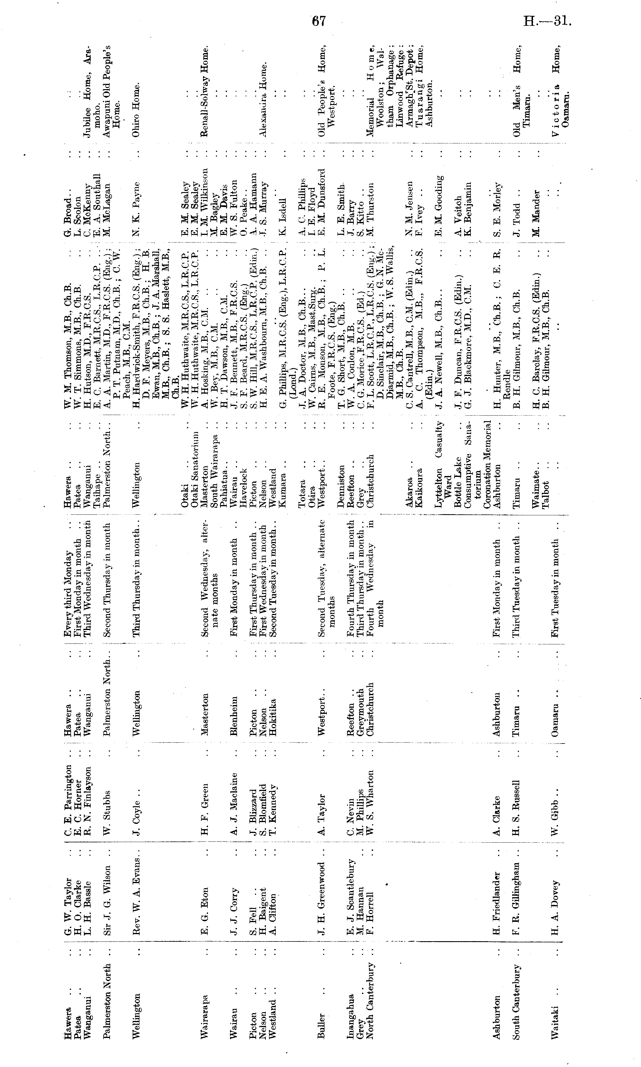 Hawera Patea Wanganui Palmerston North .. Wellington Wairarapa Wairau Picton Nelson Westland Buller Inangahua Grey .. North Canterbury .. Ashburton South Canterbury .. Waitaki G.W.Taylor .. C E. Parrington .. Hawera .. .. Every third Monday .. Hawera .. .. W. M. Thomson, M.B.. Ch.B. G. Broad.. H. 0. Clarke .. E. C. Horner .. Patea .. .. First Monday in month .. Patea .. .. W. T. Simmons, M.B., Ch.B. .. L. Soolon L. H. Bassle . . R. N. Finlayson . . Wanganui .. Third Wednesdav in month Wanganui .. H. Hutson, M.D., F.R.C.S. .. C. MoKenny Taihape .. . . E. C Barnett, M.R.C.S., L.R.C.P. .. E. A. Southall Sir J. G. Wilson .. W. Stubbs .. Palmerston North.. Second Thursdav in month Palmerston North.. A. A. Martin, M.D., F.R.C.S. (Eng.); M. McLagan P. T. Putnam, M.D., Ch.B. ; C. W. Peach, M.B., CM. Rev. W.A.Evans.. J. Coyle .. .. Wellington .. Third Thursday in month.. Wellington .. H. Hardwick-Smith, F.R.C.S. (Eng.) ; N. K. Payne D. F. Meyers, M.B., Ch.B.; H. B. Ewan, M.B., Ch.B. ; J. A. Marshall, M.B., Ch.B.; S. S. Haslett, M.B., Ch.B. Otaki .. .. W. H. Huthwaite, M.R.C.S., L.R.C.P. E. M. Sealey Otaki Sanatorium W. H. Huthwaite, M.R.C.S., L.R.C.P. E. M. Sealey E. G. Eton ., H. F. Green .. j Masterton .. , Second Wednesday, alter- Masterton . . A. Hosking, M.B., CM. .. .. I. M. Wilkinson nate months South Wairarapa .. W. Be}-, M.B.. CM. .. .. M. Baglev Pahiatua.. .. H. T. Dawson, M.B., CM. .. E.M.Davis J. J. Corrv .. A. J. Maclaine .. Blenheim .. First Monday in month .. Wairau .. .. J. F. Bennett, M.B., F.R.C.S. .. W. S. Fulton Havelock .. S. F. Beard, M.R.C.S. (Eng.) .. 0. Peake.. S. Fell .. .. J. Blizzard .. Picton .. .. First Thursday in month .. Picton .. .. S. W. Hill, M.R.C.S., L.R.C.P. (Edin.) A. A. Hamann H. Baigent .. S. Blornfiekl .. Nelson .. .. First Wednesday in month Nelson .. .. H. E. A. Washbourn, M.B., Ch.B. .. J. S. Murray A. Clifton .. T. Kenned v .. Hokitika . . Second Tuesdav in month.. Westland Kumara .. .. G. Phillips. M.R.C.S. (Ens.), L.R.C.P. K. Isdell (Lond.) Totara .. . . J. A. Doctor. M.B., Ch.B... .. I A. 0. Phillips Otira .. .. W. Cairns, M.B., Mast.Surg. .. LB, Floyd J.H.Greenwood .. A.Taylor .. Westport.. .. Second Tuesday, alternate Westport.. .. R. E. Monson. M.B., Ch.B.; P. L. E. M. Dunsford months Foote, F.R.C.S. (Eng.) Denniston .. T. G. Short, M.B., Ch.B. .. .. L. E. SmithE. J. Scantlebury C Nevin .. Reefton .. .. Fourth Thursdav in month Reefton .. .. W. A. Conlon, M.B. .. J. Barrv M. Hannan .. M. Phillips .. Greymouth .. Third Thursdav in month.. Grev .. .. C G. Morice .F.R.C.S. (Ed.) .. S. Kitto .. F. Horrell .. W.S.Wharton .. Christchurch .. Fourth Wednesdav in Christchurch .. F. L. Scott, L.R.C.P., L.R.C.S. (Eng.); M. Thurston month D. Sinclair, M.B.. Ch.B. ; G. N. McDiarmid, M.B., Ch.B. ; W. S. WaUis, M.B., Ch.B. Akaroa . . .. CS. Cantrell, M.B., CM. (Edin.) .. N. M. Jensen Kaikoura ... A. C Thompson, M.B.,, F.R.C.S. F. Ivev .. (Edin.) Lyttelton Casualty J. A. Newell, M.B., Ch.B... .. E. M. Gooding Ward Bottle Lake .. J. F. Duncan, F.R.C.S. (Edin.) .. A. Veitch Consumptive Sana- G. J. Blackmore, M.D., CM. .. K. Benjamin torium , Coronation Memorial H. Friedlander .. A. Clarke .. Ashburton .'. First Monday in month .. Ashburton .. H. Hunter, M.B., Ch.B.; 0. E. R. S. E. Morley Rendle F. R. Gillingham .. H.S.Russell .. Timaru .. .. Third Tuesday in month .. Timaru .. .. B. H. Gilmour, M.B., Ch.B. .. J.Todd .. Waimate.. .. H. C. Barclay, F.R.C.S. (Edin.) .. M. Mander Talbot . . .. B. H. Gilmour, M.B., Ch.B. H. A. Dovey .. W. Gibb .. ... Oamaru .. .. First Tuesday in month .. .. .. ... 1 I Jubilee Home, Ara- .. ; moho. Awapuni Old People's Home. Ohiro Home. Renall-Solway Home. Alexandra Home. Old People's Home. Westport. Memorial H o m e. Woolston; Waltham Orphanage: Linwood Refuge: Depot: Tuarangi Home. Ashburton. Old Men's Home, Timaru. Victoria Home, Ashburton South Canterbury .. Waitaki . .