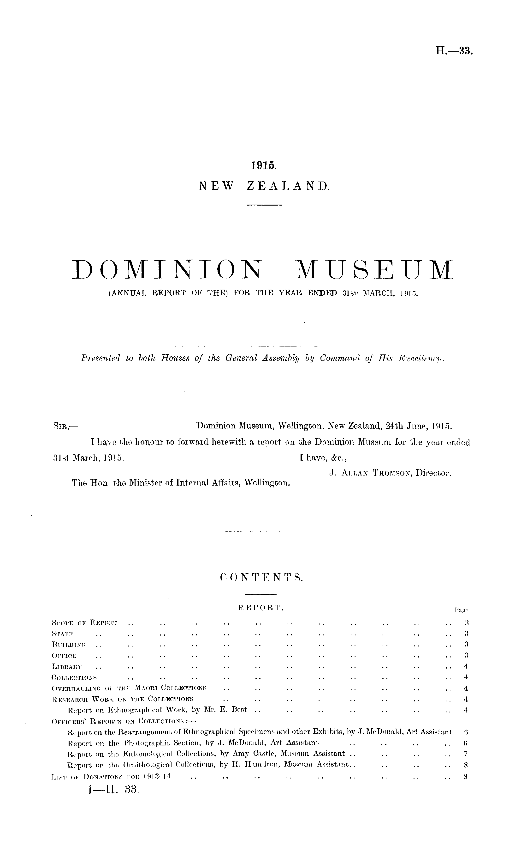 Sir, — Dominion Museum, Wellington, New Zealand, 24th June, 1915. I have the honour to forward herewith a report on the Dominion Museum for the year ended 31 st March, 1915. I have, &c, J. Allan Thomson, Director. The Hon. the Minister of Internal Affairs, Wellington.