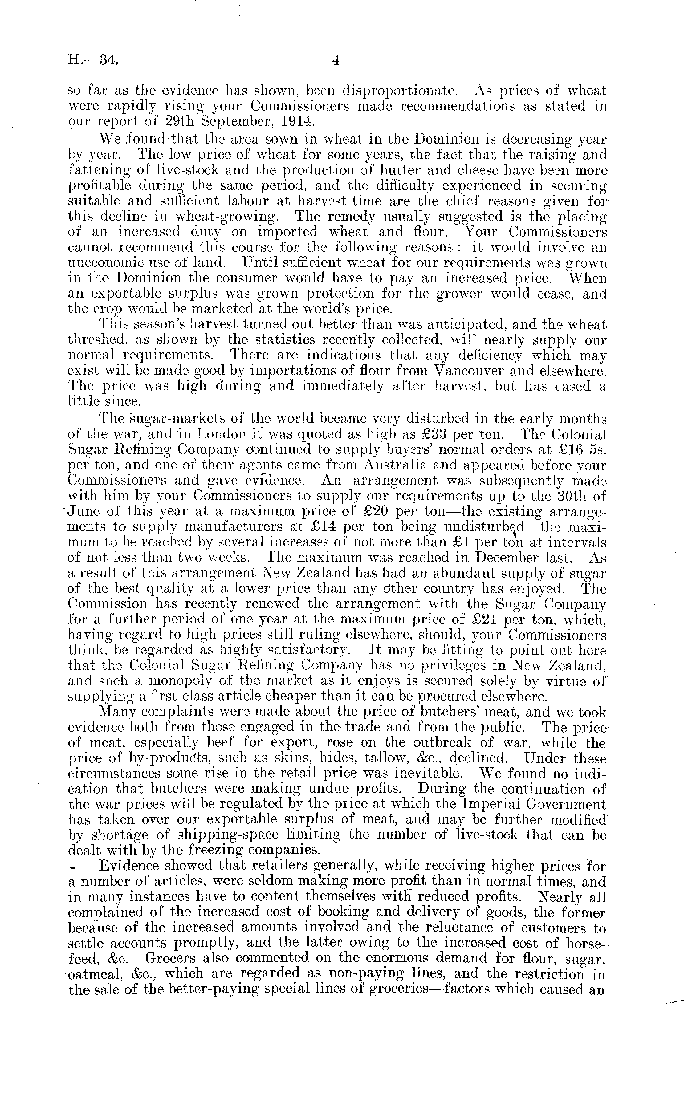 so far as the evidence has shown, been disproportionate. As prices of wheat were rapidly rising your Commissioners made recommendations as stated in our report of 29th September, 1914. We found that the area sown in wheat in the Dominion is decreasing year by year. The low price of wheat for some years, the fact that the raising and fattening of live-stock and the production of butter and cheese have been more profitable during the same period, and the difficulty experienced in securing suitable and sufficient labour at harvest-time are the chief reasons given for this decline in wheat-growing. The remedy usually suggested is the placing of an increased duty on imported wheat and flour. Your Commissioners cannot recommend this course for the following reasons : it would involve an uneconomic use of land. Until sufficient wheat for our requirements was grown in the Dominion the consumer would have to pay an increased price. When an exportable surplus was grown protection for the grower would cease, and the crop would be marketed at the world's price. This season's harvest turned out better than was anticipated, and the wheat threshed, as shown by the statistics recently collected, will nearly supply our normal requirements. There are indications that any deficiency which may exist will be made good by importations of flour from Vancouver and elsewhere. The price was high during and immediately after harvest, but has cased a little since. The sugar-markets of the world became very disturbed in the early months of the war, and in London it was quoted as high as £33 per ton. The Colonial Sugar Refining Company continued to supply buyers' normal orders at £16 ss. per ton, and one of their agents came from Australia and appeared before your Commissioners and gave evidence. An arrangement was subsequently made with him by your Commissioners to supply our requirements up to the 30th of June of this year at a maximum price of £20 per ton —the existing arrangements to supply manufacturers at £14 per ton being undisturbed—the maximum to be reached by several increases of not more than £1 per ton at intervals of not less than two weeks. The maximum, was reached in December last. As a result of this arrangement New Zealand has had an abundant supply of sugar of the best quality at a lower price than any other country has enjoyed. The Commission has recently renewed the arrangement with the Sugar Company for a further period of one year at the maximum price of £21 per ton, which, having regard to high prices still ruling elsewhere, should, your Commissioners think, be regarded as highly satisfactory. It may be fitting to point out here that the Colonial Sugar Refining Company has no privileges in New Zealand, and such a monopoly of the market as it enjoys is secured solely by virtue of supplying a first-class article cheaper than it can be procured elsewhere. Many complaints were made about the price of butchers' meat, and we took evidence both from those engaged in the trade and from the public. The price of meat, especially beef for export, rose on the outbreak of war, while the price of by-products, such as skins, hides, tallow, &c, declined. Under these circumstances some rise in the retail price was inevitable. We found no indication that butchers were making undue profits. During the continuation of the war prices will be regulated by the price at which the Imperial Government has taken over our exportable surplus of meat, and may be further modified by shortage of shipping-space limiting the number of live-stock that can be dealt with by the freezing companies. Evidence showed that retailers generally, while receiving higher prices for a number of articles, were seldom making more profit than in normal times, and in many instances have to content themselves with reduced profits. Nearly all complained of the increased cost of booking and delivery of goods, the former because of the increased amounts involved and the reluctance of customers to settle accounts promptly, and the latter owing to the increased cost of horsefeed, &c. Grocers also commented on the enormous demand for flour, sugar, oatmeal, &c, which are regarded as non-paying lines, and the restriction in the sale of the better-paying special lines of groceries—factors which caused an