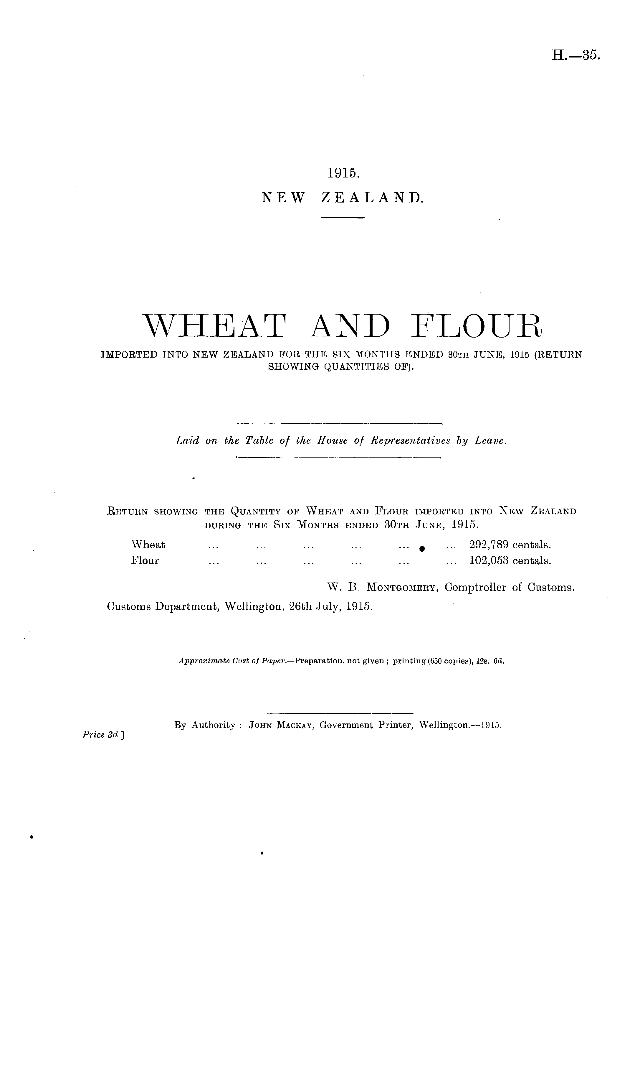 Return showing the Quantity of Wheat and Flour imported into New Zealand during the Six Months ended 30th June, 1915. Wheat ... ... ... ... ... # ... 292,789 centals. Flour ... ... ... ... ... ... 102,053 centals. W. B. Montgomery, Comptroller of Customs. Customs Department, Wellington, 26th July, 1915.