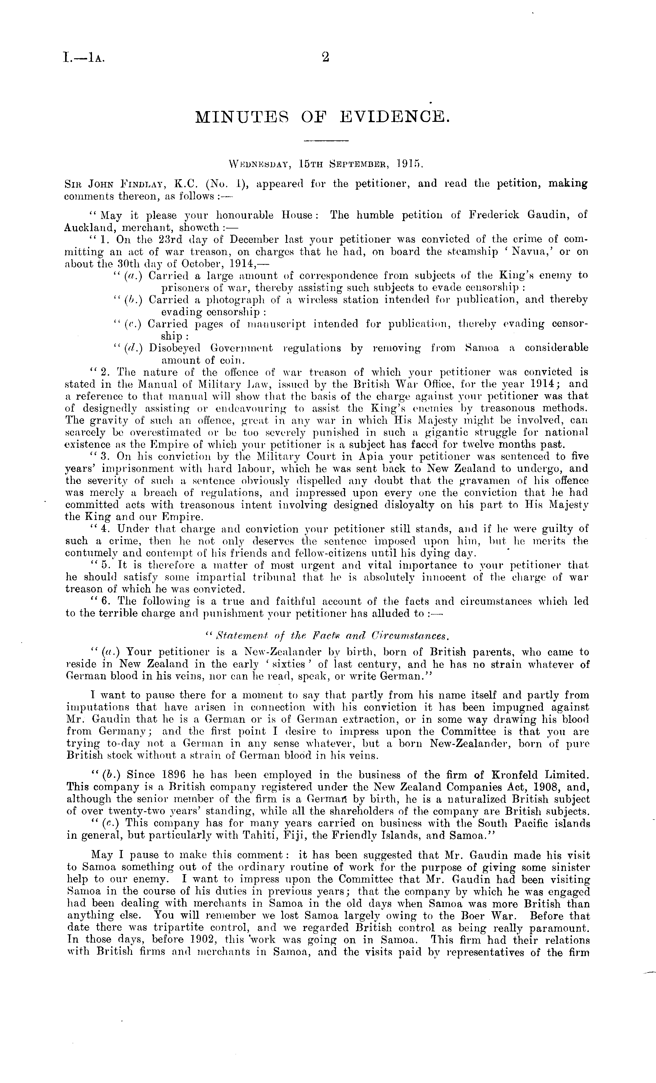 MINUTES OF EVIDENCE. Wednesday, 15th September, 1915, Sir John Findlay, K.C. (No. 1), appeared for the petitioner, and read the petition, making comments thereon, as follows : — "May it please your honourable House: The humble petition of Frederick Gaudin, of Auckland, merchant, showcth : — "1. On the 23rd day of December last your petitioner was convicted of the crime of committing an act of war treason, on charges that he had, on board the steamship ' Navua,' or on about the 30th day of October, 1914, — " («.) Carried a large amount of correspondence from subjects of the King's enemy to prisoners of war, thereby assisting such subjects to evade censorship : " (It.) Carried a photograph of a wireless station intended for publication, and thereby evading censorship : " (c) Carried pages of manuscript intended for publication, thereby evading censorship : " (d.) Disobeyed Government regulations by removing from Samoa a considerable amount of coin. " 2. The nature of the offence of war treason of which your petitioner was convicted is stated in the Manual of Military Law, issued by the British War Office, for the year 1914; and a reference to that manual will show that the basis of the charge against your petitioner was that of designedly assisting or endeavouring to assist the King's enemies by treasonous methods. The gravity of such an offence, great in any war in which His Majesty might be involved, can scarcely be overestimated or be too severely punished in such a gigantic struggle for national existence as the Empire of which your petitioner is a subject has faced for twelve months past. " 3. On his conviction by the Military Court in Apia your petitioner was sentenced to five years' imprisonment with hard labour, which he was sent back to New Zealand to undergo, and the severity of such a sentence obviously dispelled any doubt that the gravamen of his offence was merely a breach of regulations, and impressed upon every one the conviction that he had committed acts with treasonous intent involving designed disloyalty on his part to His Majesty the King and our Empire. " 4. Under that charge and conviction your petitioner still stands, and if he were guilty of such a crime, then he not only deserves the sentence imposed upon him, but he merits the contumely and contempt of his friends and fellow-citizens until his dying day. " 5. It is therefore a matter of most urgent and vital importance to your petitioner that he should satisfy some impartial tribunal that he is absolutely innocent of the charge of war treason of which he was convicted. " 6. The following is a true and faithful account of the facts and circumstances which led to the terrible charge and punishment your petitioner has alluded to : — " Statement, of the Facta and Circumstances. " (a.) Your petitioner is a New-Zealander by birth, born of British parents, who came to reside in New Zealand in the early ' sixties ' of last century, and he has no strain whatever of German blood in his veins, nor can he read, speak, or write German." I want to pause there for a moment to say that partly from his name itself and partly from imputations that have arisen in connection with his conviction it has been impugned against Mr. Gaudin that he is a German or is of German extraction, or in some way drawing his blood from Germany; and the first point I desire to impress upon the Committee is that you are trying to-day not a German in any sense whatever, but a born New-Zealander, born of pure British stock without a strain of German blood in his veins. " (b.) Since 1896 he has been employed in the business of the firm of Kronfeld Limited. This company is a British company registered under the New Zealand Companies Act, 1908, and, although the senior member of the firm is a German by birth, he is a naturalized British subject of over twenty-two years' standing, while all the shareholders of the company are British subjects. " (c.) This company has for many years carried on business with the South Pacific islands in general, but particularly with Tahiti, Fiji, the Friendly Islands, and Samoa." May I pause to make this comment: it has been suggested that Mr. Gaudin made his visit to Samoa something out of the ordinary routine of work for the purpose of giving some sinister help to our enemy. I want to impress upon the Committee that Mr. Gaudin had been visiting Samoa in the course of his duties in previous years; that the company by which he was engaged had been dealing with merchants in Samoa in the old days when Samoa was more British than anything else. You will remember we lost Samoa largely owing to the Boer War. Before that date there was tripartite control, and we regarded British control as being really paramount. In those days, before 1902, this 'work was going on in Samoa. This firm had their relations with British firms and merchants in Samoa, and the visits paid by representatives of the firm
