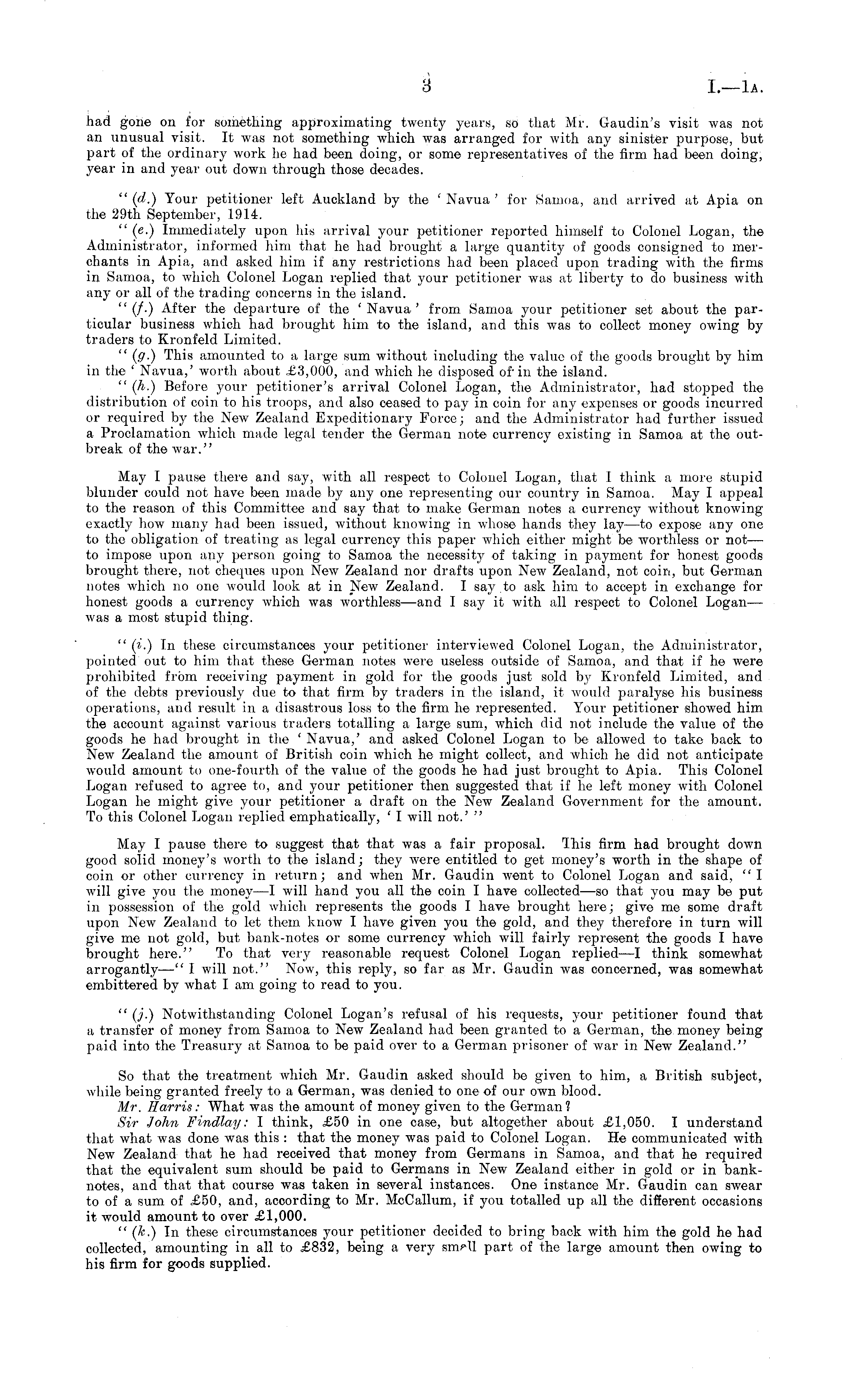 had gone on for something approximating twenty years, so that Mr. Gaudin's visit was not an unusual visit. It was not something which was arranged for with any sinister purpose, but part of the ordinary work he had been doing, or some representatives of the firm had been doing, year in and year out down through those decades. " (d.) Your petitioner left Auckland by the ' Navua ' for Samoa, and arrived at Apia on the 29th September, 1914. " (c.) Immediately upon his arrival your petitioner reported himself to Colonel Logan, the Administrator, informed him that he had brought a large quantity of goods consigned to merchants in Apia, and asked him if any restrictions had been placed upon trading with the firms in Samoa, to which Colonel Logan replied that your petitioner was at liberty to do business with any or all of the trading concerns in the island. " (/.) After the departure of the 'Navua' from Samoa your petitioner set about the particular business which had brought him to the island, and this was to collect money owing by traders to Kronfeld Limited. " (g.) This amounted to a large sum without including the value of the goods brought by him in the ' Navua,' worth about £3,000, and which he disposed of'in the island. " (h.) Before your petitioner's arrival Colonel Logan, the Administrator, had stopped the distribution of coin to his troops, and also ceased to pay in coin for any expenses or goods incurred or required by the New Zealand Expeditionary Force; and the Administrator had further issued a Proclamation which made legal tender the German note currency existing in Samoa at the outbreak of the war." May I pause there and say, with all respect to Colonel Logan, that I think a more stupid blunder could not have been made by any one representing our country in Samoa. May I appeal to the reason of this Committee and say that to make German notes a currency without knowing exactly how many had been issued, without knowing in whose hands they lay—to expose any one to the obligation of treating as legal currency this paper which either might be worthless or not — to impose upon any person going to Samoa the necessity of taking in payment for honest goods brought there, not cheques upon New Zealand nor drafts upon New Zealand, not coin, but German notes which no one would look at in New Zealand. I say to ask him to accept in exchange for honest goods a currency which was worthless —and I say it with all respect to Colonel Logan— was a most stupid thing. " (i.) In these circumstances your petitioner interviewed Colonel Logan, the Administrator, pointed out to him that these German notes were useless outside of Samoa, and that if he were prohibited from receiving payment in gold for the goods just sold by Kronfeld Limited, and of the debts previously due to that firm by traders in the island, it would paralyse his business operations, and result in a disastrous loss to the firm he represented. Your petitioner showed him the account against various traders totalling a large sum, which did not include the value of the goods he had brought in the ' Navua,' and asked Colonel Logan to be allowed to take back to New Zealand the amount of British coin which he might collect, and which he did not anticipate would amount to one-fourth of the value of the goods he had just brought to Apia. This Colonel Logan refused to agree to, and your petitioner then suggested that if he left money with Colonel Logan he might give your petitioner a draft on the New Zealand Government for the amount. To this Colonel Logan replied emphatically, ' I will not.' " May I pause there to suggest that that was a fair proposal. This firm had brought down good solid moneys worth to the island; they were entitled to get moneys worth in the shape of coin or other currency in return; and when Mr. Gaudin went to Colonel Logan and said, "I will give you the money —I will hand you all the coin I have collected —so that you may be put in possession of the gold which represents the goods I have brought here; give me some draft upon New Zealand to let them know I have given you the gold, and they therefore in turn will give me not gold, but bank-notes or some currency which will fairly represent the goods I have brought here." To that very reasonable request Colonel Logan replied —I think somewhat arrogantly—" I will not." Now, this reply, so far as Mr. Gaudin was concerned, was somewhat embittered by what I am going to read to you. " (j.) Notwithstanding Colonel Logan's refusal of his requests, your petitioner found that a transfer of money from Samoa to New Zealand had been granted to a German, the money being paid into the Treasury at Samoa to be paid over to a German prisoner of war in New Zealand." So that the treatment which Mr. Gaudin asked should be given to him, a British subject, while being granted freely to a German, was denied to one of our own blood. Mr. Harris: What was the amount of money given to the German 1 Sir John Findlay: I think, £50 in one case, but altogether about £1,050. I understand, that what was done was this : that the money was paid to Colonel Logan. He communicated with New Zealand that he had received that money from Germans in Samoa, and that he required that the equivalent sum should be paid to Germans in New Zealand either in gold or in banknotes, and that that course was taken in several instances. One instance Mr. Gaudin can swear to of a sum of £50, and, acoording to Mr. McCallum, if you totalled up all the different occasions it would amount to over £1,000. " (k.) In these circumstances your petitioner decided to bring back with him the gold he had collected, amounting in all to £832, being a very part of the large amount then owing to his firm for goods supplied.