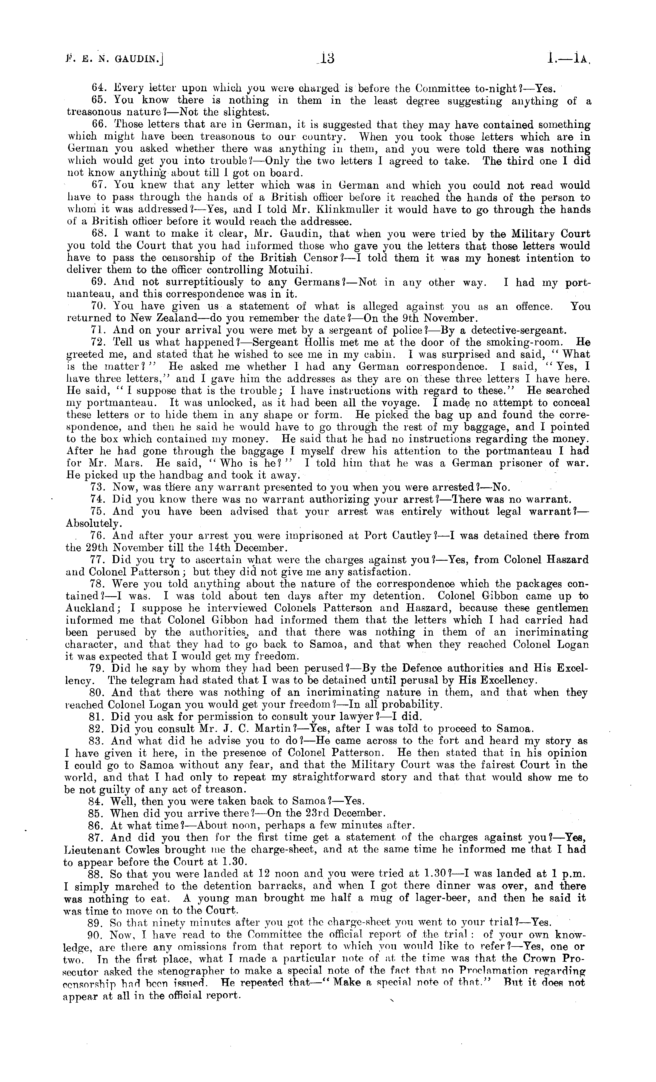 64. Every letter upon which you were charged is before the Committee to-night? —Yes. 65. You know there is nothing in them in the least degree suggesting anything of a treasonous nature?— Not the slightest. 66. Those letters that are in German, it is suggested that they may have contained something which might have been treasonous to our country. When you took those letters which are in German you asked whether there was anything in them, and you were told there was nothing which would get you into trouble? —Only the two letters I agreed to take. The third one I did not know anything about till 1 got on board. 67. You knew that any letter which was in German and which you could not read would have to pass through the hands of a British officer before it reached the hands of the person to whom it was addressed? —Yes, and I told Mr. Klinkmuller it would have to go through the hands of a British officer before it would reach the addressee. 68. I want to make it clear, Mr. Gaudin, that when you were tried by the Military Court you told the Court that you had informed those who gave you the letters that those letters would have to pass the censorship of the British Censor? —I told them it was my honest intention to deliver them to the officer controlling Motuihi. 69. And not surreptitiously to any Germans?— Not in any other way. I had my portmanteau, and this correspondence was in it. 70. You have given us a statement of what is alleged against you as an offence. You returned to New Zealand —do you remember the date? —On the 9th November. 71. And on your arrival you were met by a sergeant of police?—By a detective-sergeant. 72. Tell us what happened?— Sergeant Hollis met me at the door of the smoking-room. He greeted me, and stated that he wished to see me in my cabin. I was surprised and said, " What is the matter?" He asked me whether 1 had any German correspondence. I said, "Yes, I have three letters," and I gave him the addresses as they are on these three letters I have here. He said, " I suppose that is the trouble; I have instructions with regard to these." He searched my portmanteau. It was unlocked, as it had been all the voyage. I made no attempt to conceal these letters or to hide them in any shape or form. He picked the bag up and found the correspondence, and then he said he would have to go through the rest of my baggage, and I pointed to the box which contained my money. He said that he had no instructions regarding the money. After he had gone through the baggage I myself drew his attention to the portmanteau I had for Mr. Mars. He said, "Who is he? " I told him that he was a German prisoner of war. He picked up the handbag and took it away. 73. Now, was there any warrant presented to you when you were arrested? —No. 74. Did you know there was no warrant authorizing your arrest? —I'here was no warrant. 75. And you have been advised that your arrest was entirely without legal warrant? — Absolutely. 76. And after your arrest you, were imprisoned at Port Cautley? —I was detained there from the 29th November till the 14th December. 77. Did you try to ascertain what were the charges against you? —Yes, from Colonel Haszard and Colonel Patterso'n; but they did not give me any satisfaction. 78. Were you told anything about the nature of the correspondence which the packages contained?—l was. I was told about ten days after my detention. Colonel Gibbon came up to Auckland; I suppose he interviewed Colonels Patterson and Haszard, because these gentlemen informed me that Colonel Gibbon had informed them that the letters which I had carried had been perused by the authorities, and that there was nothing in them of an incriminating character, and that they had to go back to Samoa, and that when they reached Colonel Logan it was expected that I would get my freedom. 79. Did he say by whom they had been perused?—By the Defence authorities and His Excellency. The telegram had stated that I was to be detained until perusal by His Excellency. 80. And that there was nothing of an incriminating nature in them, and that when they reached Colonel Logan you would get your freedom? —In all probability. 81. Did you ask for permission to consult your lawyer?—l did. 82. Did you consult Mr. J. C. Martin? —Yes, after I was told to proceed to Samoa. 83. And what did he advise you to do? —He came across to the fort and heard my story as I have given it here, in the presence of Colonel Patterson. He then stated that in his opinion I could go to Samoa without any fear, and that the Military Court was the fairest Court in the world, and that I had only to repeat my straightforward story and that that would show me to be not guilty of any act of treason. 84. Well, then you were taken back to Samoa? —Yes. 85. When did you arrive there? —On the 23rd December. 86. At what time?— About noon, perhaps a few minutes after. 87. And did you then for the first time get a statement of the charges against you?— Yes, Lieutenant Cowles brought me the charge-sheet, and at the same time he informed me that I had to appear before the Court at 1.30. 88. So that you were landed at 12 noon and you were tried at 1.30? —I was landed at 1 p.m. I simply marched to the detention barracks, and when I got there dinner was over, and there was nothing to eat. A. young man brought me half a mug of lager-beer, and then he said it was time to move on to the Court. 89. So that ninety minutes after you got the charge-sheet you went to your trial?— Yes. 90. Now, I have read to the Committee the official report of the trial : of your own knowledge, are there any omissions from that report to which you would like to refer? —Yes, one or two. In the first place, what I made a particular note of at. the time was that the Crown Prosecutor asked the stenographer to make a special note of the fact that no Proclamation regarding censorship had been issued. He repeated that —" Make a special note o