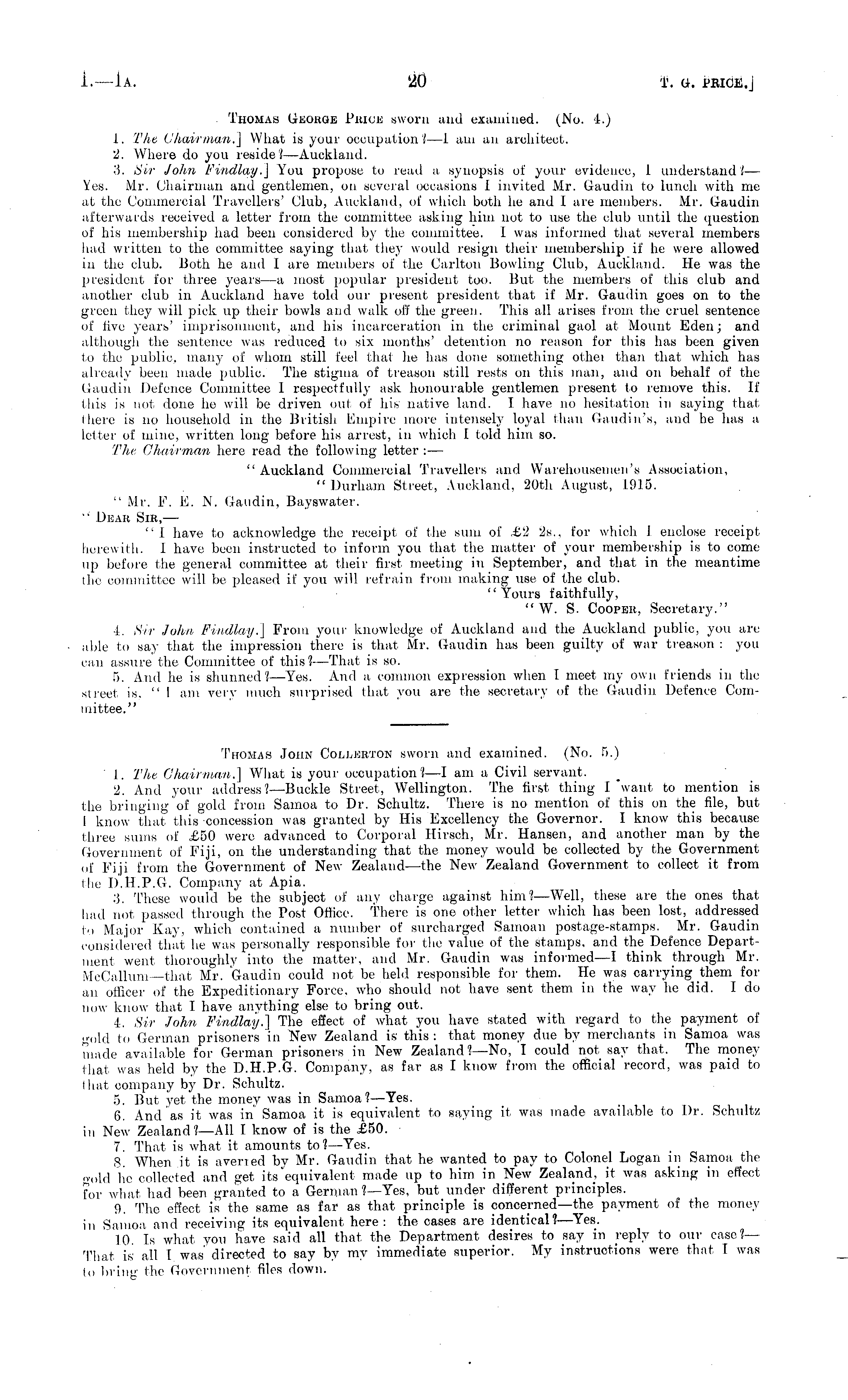 Thomas George Price sworn and examined. (No. 4.) 1. The Chairman.] What is your occupation?—l am an architect. 2. Where do you reside?— Auckland. 3. Sir John Findlay.] You propose to read a synopsis of your evidence, 1 understand? — Yes. Mr. Chairman and gentlemen, on several occasions I invited Mr. Gaudin to lunch with me at the Commercial Travellers' Club, Auckland, of which both he and I are members. Mr. Gaudin afterwards received a letter from the committee asking him not to use the club until the question of his membership had been considered by the committee. I was informed that several members had written to the committee saying that they would resign their membership if he were allowed in the club. Both he and I are members of the Carlton Bowling Club, Auckland. He was the president for three years—a most popular president too. But the members of this club and another club in Auckland have told our present president that if Mr. Gaudin goes on to the green they will pick up their bowls and walk off the green. This all arises from the cruel sentence of five years' imprisonment, and his incarceration in the criminal gaol at Mount Eden; and although the sentence was reduced to six months' detention no reason for this has been given to the public, many of whom still feel that he lias done something othei than that which has already been made public. The stigma of treason still rests on this man, and on behalf of the Gaudin Defence Committee I respectfully ask honourable gentlemen present to remove this. If this is not done he will be driven out of his native land. I have no hesitation in saying that there is no household in the British Empire more intensely loyal than Gaudin's, and he has a letter of mine, written long before his arrest, in which I told him so. The Chairman here read tho following letter : — " Auckland Commercial Travellers and Warehousemen's Association, "Durham Street, Auckland, 20th August, 1915. " Mr. F. E. N. Gaudin, Bayswater. " Dear Sir, — " I have to acknowledge the receipt of the sum of £2 25., for which .1 enclose receipt herewith. I have been instructed to inform you that the matter of your membership is to come up before the general committee at their first meeting in September, and that in the meantime the committee will be pleased if you will refrain from making use of the club. "Yours faithfully, " W. S. Cooper, Secretary." 4. Sir John Findlay.] From your knowledge of Auckland and the Auckland public, you are able to say that the impression there is that Mr. Gaudin has been guilty of war treason : you can assure the Committee of this? —That is so. 5. And he is shunned? —Yes. And a common expression when I meet my own friends in the street, is, " I am very much surprised that you are the secretary of the Gaudin Defence Committee."