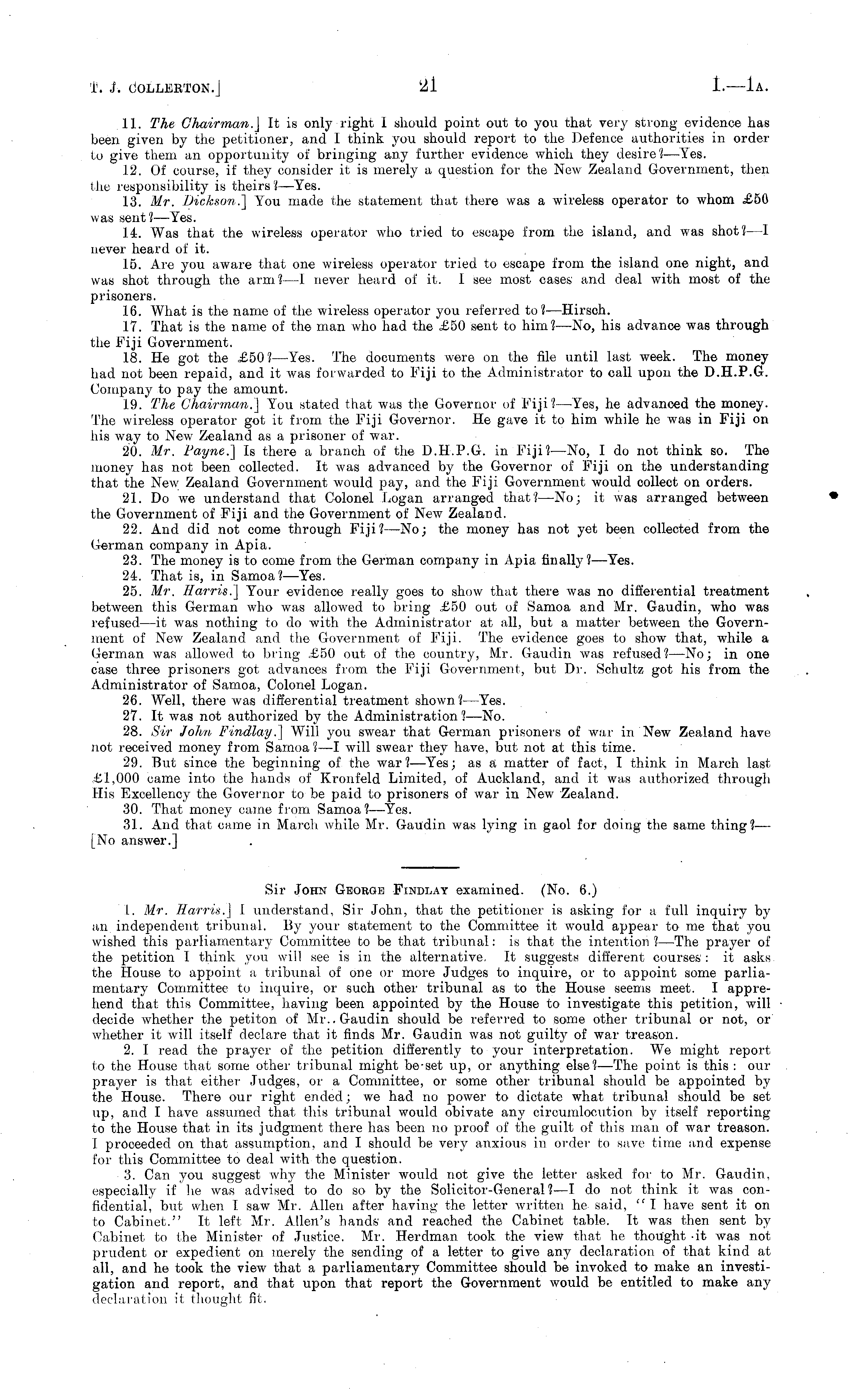 11. The Chairman.] It is only right I should point out to you that very strong evidence has been given by the petitioner, and I think you should report to the Defence authorities in order to give them an opportunity of bringing any further evidence which they desire?— Yes. 12. Of course, if they consider it is merely a question for the New Zealand Government, then the responsibility is theirs ?—Yes. 13. Mr. Dickson.] You made the statement that there was a wireless operator to whom £50 was sent? —Yes. 14. Was that the wireless operator who tried to escape from the island, and was shot? —I never heard of it. 15. Are you aware that one wireless operator tried to escape from the island one night, and was shot through the arm? —1 never heard of it, 1 see most cases' and deal with most of the prisoners. 16. What is the name of the wireless operator you referred to? —Hirsch. 17. That is the name of the man who had the £50 sent to him? —No, his advance was through the Fiji Government. 18. He got the £50? —Yes. The documents were on the file until last week. The money had not been repaid, and it was forwarded to Fiji to the Administrator to call upon the D.H.P.G. Company to pay the amount. 19. The Chairman.] You stated that was the Governor of Fiji?— Yes, he advanced the money. The wireless operator got it from the Fiji Governor. He gave it to him while he was in Fiji on his way to New Zealand as a prisoner of war. 20. Mr. Payne.] Is there a branch of the D.H.P.G. in Fiji? —No, I do not think so. The money has not been collected. It was advanced by the Governor of Fiji on the understanding that the New Zealand Government would pay, and the Fiji Government would collect on orders. 21. Do we understand that Colonel Logan arranged that?—No; it was arranged between the Government of Fiji and the Government of New Zealand. 22. And did not come through Fiji? —No; the money has not yet been collected from the German company in Apia. 23. The money is to come from the German company in Apia finally?— Yes. 24. That is, in Samoa?— Yes. 25. Mr. Harris.] Your evidence really goes to show that there was no differential treatment between this German who was allowed to bring £50 out of Samoa and Mr. Gaudin, who was refused —it was nothing to do with the Administrator at all, but a matter between the Government of New Zealand and the Government of Fiji. The evidence goes to show that, while a German was allowed to bring £50 out of the country, Mr. Gaudin was refused? —No; in one case three prisoners got advances from the Fiji Government, but Dr. Schultz got his from the Administrator of Samoa, Colonel Logan. 26. Well, there was differential treatment shown? —Yes. 27. It was not authorized by the Administration?— No. 28. Sir John Findlay.] Will you swear that German prisoners of war in New Zealand have not received money from Samoa? —I will swear they have, but not at this time. 29. But since the beginning of the war?— Yes; as a matter of fact, I think in March last £1,000 came into the hands of Kronfeld Limited, of Auckland, and it, was authorized through His Excellency the Governor to be paid to prisoners of war in New Zealand. 30. That money came from Samoa?— Yes. 31. And that came in March while Mr. Gaudin was lying in. gaol for doing the same thing?— [No answer.]