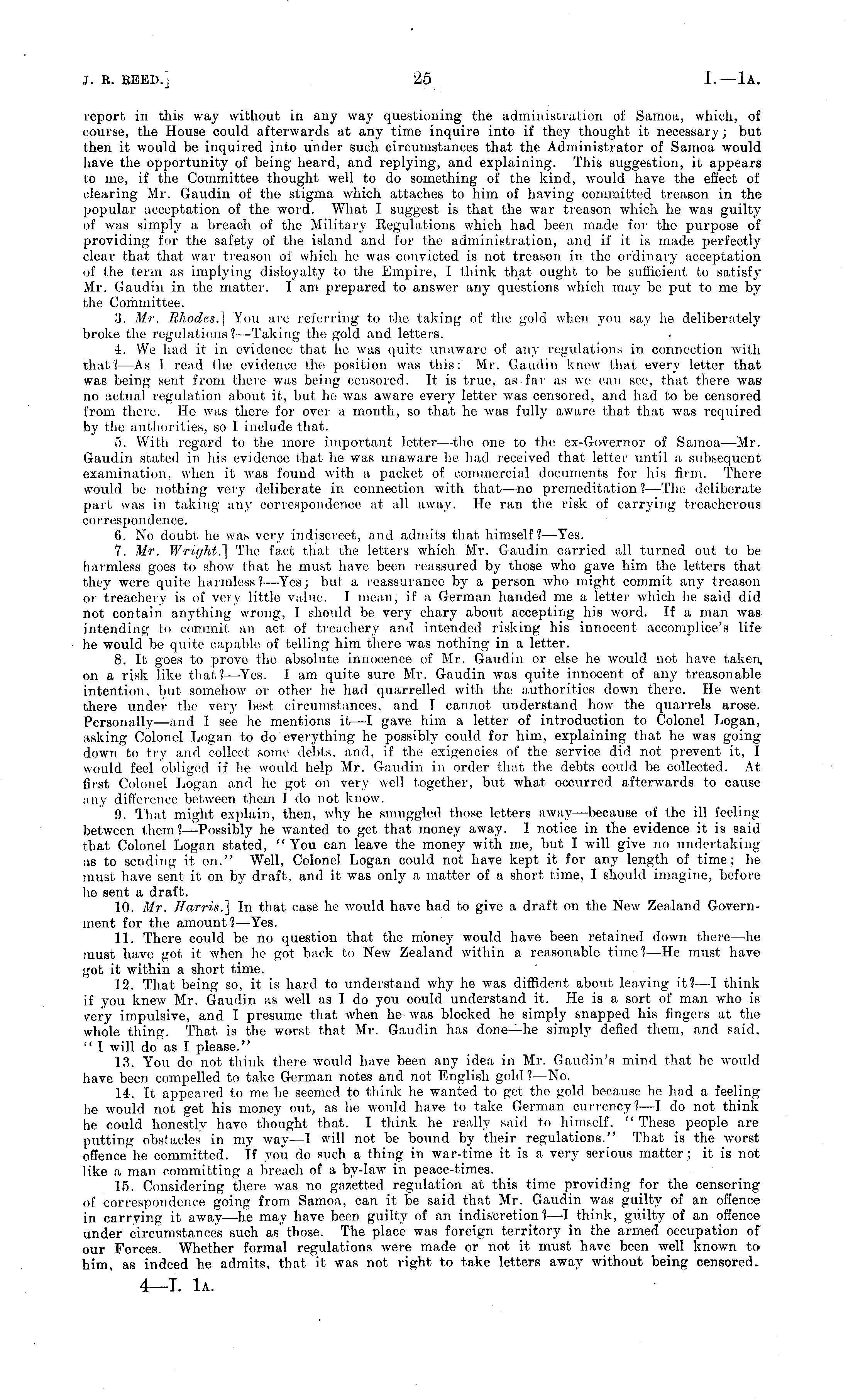 report in this way without in any way questioning the administration of Samoa, which, of course, the House could afterwards at any time inquire into if they thought it necessary; but then it would be inquired into under such circumstances that the Administrator of Samoa would have the opportunity of being heard, and replying, and explaining. This suggestion, it appears to me, if the Committee thought well to do something of the kind, would have the effect of clearing Mr. Gaudin of the stigma which attaches to him of having committed treason in the popular acceptation of the word. What I suggest is that the war treason which he was guilty of was simply a breach of the Military Regulations which had been made for the purpose of providing for the safety of the island and for the administration, and if it is made perfectly clear that that war treason of which he was convicted is not treason in the ordinary acceptation of the term as implying disloyalty to the Empire, I think that ought to be sufficient to satisfy Mr. Gaudin in the matter. lam prepared to answer any questions which may be put to me by the Committee. 3. Mr, Rhodes.] You are referring to the taking of the gold when you say he deliberately broke the regulations?— Taking the gold and letters. 4. We had it in evidence that he was quite unaware of any regulations in connection with that?—As 1 read the evidence the position was this:' Mr. Gaudin knew that every letter that was being sent from there was being censored. It is true, as far as we can see, that there was' no actual regulation about it, but he was aware every letter was censored, and had to be censored from there. He was there for over a month, so that he was fully aware that that was required by the authorities, so I include that. 5. With regard to the more important letter —the one to the ex-Governor of Samoa —Mr. Gaudin stated in his evidence that he was unaware he had received that letter until a subsequent examination, when it was found with a packet of commercial documents for his firm. There would be nothing very deliberate in connection with that—no premeditation ?—The deliberate part was in taking any correspondence at all away. He ran the risk of carrying treacherous correspondence. 6. No doubt, he was very indiscreet, and admits that himself?— Yes. 7. Mr. Wright.] The fact that the letters which Mr. Gaudin carried all turned out to be harmless goes to show that he must have been reassured by those who gave him the letters that they were quite harmless ?—Yes; but a reassurance by a person who might commit any treason or treachery is of very little value. I mean, if a German handed me a letter which he said did not contain anything wrong, I should be very chary about accepting his word. If a man was intending to commit an act of treachery and intended risking his innocent accomplice's life he would be quite capable of telling him there was nothing in a letter. 8. It goes to prove the absolute innocence of Mr. Gaudin or else he would not have taken, on a risk like that?— Yes. I am quite sure Mr. Gaudin was quite innocent of any treasonable intention, but somehow or other he had quarrelled with the authorities down there. He went there under the very best, circumstances, and I cannot understand how the quarrels arose. Personally—and I see he mentions it—l gave him a letter of introduction to Colonel Logan, asking Colonel Logan to do everything he possibly could for him, explaining that ho was goingdown to try and collect some debts, and, if the exigencies of the service did not prevent it, I would feel obliged if he would help Mr. Gaudin in order that the debts could be collected. At first Colonel Logan and he got on very well together, but, what occurred afterwards to cause any difference between them I do not know. 9. That might explain, then, why he smuggled those letters away —because of the ill feeling between them?— Possibly he wanted to get that money away. I notice in the evidence it is said that Colonel Logan stated, "You can leave the money with me, but I will give no undertaking as to sending it on." Well, Colonel Logan could not have kept it for any length of time; he must have sent it on by draft, and it was only a matter of a short time, I should imagine, before he sent a draft. 10. Mr. Harris.] In that case he would have had to give a draft on the New Zealand Government for the amount? —Yes. 11. There could be no question that the money would have been retained down there—he must have got it when he got back to New Zealand within a reasonable time? —He must have got it within a short time. 12. That being so, it is hard to understand why he was diffident about leaving it?—l think if you knew Mr. Gaudin as well as I do you could understand it. He is a sort of man who is very impulsive, and I presume that when he was blocked he simply snapped his fingers at the whole thing. That is the worst that Mr. Gaudin has done—he simply defied them, and said, " I will do as I please." 13. You do not think there would have been any idea in Mr. Gaudin's mind that he would have been compelled to take German notes and not English gold ?—No. 14. It appeared to me he seemed to think he wanted to get the gold, because he had a feeling he would not get his money out, as he would have to take German currency? —I do not think he could honestly have thought that. I think he really said to himself. " These people are putting obstacles in my way —I will not be bound by their regulations." That is the worst offence he committed. If you do such a thing in war-time it is a very serious matter ;it is not like a man committing a. breach of a by-law in peace-times. 15. Considering there was no gazetted regulation at this time providing for the censoring of correspondence going from Samoa, can it be said that Mr. Gaudin was guilty of an offence in carrying it away—he may have been guilty of an indiscretion?—l think, guilty of an offence u
