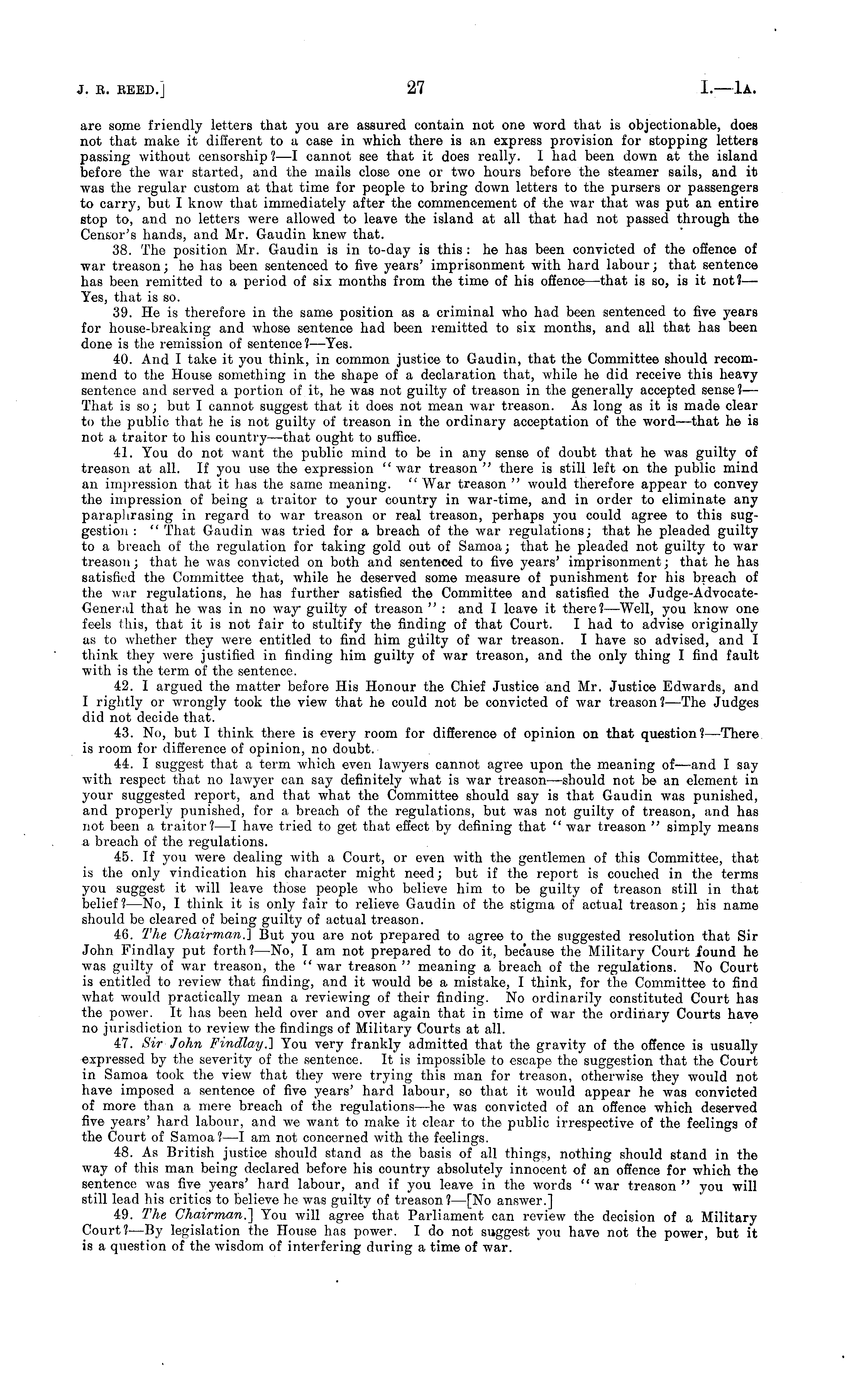 are some friendly letters that you are assured contain not one word that is objectionable, does not that make it different to a case in which there is an express provision for stopping letters passing without censorship ?—I cannot see that it does really. I had been down at the island before the war started, and the mails close one or two hours before the steamer sails, and it was the regular custom at that time for people to bring down letters to the pursers or passengers to carry, but I know that immediately after the commencement of the war that was put an entire stop to, and no letters were allowed to leave the island at all that had not passed through the Censor's hands, and Mr. Gaudin knew that. 38. The position Mr. Gaudin is in to-day is this : he has been convicted of the offence of war treason; he has been sentenced to five years' imprisonment with hard labour; that sentence has been remitted to a period of six months from the time of his offence —that is so, is it not?— Yes, that is so. 39. He is therefore in the same position as a criminal who had been sentenced to five years for house-breaking and whose sentence had been remitted to six months, and all that has been done is the remission of sentence? —Yes. 40. And I take it you think, in common justice to Gaudin, that the Committee should recommend to the House something in the shape of a declaration that, while he did receive this heavy sentence and served a portion of it, he was not guilty of treason in the generally accepted sense ? — That is so; but I cannot suggest that it does not mean war treason. As long as it is made clear to the public that he is not guilty of treason in the ordinary acceptation of the word—that he is not a traitor to his country —that ought to suffice. 41. You do not want the public mind to be in any sense of doubt that he was guilty of treason at all. If you use the expression "war treason" there is still left on the public mind an impression that it has the same meaning. " War treason " would therefore appear to convey the impression of being a traitor to your country in war-time, and in order to eliminate any paraphrasing in regard to war treason or real treason, perhaps you could agree to this suggestion : " That Gaudin was tried for a breach of the war regulations; that he pleaded guilty to a breach of the regulation for taking gold out of Samoa; that he pleaded not guilty to war treason; that he was convicted on both and sentenced to five years' imprisonment; that he has satisfied the Committee that, while he deserved some measure of punishment for his breach of the war regulations, he has further satisfied the Committee and satisfied the Judge-Advocate-General that he was in no way guilty of treason " : and I leave it there? —Well, you know one feels this, that it is not fair to stultify the finding of that Court. I had to advise originally as to whether they were entitled to find him guilty of war treason. I have so advised, and I think they were justified in finding him guilty of war treason, and the only thing I find fault with is the term of the sentence. 42. I argued the matter before His Honour the Chief Justice and Mr. Justice Edwards, and I rightly or wrongly took the view that he could not be convicted of war treason I—The1 —The Judges did not decide that. 43. No, but I think there is every room for difference of opinion on that question?— There is room for difference of opinion, no doubt. 44. I suggest that a term which even lawyers cannot agree upon the meaning of —and I say with respect that no lawyer can say definitely what is war treason —-should not be an element in your suggested report, and that what the Committee should say is that Gaudin was punished, and properly punished, for a breach of the regulations, but was not guilty of treason, and has not been a traitor? —I have tried to get that effect by defining that " war treason " simply means a breach of the regulations. 45. If you were dealing with a Court, or even with the gentlemen of this Committee, that is the only vindication his character might need; but if the report is couched in the terms you suggest it will leave those people who believe him to be guilty of treason still in that belief? —No, I think it is only fair to relieve Gaudin of the stigma of actual treason; his name should be cleared of being guilty of actual treason. 46. The Chairman.] But you are not prepared to agree to the suggested resolution that Sir John Findlay put forth?—No, I am not prepared to do it, because the Military Court found he was guilty of war treason, the " war treason " meaning a breach of the regulations. No Court is entitled to review that finding, and it would be a mistake, I think, for the Committee to find what would practically mean a reviewing of their finding. No ordinarily constituted Court has the power. It has been held over and over again that in time of war the ordinary Courts have no jurisdiction to review the findings of Military Courts at all. 47. Sir John Findlay.] You very frankly admitted that the gravity of the offence is usually expressed by the severity of the sentence. It is impossible to escape the suggestion that the Court in Samoa took the view that they were trying this man for treason, otherwise they would not have imposed a sentence of five years' hard labour, so that it would appear he was convicted of more than a mere breach of the regulations—he was convicted of an offence which deserved five years' hard labour, and we want to make it clear to the public irrespective of the feelings of the Court of Samoa?—l am not concerned with the feelings. 48. As British justice should stand as the basis of all things, nothing should stand in the way of this man being declared before his country absolutely innocent of an offence for which the sentence was five years' hard labour, and if you leave in the words " war treason " you will still lead his critics to believe he was guilt