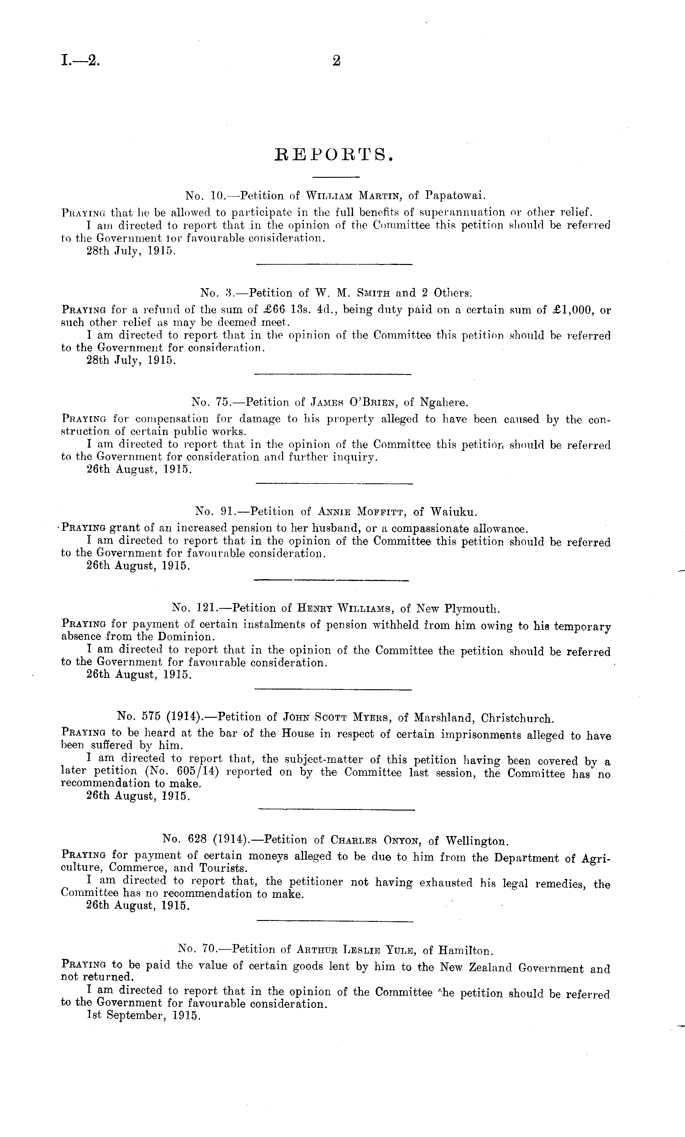 BEPOBTS. No. 10. —Petition of William Martin, of Papatowai. Praying that he be allowed to participate in the full benefits of superannuation or other relief. I am directed to report that in the opinion of the Committee this petition should be referred to the Government tor favourable consideration. 28th July, 1915.