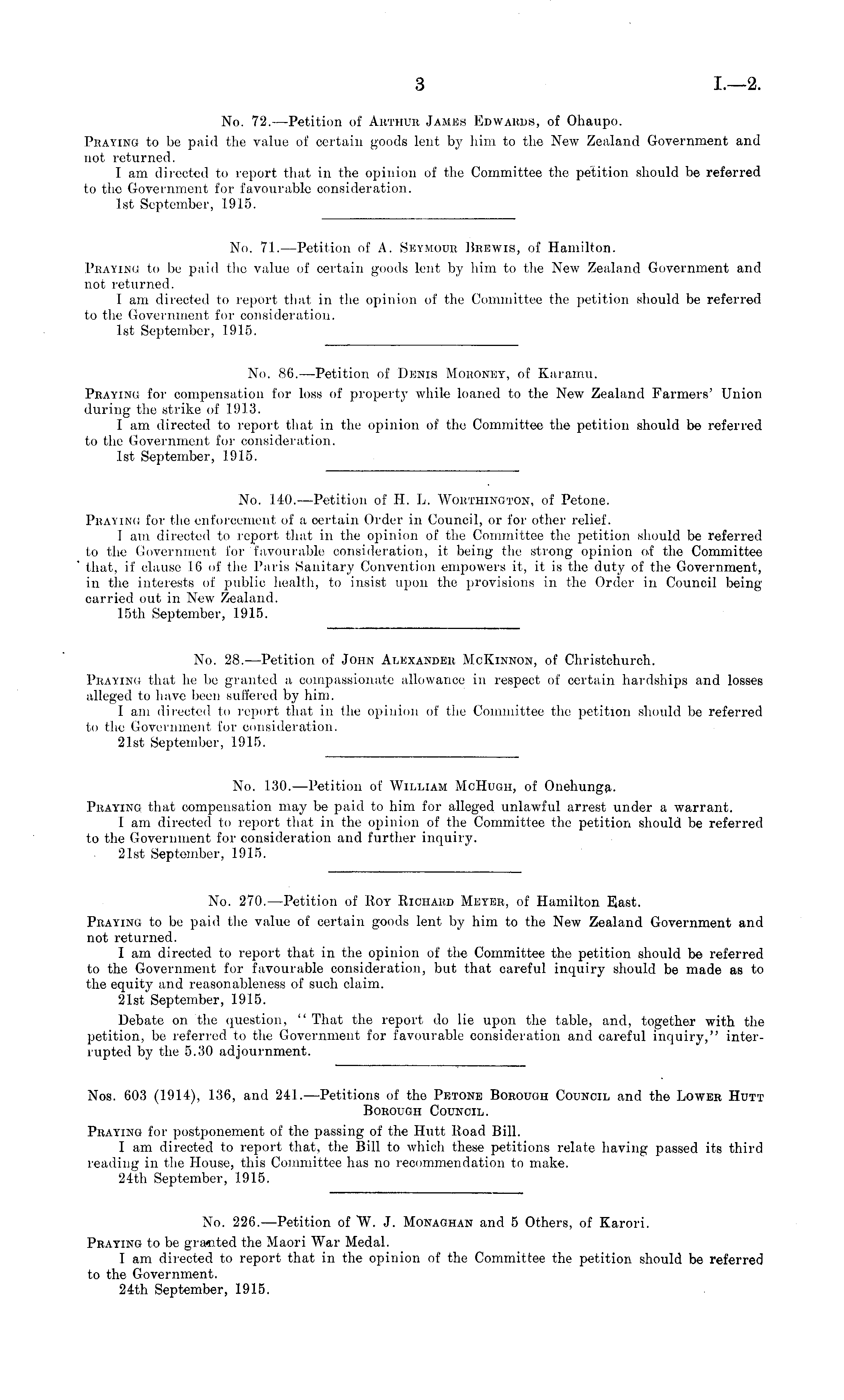 No. 72. —Petition of Arthur James Edwards, of Ohaupo. Praying to be paid the value of certain goods lent by him to the New Zealand Government and not returned. I am directed to report that in the opinion of the Committee the petition should be referred to the Government for favourable consideration. Ist September, 1915.