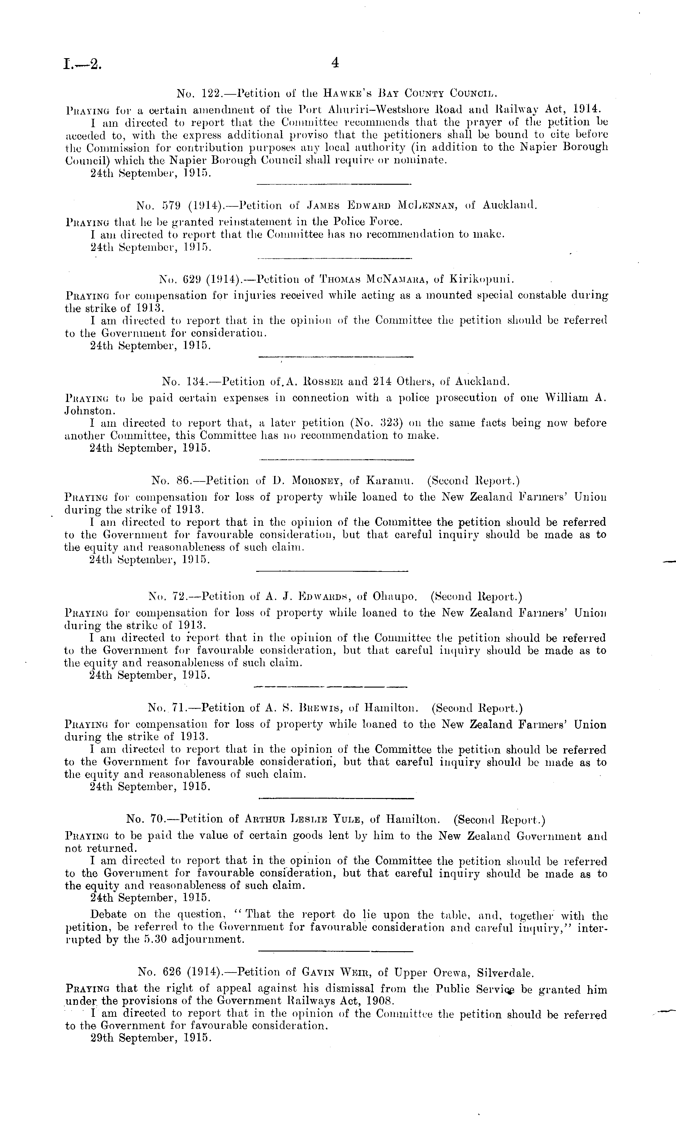 24th September, 1915. No. 72. —Petition of A. J. Edwards, of Ohaupo, (Second Report.) Prating for compensation for loss of property while loaned to the New Zealand Farmers' Union during the strike of 1913. I am directed to report that in the opinion of the Committee the petition should be referred to the Government for favourable consideration, but that careful inquiry should be made as to the equity and reasonableness of such claim. 24tli September, 1.915.