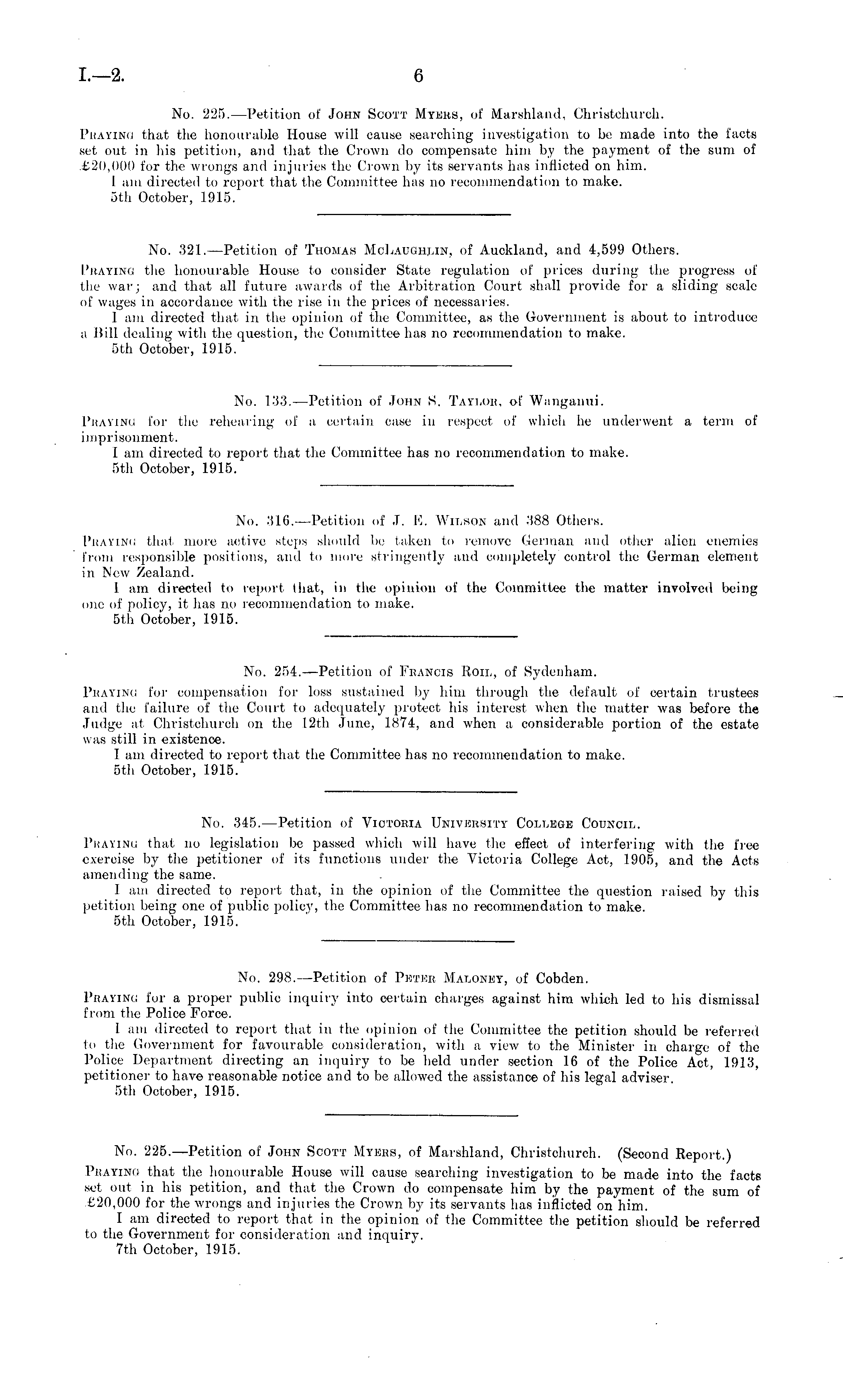 No. 225.—Petition of John Scott Myers, of Marshland, Christchurch. Praying that the honourable House will cause searching investigation to be made into the facts set out in his petition, and that the Crown do compensate him by the payment of the sum of £20,000 for the wrongs and injuries the Crown by its servants has inflicted on him. I am directed to report that the Committee has no recommendation to make. sth October, 1915.