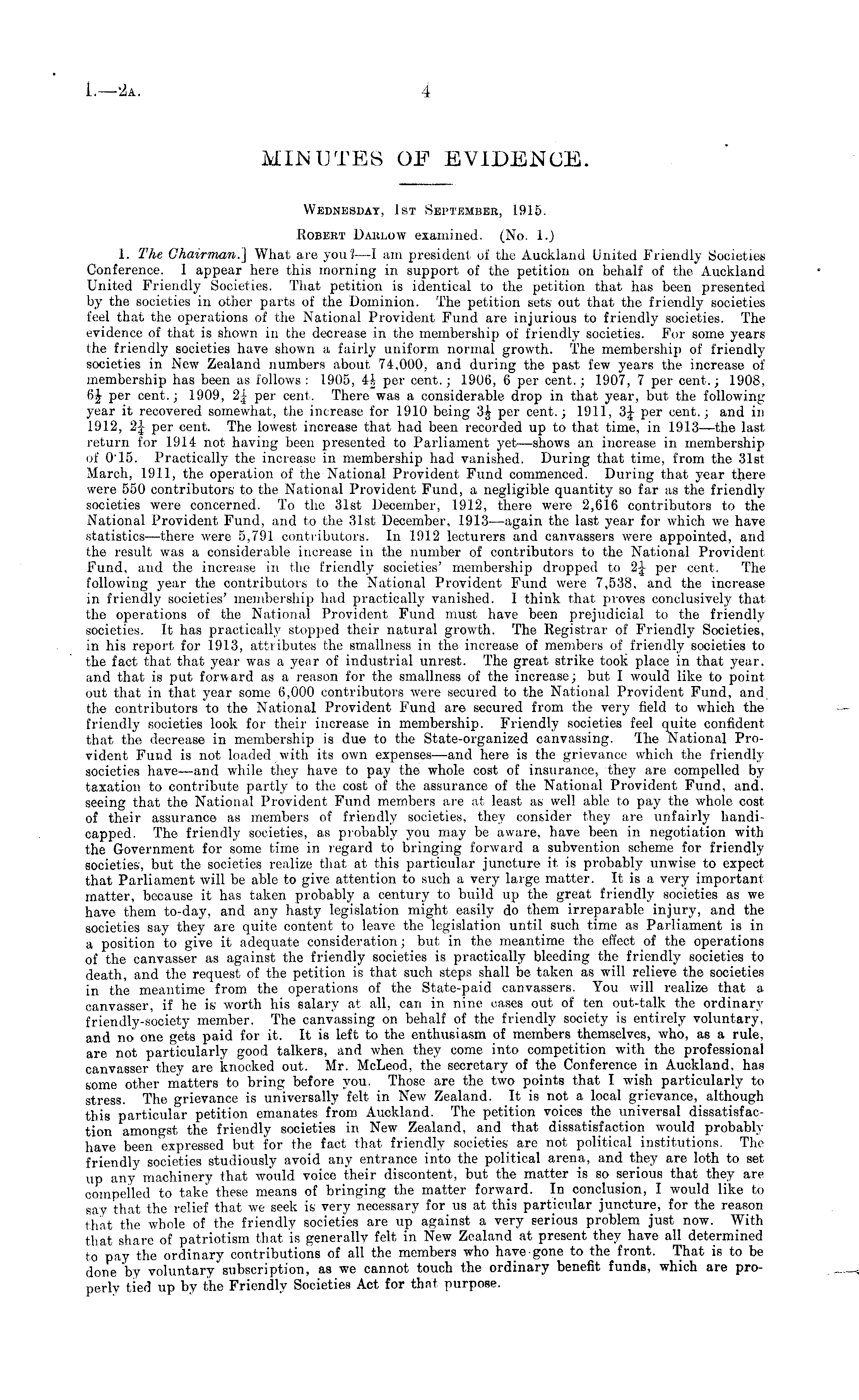 OF EVIDENCE. Wednesday, Ist September, 1915. Robert Darlow examined. (No. 1.) 1. The Chairman.] What are you?—l am president of the Auckland United Friendly Societies Conference. I appear here this morning in support of the petition on behalf of the Auckland United Friendly Societies. That petition is identical to the petition that has been presented by the societies in other parts of the Dominion. The petition sets out that the friendly societies feel that the operations of the National Provident Fund are injurious to friendly societies. The evidence of that is shown in the decrease in the membership of friendly societies. For some years the friendly societies have shown a fairly uniform normal growth. The membership of friendly societies in New Zealand numbers about 74,000, and during the past few years the increase of membership has been as follows : 1905, 44 per cent.; 1906, 6 per cent.; 1907, 7 per cent.; 1908, 6| per cent.; 1909, 2|- per cent. There was a considerable drop in that year, but the following year it recovered somewhat, the increase for 1910 being 3J per cent.; 1911, 3£ per cent.; and in 1912, 2\ per cent. The lowest increase that had been recorded up to that time, in 1913—the last return for 1914 not having been presented to Parliament yet—shows an increase in membership of o'ls. Practically the increase in membership had vanished. During that time, from the 31st March, 1911, the operation of the National Provident Fund commenced. During that year there were 550 contributors' to the National Provident Fund, a negligible quantity so far as the friendly societies were concerned. To the 31st December, 1912, there were 2,616 contributors to the National Provident Fund, and to the 31st December, 1913—again the last year for which we have statistics —there were 5,791 contributors. In 1912 lecturers and canvassers were appointed, and the result was a considerable increase in the number of contributors to the National Provident Fund, and the increase in the friendly societies' membership dropped to 2J per cent. The following year the contributors to the National Provident Fund were 7,538, and the increase in friendly societies' membership had practically vanished. I think that proves conclusively that the operations of the National Provident Fund must have been prejudicial to the friendly societies. It has practically stopped their natural growth. The Registrar of Friendly Societies, in his report for 1913, attributes the smallness in the increase of members of friendly societies to the fact that that year was a year of industrial unrest. The great strike took place in that year, and that is put forward as a reason for the smallness of the increase; but I would like to point out that in that year some 6,000 contributors were secured to the National Provident Fund, and the contributors to the National Provident Fund are secured from the very field to which the friendly societies look for their increase in membership. Friendly societies feel quite confident that the decrease in membership is due to the State-organized canvassing. Ihe National Provident Fund is not loaded with its own expenses—and here is the grievance which the friendly societies have—and while they have to pay the whole cost of insurance, they are compelled by taxation to contribute partly to the cost of the assurance of the National Provident Fund, and. seeing that the National Provident Fund members are at least as well able to pay the whole cost of their assurance as members of friendly societies, they consider they are unfairly handicapped. The friendly societies, as probably you may be aware, have been in negotiation with the Government for some time in regard to bringing forward a subvention scheme for friendlysocieties, but the societies realize that at this particular juncture it is probably unwise to expect that Parliament will be able to give attention to such a very large matter. It is a very important matter, because it has taken probably a century to build up the great friendly societies as we have them to-day, and any hasty legislation might easily do them irreparable injury, and the societies say they are quite content to leave the legislation until such time as Parliament is in a position to give it adequate consideration; but in the meantime the effect of the operations of the canvasser as against the friendly societies is practically bleeding the friendly societies to death, and the request of the petition is that such steps shall be taken as will relieve the societies in the meantime from the operations of the State-paid canvassers. You will realize that a canvasser, if he is worth his salary at all, can in nine cases out of ten out-talk the ordinary friendly-society member. The canvassing on behalf of the friendly society is entirely voluntary, and no one gets paid for it. It is left to the enthusiasm of members themselves, who, as a rule, are not particularly good talkers, and when they come into competition with the professional canvasser they are knocked out. Mr. McLeod, the secretary of the Conference in Auckland, has some other matters to bring before you. Those are the two points that I wish particularly to stress. The grievance is universally felt in New Zealand. It is not a local grievance, although this particular petition emanates from Auckland. The petition voices the universal dissatisfaction amongst the friendly societies in New Zealand, and that dissatisfaction would probably have been expressed but for the fact that friendly societies are not political institutions. The friendly societies studiously avoid any entrance into the political arena, and they are loth to set up any machinery that would voice their discontent, but the matter is so serious that they are compelled to take these means of bringing the matter forward. In conclusion, I would like to say that the relief that we seek is very necessary for us at this particular juncture, for the reason that the 