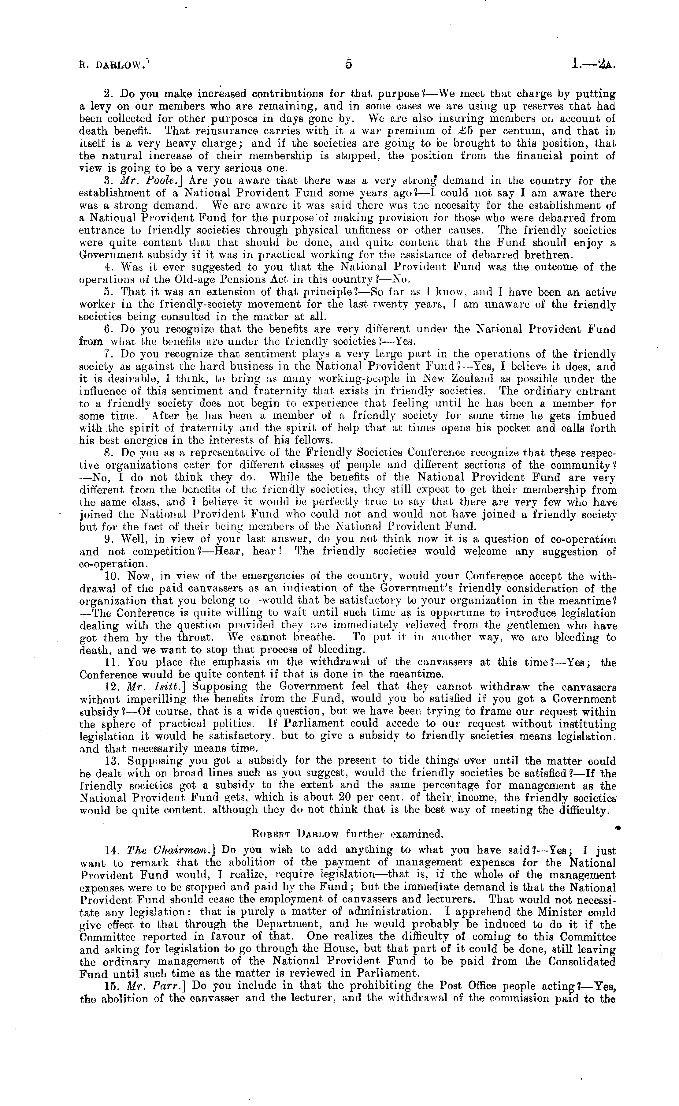2. Do you make increased contributions for that purpose?—We meet that charge by putting a levy on our members who are remaining, and in some cases we are using up reserves that had been collected for other purposes in days gone by. We are also insuring members on account of death benefit. That reinsurance, carries with it a war premium of £h per centum, and that in itself is a very heavy charge; and if the societies are going to be brought to this position, that the natural increase of their membership is stopped, the position from the financial point of view is going to be a very serious one. 3. Mr. Pooled] Are you aware that there was a very strong demand in the country for the establishment of a National Provident Fund some years ago ?—I could not say I am aware there was a strong demand. We are aware it was said there was the necessity for the establishment of a National Provident Fund for the purpose of making provision for those who were debarred from entrance to friendly societies through physical unfitness or other causes. The friendly societies were quite content that that should be done, and quite content that the Fund should enjoy a Government subsidy if it was in practical working for the assistance of debarred brethren. 4. Was it ever suggested to you that the National Provident Fund was the outcome of the operations of the Old-age Pensions Act in this country? —No. 5. That it was an extension of that principle?—So far as 1 know, and I have been an active worker in the friendly-society movement for the last twenty years, 1 am unaware of the friendly societies being consulted, in the matter at all. 6. Do you recognize that the benefits are very different under the National Provident Fund from what the benefits are under the friendly societies? —Yes. 7. Do you recognize that sentiment plays a very large part in the operations of the friendlysociety as against the hard business in the National Provident Fund?—Yes, I believe it does, and it is desirable, I think, to bring as many working-people in New Zealand as possible under the influence of this sentiment and fraternity that exists in friendly societies. The ordinary entrant to a friendly society does not begin to experience that feeling until he has been a member for some time. After he has been a member of a friendly society for some time he gets imbued with the spirit of fraternity and the spirit of help that at times opens his pocket and calls forth his best energies in the interests of his fellows. 8. Do you as a representative of the Friendly Societies Conference recognize that these respective organizations cater for different classes of people and different sections of the community? —No, I do not think they do. While the benefits of the National Provident Fund are very different from the benefits of the friendly societies, they still expect to get their membership from the same class, and I believe it would be perfectly true to say that there are very few who have joined the National Provident Fund who could not and would not have joined a friendly society but for the fact of their being members of the National Provident Fund. 9. Well, in view of your last answer, do you not think now it is a question of co-operation and not competition ? —Hear, hear! The friendly societies would welcome any suggestion of co-operation. 10. Now, in view of the emergencies of the country, would your Conference accept the withdrawal of the paid canvassers as an indication of the Government's friendly consideration of the organization that you belong to —would that be satisfactory to your organization in the meantime? —The Conference is quite willing to wait until such time as is opportune to introduce legislation dealing with the question provided they are immediately relieved from the gentlemen who have got them by the throat. We cannot breathe. To put it in another way, we are bleeding to death, and we want to stop that process of bleeding. 11. You place the emphasis on the withdrawal of the canvassers at this time?—Yes; the Conference would be quite content if that is done in the meantime. 12. Mr. Isitt.] Supposing the Government feel that they cannot withdraw the canvassers without imperilling the benefits from the Fund, would you be satisfied if you got a Government subsidy?—Of course, that is a wide question, but we have been trying to frame our request within the sphere of practical politics. If Parliament, could accede to our request without instituting legislation it would be satisfactory, but to give a subsidy to friendly societies means legislation, and that necessarily means time. 13. Supposing you got a subsidy for the present to tide things over until the matter could be dealt with on broad lines such as you suggest, would the friendly societies be satisfied?—lf the friendly societies got a subsidy to the extent and the same percentage for management as the National Provident Fund gets, which is about 20 per cent, of their, income, the friendly societies would be quite content, although they do not think that is the best way of meeting the difficulty. Robert Darlow further examined. 14. The Chairman.] Do you wish to add anything to what you have said? —Yes; I just want to remark that the abolition of the payment of management expenses for the National Provident Fund would, I realize, require legislation —that is, if the whole of the management expenses were to be stopped and paid by the Fund; but the immediate demand is that the National Provident Fund should cease the employment of canvassers and lecturers. That would not necessitate any legislation: that is purely a matter of administration. I apprehend the Minister could give effect to that through the Department, and he would probably be induced to do it if the Committee reported in favour of that. One realizes the difficulty of coming to this Committee and asking for legislation to go through the House, but that part of it could be done,