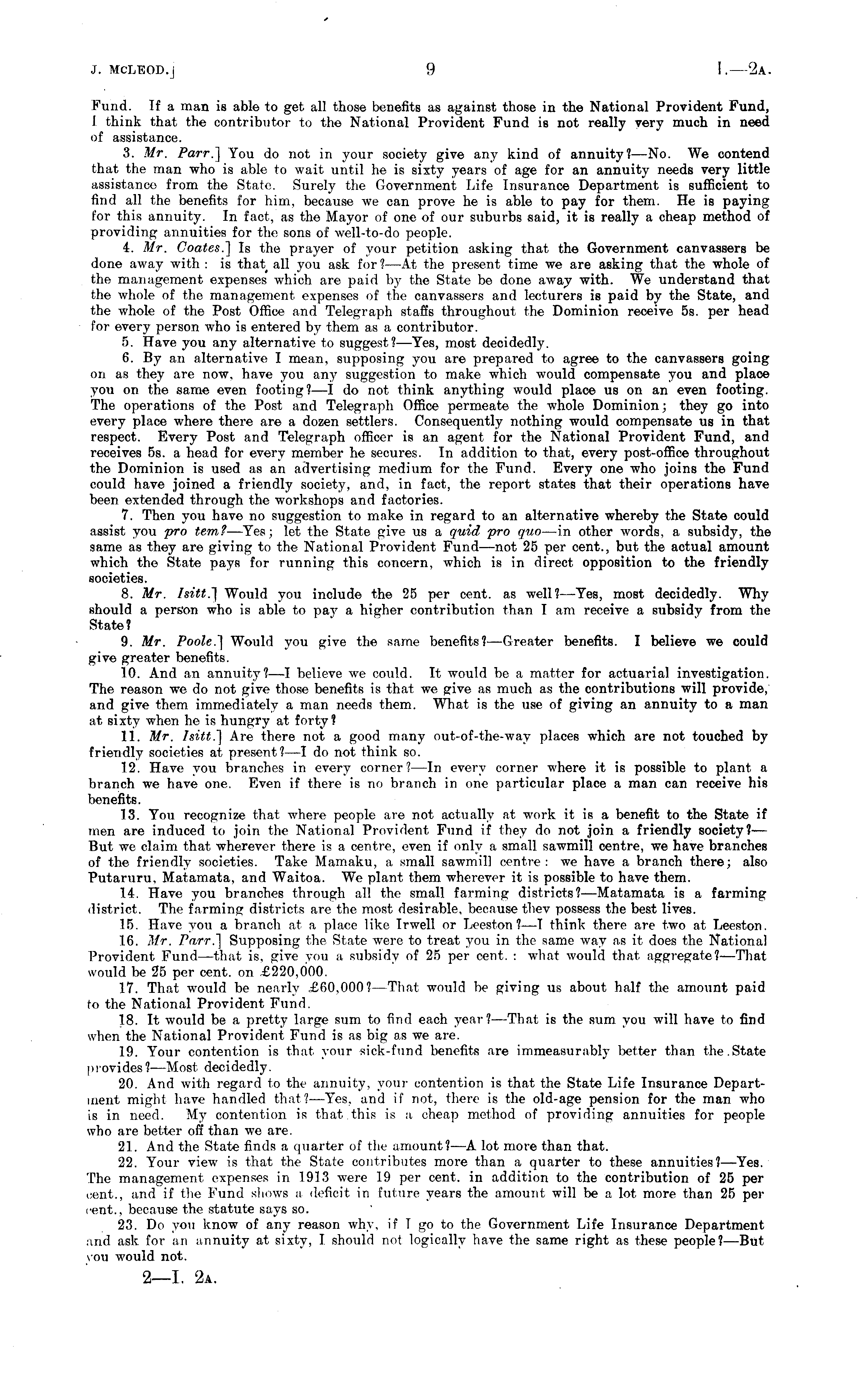 Fund. If a man is able to get all those benefits as against those in the National Provident Fund, I think that the contributor to the National Provident Fund is not really very much in need of assistance. 3. Mr. Parr.] You do not in your society give any kind of annuity?—No. We contend that the man who is able to wait until he is sixty years of age for an annuity needs very little assistance from the State. Surely the Government Life Insurance Department is sufficient to find all the benefits for him, because we can prove he is able to pay for them. He is paying for this annuity. In fact, as the Mayor of one of our suburbs said, it is really a cheap method of providing annuities for the sons of well-to-do people. 4. Mr. Coates.] Is the prayer of your petition asking that the Government canvassers be done away with : is that all you ask for ?—At the present time we are asking that the whole of the management expenses which are paid by the State be done away with. We understand that the whole of the management expenses of the canvassers and lecturers is paid by the State, and the whole of the Post Office and Telegraph staffs throughout the Dominion receive ss. per head for every person who is entered by them as a contributor. 5. Have you any alternative to suggest?—Yes, most decidedly. 6. By an alternative I mean, supposing you are prepared to agree to the canvassers going on as they are now, have you any suggestion to make which would compensate you and place you on the same even footing?—l do not think anything would place us on an even footing. The operations of the Post and Telegraph Office permeate the whole Dominion; they go into every place where there are a dozen settlers. Consequently nothing would compensate us in that respect. Every Post and Telegraph officer is an agent for the National Provident Fund, and receives ss. a head for every member he secures. In addition to that, every post-office throughout the Dominion is used as an advertising medium for the Fund. Every one who joins the Fund could have joined a friendly society, and, in fact, the report states that their operations have been extended through the workshops and factories. 7. Then you have no suggestion to make in regard to an alternative whereby the State could assist you pro tern,? —Yes; let the State give us a quid pro quo —in other words, a subsidy, the same as they are giving to the National Provident Fund —not 25 per cent., but the actual amount which the State pays for running this concern, which is in direct opposition to the friendly societies. 8. Mr. Isitt.] Would you include the 25 per cent, as well?—Yes, most decidedly. Why should a pers'on who is able to pay a higher contribution than I am receive a subsidy from the State? 9. Mr. Poole.] Would you give the same benefits?—Greater benefits. I believe we could give greater benefits. 10. And an annuity?—l believe we could. It would be a matter for actuarial investigation. The reason we do not give those benefits is that we give as much as the contributions will provide, and give them immediately a man needs them. What is the use of giving an annuity to a man at sixty when he is hungry at forty? 11. Mr. Isitt.] Are there not a good many out-of-the-way places which are not touched by friendly societies at present?—l do not think so. 12. Have you branches in every corner? —In every corner where it is possible to plant a branch we have one. Even if there is no branch in one particular place a man can receive his benefits. 13. You recognize that where people are not actually at work it is a benefit to the State if men are induced to join the National Provident Fund if they do not join a friendly society?— But we claim that wherever there is a centre, even if only a small sawmill centre, we have branches of the friendly societies. Take Mamaku, a small sawmill centre: we have a branch there; also Putaruru, Matamata, and Waitoa. We plant them wherever it is possible to have them. 14. Have you branches through all the small farming districts?—Matamata is a farming district. The farming districts are the most desirable, because they possess the best lives. 15. Have you a branch at a place like Irwell or Leeston ?—T think there are two at Leeston. 16. Mr. Parr.] Supposing the State were to treat you in the same way as it does the National Provident Fund —that is, give you a subsidv of 25 per cent. : what would that aggregate?—That would be 25 per cent, on £220,000. 17. That would be nearly £60,000? —That would be giving us about half the amount paid to the National Provident Fund. 18. It would be a pretty large sum to find each year? —That is the sum you will have to find when the National Provident Fund is as big as we are. 19. Your contention is that your sick-fund benefits are immeasurably better than the.State provides?—Most decidedly. 20. And with regard to the annuity, your contention is that the State Life Insurance Department might have handled that? —Yes, and if not, there is the old-age pension for the man who is in need. My contention is that.this is a cheap method of providing annuities for people who are better off than we are. 21. And the State finds a quarter of the amount? —A lot more than that. 22. Your view is that the State contributes more than a quarter to these annuities?—Yes. The management expenses in 1913 were 19 per cent, in addition to the contribution of 25 per cent., and if the Fund shows a deficit in future years the amount will be a lot more than 25 per cent., because the statute says so. 23. Do you know of any reason why, if I go to the Government Life Insurance Department and ask for an annuity at sixty, I. should not logically have the same right as these people?—But vou would not.
