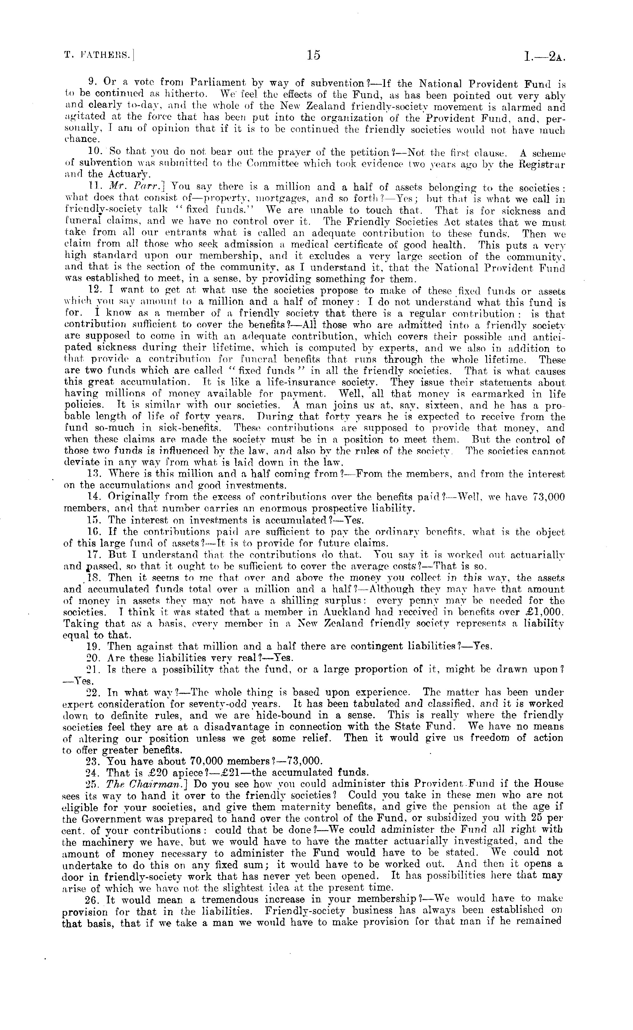 9. Or a vote from Parliament by way of subvention?—lf the National Provident Fund is to be continued as hitherto. We i'eel the effects of the Fund, as has been pointed out very ably and clearly to-day, and the whole of the New Zealand friendly-society movement is alarmed anil agitated at the force that has been put into the organization of the Provident Fund, and, personally, T am of opinion that if it is to be continued the friendly societies would not have much chance. 10. So that you do not bear out the prayer of the petition?—Not the first clause. A scheme of subvention was submitted to the Committee which took evidence two years ago by the Registrar and the Actuary. 11. Mr. Parr.] You say there is a million and a half of assets belonging to the societies : what does that consist of—property, mortgages, and so forth?—Yes; but that is what we call in frieudly-society talk "fixed funds." We are unable to touch that. That is for sickness and funeral claims, and we have no control over it. The Friendly Societies Act states that we must take from all our entrants what is called an adequate contribution to these funds'. Then we claim from all those who seek admission a medical certificate of good health. This puts a very high standard upon our membership, and it excludes a very large section of the community, and that is the section of the community, as I understand it, that the National Provident Fund was established to meet, in a sense, by providing something for them. 12. I want to get at what use the societies propose to make of these fixed funds or assets which you say amount to a million and a half of money: I do not understand what this fund is for. I know as a member of a. friendly society that there is a regular contribution :is that contribution sufficient to cover the benefits?—All those who are admitted into a friendly societyare supposed to come in with an adequate contribution, which covers their possible and anticipated sickness during their lifetime, which is computed by experts, and we also in addition to that provide a contribution for funeral benefits that runs through the whole lifetime. These are two funds which are called " fixed funds " in all the friendly societies. That is what causes this great accumulation. It, is like a life-insurance society. They issue their statements about having millions of money available for payment. Well, all that money is earmarked in life policies. Tt is similar with our societies. A man joins us at, say, sixteen, and he has a probable length of life of forty years. During that forty years he is expected to receive from the fund so-much in sick-benefits. These contributions are supposed to provide that money, and when these claims arc made the society must be in a position to meet them. But the control of those two funds is influenced by the law, and also by the rules of the society The societies cannot deviate in any way from what is laid down in the law. 13. Where is this million and a half coming from?—From the members, and from the interest on the accumulations and good investments. 14. Originally from the excess of contributions over the benefits paid?—Well, we have 73,000 members, and that number carries an enormous prospective liability. 15. The interest on investments is accumulated? —Yes. 10. If the contributions paid are sufficient to pay the ordinary benefits, what is the object of this large fund of assets?—Tt is to provide for future claims. 17. But I understand that the contributions do that. You say it is worked out actuarially and passed, so that it ought to be sufficient to cover the average costs?—That is so. 18. Then it seems to me that over and above the money you collect in this way, the assets and accumulated funds total over a million and a half? —Although they may have that amount of money in assets they may not have a shilling surplus: every penny may be needed for the societies. I think it, was stated that a member in Auckland had received in benefits over £1,000. Taking that as a basis, every member in a New Zealand friendly society represents a liability equal to that. 19. Then against that million and a half there are contingent liabilities?—Yes. 20. Are these liabilities very real?—Yes. 21. Is there a possibility that the fund, or a large proportion of it, might be drawn upon ? —Yes. 22. In what way?—The whole thing is based upon experience. The matter has been under expert consideration for seventy-odd years. It has been tabulated and classified, and it is worked down to definite rules, and we are hide-bound in a sense. This is really where the friendly societies feel they are at a disadvantage in connection with the State Fund. We have no means of altering our position unless we get some relief. Then it would give us freedom of action to offer greater benefits. 23. You have about 70,000 members?—73,ooo. 24. That is £20 apiece?—£2l—the accumulated funds. 25. The Chairman.] Do you see how you could administer this Provident.Fund if the House sees its way to hand it over to the friendly societies? Could you take in these men who are not eligible for your societies, and give them maternity benefits, and give the pension at the age if the Government was prepared to hand over the control of the Fund, or subsidized you with 25 per cent, of your contributions: could that be done?—We could administer the Fund all right with the machinery we have, but we would have to have the matter actuarially investigated, and the amount of money necessary to administer the Fund would have to be stated. We could not undertake to do this on any fixed sum; it would have to be worked out. And then it opens a door in friendly-society work that has never yet been opened. It has possibilities here that may arise of which we have not the slightest idea at the present time. 26. It would mean a tremendous increase in your membership?—We would have to make provision for that in the liabilities. 