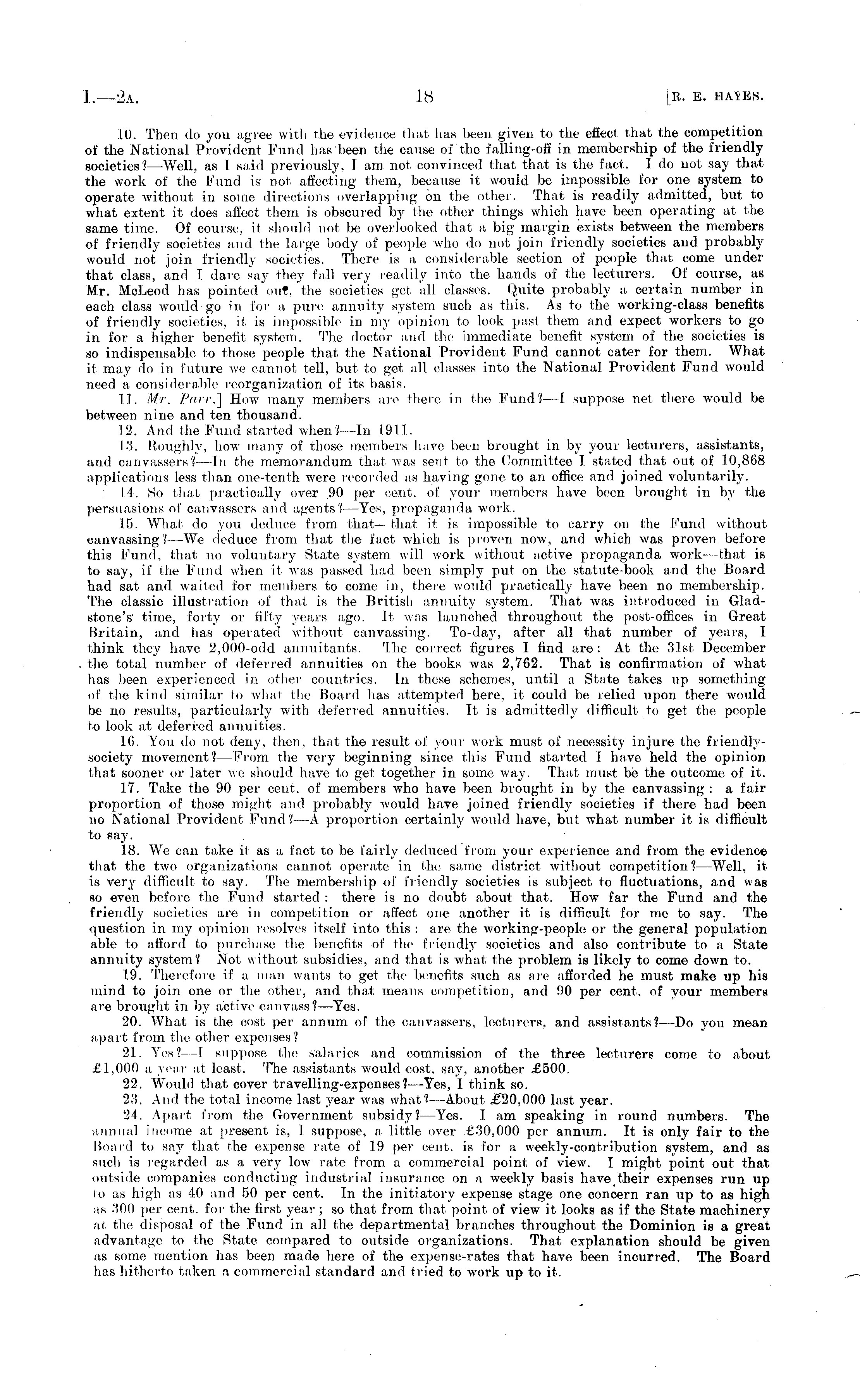 10. Then do you agree with the evidence that has been given to the effect that the competition of the National Provident. Fund has been the cause of the falling-off in membership of the friendly societies? —Well, as I said previously, lam not convinced that that is the fact. Ido not say that the work of the Fund is not, affecting them, because it would be impossible for one system to operate without in some directions overlapping on the other. That is readily admitted, but to what extent it does affect them is obscured by the other things which have been operating at the same time. Of course, it should not be overlooked that a big margin exists between the members of friendly societies and the large body of people who do not join friendly societies and probably would not join friendly societies. There is a considerable section of people that come under that class, and I dare say they fall very readily into the hands of the lecturers. Of course, as Mr. McLeod has pointed out, the societies get all classes. Quite probably a certain number in each class would go in for a pure annuity system such as this. As to the working-class benefits of friendly societies, it, is impossible in my opinion to look past them and expect workers to go in for a higher benefit system. The doctor and the immediate benefit system of the societies is so indispensable to those people that the National Provident Fund cannot cater for them. What it may do in future we cannot tell, but to get all classes into the National Provident Fund would need a considerable reorganization of its basis. 11. Mr. Parr.] How many members are there in the Fund? —I suppose net there would be between nine and ten thousand. 12. And the Fund started when?—ln 191.1. 13. Roughly, how many of those members have been brought in by your lecturers, assistants, and canvassers? —In the memorandum that was sent, to the Committee I stated that out of 10,868 applications less than one-tenth were recorded as having gone to an office and joined voluntarily. 14. So that practically over .90 per cent, of your members have been brought in by the persuasions of canvassers and agents?—Yes, propaganda work. 1.5. What do you deduce from that—that it, is impossible to carry on the Fund without canvassing? —We deduce from that the fact which is proven now, and which was proven before this Fund, that no voluntary State system will work without active propaganda work —that is to say, if the Fund when it was passed had been simply put on the statute-book and the Board had sat and waited for members to come in, there would practically have been no membership. The classic illustration of that is the British annuity system. That was introduced in Gladstone's' time, forty or fifty years ago. It was launched throughout the post-offices in Great Britain, and has operated without canvassing. To-day, after all that number of years, I think they have 2,000-odd annuitants. Ihe correct figures I find are: At the 31st December the total number of deferred annuities on the books was 2,762. That is confirmation of what has been experienced in other countries. In these schemes, until a State takes up something of the kind similar to what the Board has attempted here, it could be relied upon there would be no results, particularly with deferred annuities. It is admittedly difficult to get the people to look at deferred annuities. 16. You do not deny, then, that the result of your work must of necessity injure the friendlysociety movement? —From the very beginning since this Fund started I have held the opinion that sooner or later we should have to get together in some way. That must be the outcome of it. 17. Take the 90 per cent, of members who have been brought in by the canvassing : a fair proportion of those might and probably would have joined friendly societies if there had been no National Provident Fund?—A proportion certainty would have, but what number it is difficult to say. 18. We can take it as a fact to be fairly deduced from your experience and from the evidence that the two organizations cannot operate in the same district without, competition? —Well, it is very difficult to say. The membership of friendly societies is subject to fluctuations, and was so even before the Fund started : there is no doubt about that. How far the Fund and the friendly societies are in competition or affect one another it is difficult for me to say. The question in my opinion resolves itself into this : are the working-people or the general population able to afford to purchase the benefits of the friendly societies and also contribute to a State annuity system? Not without, subsidies, and that is what the problem is likely to come down to. 19. Therefore if a man wants to get the benefits such as are afforded he must make up his mind to join one or the other, and that means competition, and 90 per cent, of your members are brought in by active canvass?—Yes. 20. What is the cost per annum of the canvassers, lecturers, and assistants?—Do you mean apart from the. other expenses? 21. Yes? —1 suppose the salaries and commission of the three lecturers come to about £1,000 a year at least. The assistants would cost, say, another £500. 22. Would that cover travelling-expenses?—Yes, I think so. 23. And the total income last year was what?—About £"20,000 last year. 24. Apart from the Government subsidy? —Yes. I am speaking in round numbers. The annual income at present is, I suppose, a little over £30,000 per annum. It is only fair to the Board to say that the expense rate of 19 per cent, is for a weekly-contribution system, and as such is regarded as a very low rate from a commercial point of view. I might point out that outside companies conducting industrial insurance on a weekly basis have/their expenses run up to as high as 40 and 50 per cent. In the initiatory expense stage one concern ran up to as high as 300 per cent, for the first year ; so that fr