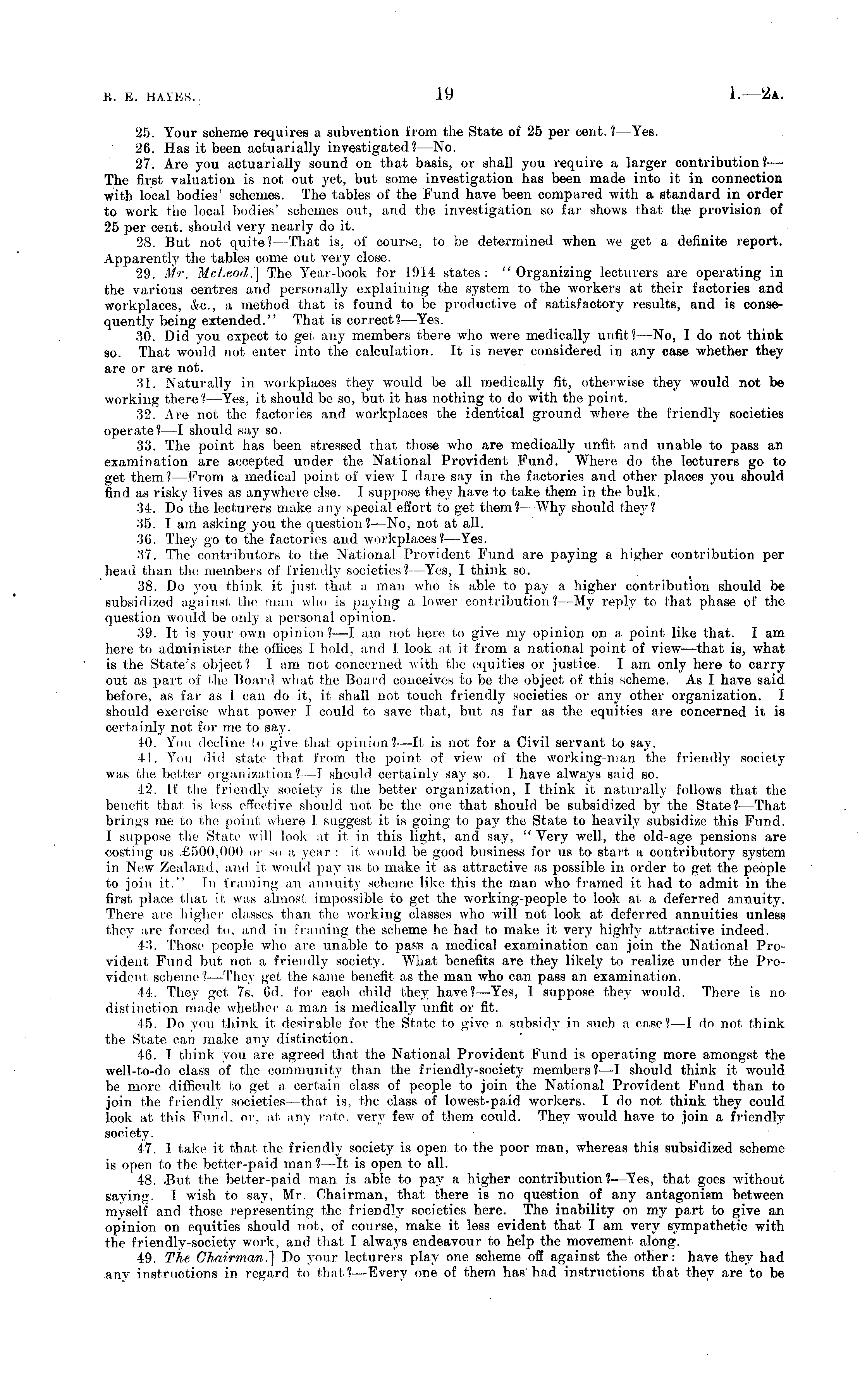 25. Your scheme requires a subvention from the State of 25 per cent. ?—Yes. 26. Has it been actuarially investigated? —No. 27. Are you actuarially sound on that basis, or shall you require a larger contribution? —• The first valuation is not out yet, but some investigation has been made into it in connection with local bodies' schemes. The tables of the Fund have been compared with a standard in order to work the local bodies' schemes out, and the investigation so far shows that the provision of 25 per cent, should very nearly do it. 28. But not quite? —That is, of course, to be determined when we get a definite report. Apparently the tables come out very close. 29. Mr. McLeod.] The Year-book for 1.914 states : " Organizing lecturers are operating in the various centres and personally explaining the system to the workers at their factories and workplaces, &c, a method that is found to be productive of satisfactory results, and is consequently being extended." That is correct? —Yes. 30. Did you expect to get any members there who were medically unfit? —No, I do not think so. That would not enter into the calculation. It is never considered in any case whether they are or are not. 31. Naturally in workplaces they would be all medically fit, otherwise they would not be working there?—Yes, it should be so, but it has nothing to do with the point. 32. Are not the factories and workplaces the identical ground where the friendly societies operate? —I should say so. 33. The point has been stressed that those who are medically unfit, and unable to pass an examination are accepted under the National Provident Fund. Where do the lecturers go to get them?—From a medical point of view I dare say in the factories and other places you should find as risky lives as anywhere else. I suppose they have to take them, in the bulk. 34. Do the lecturers make any special effort to get them? —Why should they? 35. I am asking you the question ?—No, not at all. 36. They go to the factories and workplaces? —Yes. 37. The contributors to the National Provident Fund are paying a higher contribution per head than the members of friendly societies? —Yes, I think so. 38. Do you think it just, that a man who is able to pay a higher contribution should be subsidized against the man who is paying a lower contribution? —My reply to that phase of the question would be only a personal opinion. 39. It is your own opinion?—l am not here to give my opinion on a point like that. I am here to administer the offices I hold, and I look at, it from a national point of view—that is, what is the State's object? I am not concerned with the equities or justice. I am only here to carry out as part of the Board what the Board conceives to be the object of this scheme. As I have said before, as far as I can do it, it shall not touch friendly societies or any other organization. I should exercise what power I could to save that, but as far as the equities are concerned it is certainly not for me to say. 40. You decline to give that opinion?—lt is not for a Civil servant to say. 41. You did state that from the point of view of the working-man the friendly society was the better organization?—l should certainly say so. I have always said so. 42. If the friendly society is the better organization, I think it naturally follows that the benefit that is less effective should not be the one that, should be subsidized by the State?—That brings me to the point where I suggest, it is going to pay the State to heavily subsidize this Fund. I suppose the State will look at it. in this light, and say, "Very well, the old-age pensions are costing us £500.000 or so a year : it would be good business for us to start a contributory system in New Zealand, and it would pay us to make it as attractive as possible in order to get the people to join it." In framing an annuity scheme like this the man who framed it had to admit in the first place that it was almost impossible to get the working-people to look, at a deferred annuity. There are higher classes than the working classes who will not look at deferred annuities unless they are forced to, and in framing the scheme he had to make it very highly attractive indeed. 43. Those people who are unable to pass a medical examination can join the National Provident Fund but not a friendly society. What benefits are they likely to realize under the Provident scheme? —They get the same benefit as the man who can pass an examination. 44. They get 7s. 6d. for each child they have? —-Yes, I suppose they would. There is no distinction made whether a man is medically unfit or fit. 45. Do you think it desirable for the State to give a subsidy in such a case?—l do not think the State can make any distinction. 46. I think you are agreed that the National Provident Fund is operating more amongst the well-to-do class of the community than the friendly-society members ? —I should think it, would be more difficult to get a certain class of people to join the National Provident Fund than to join the friendly societies—that is, the class of lowest-paid workers. I do not, think they could look at this Fund, or, at, any rate, very few of them could. They would have to join a friendly society. 47. I take it that, the friendly society is open to the poor man, whereas this subsidized scheme is open to the better-paid man ? —lt is open to all. 48. But the better-paid man is able to pay a higher contribution ?—Yes, that goes without saying. I wish to say, Mr. Chairman, that there is no question of any antagonism between myself and those representing the friendly societies here. The inability on my part to give an opinion on equities should not, of course, make it less evident that I am very sympathetic with the friendly-society work, and that I always endeavour to help the movement along. 49. The Chairman.] Do your lecturers play one scheme off against the other: have they had :any inst