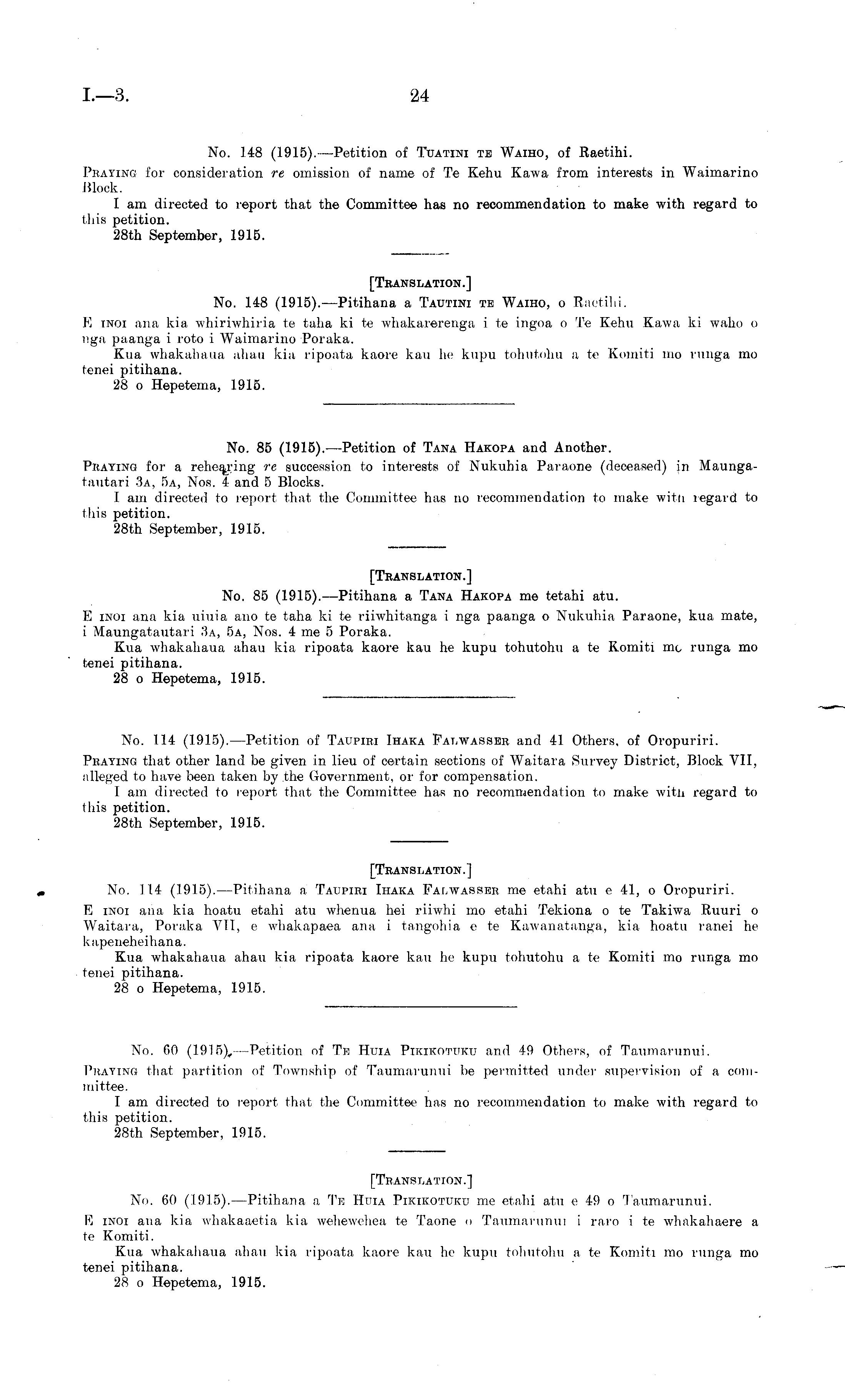 [Translation.] „ No. 114 (1915). —Pitihana a Taupiri Ihaka Falwasser me etahi atu c 41, o Oropuriri. E inoi ana kia hoatu etahi atu whenua hei riiwhi mo etahi Tekiona o te Takiwa Ruuri o Waitara, Poraka VII, c whakapaea ana i tangohia c to Kawanatanga, kia hoatu ranei he kapeneheihana. Kua whakahaua ahau kia ripoata kaore kau he kupu tohutohu a te Komiti mo runga mo tenei pitihana. 28 o Hepetema, 1915.