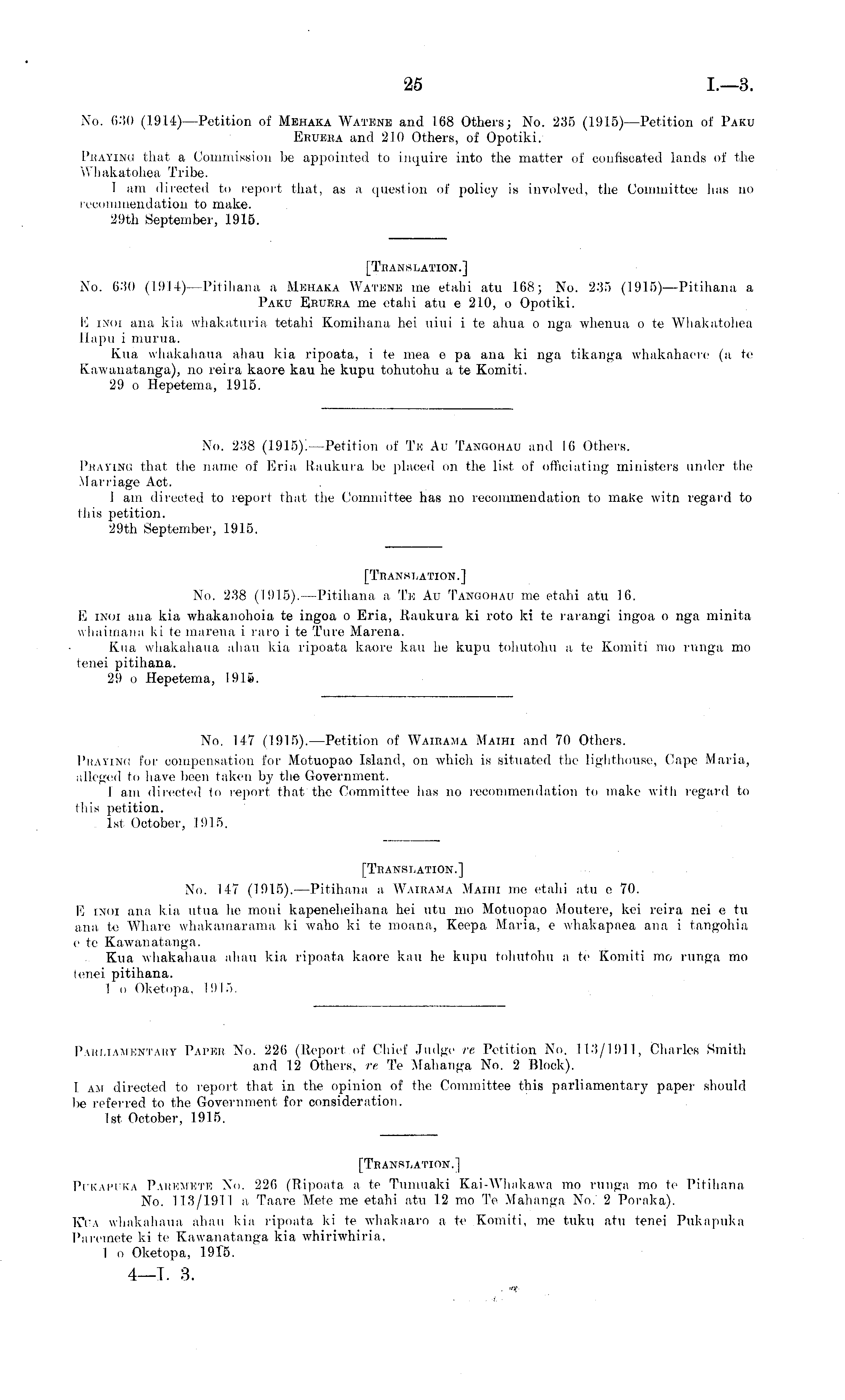 [Translation.] No. 147 (1915). —Pitihana a Wairama Maihi me etahi atu c 70. E INOI ana kia utua he moni kapeneheihana hei utu mo Motuopao Moutere, kei reira nei c tv ana te Wharc whakamarama ki waho kite moana, Keepa .Maria, c whakapaea ana i tangohia c te Kawanatanga. Kua whakahaua ahau kia ripoata kaore kau he kupu tohutohu a te Komiti mi, runga mo tenei pitihana. 1 o Oketopa, 1915.