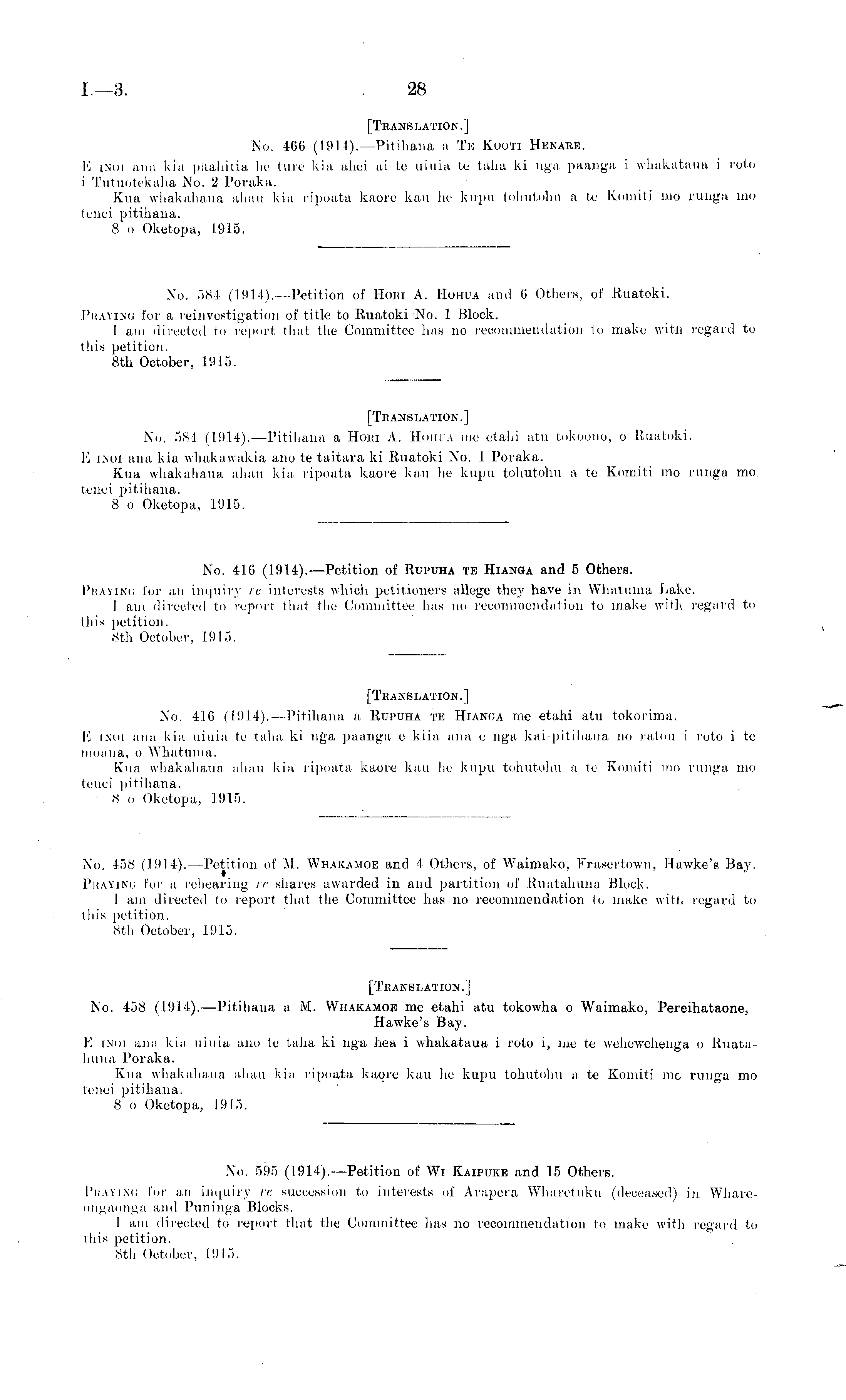 [Translation.] No. 584 (1914). —Pitihana a Hori A. Hohua me etahi atu tokoono, o Ruatoki. E inoi ana kia whakawakia ano te taitara ki Ruatoki No. 1 Poraka. Kua whakahaua, ahau kia ripoata, kaore kau In- kupu tohutohu a te Komiti mo runga, mo tenei pitihana. 8 o Oketopa, 1915.