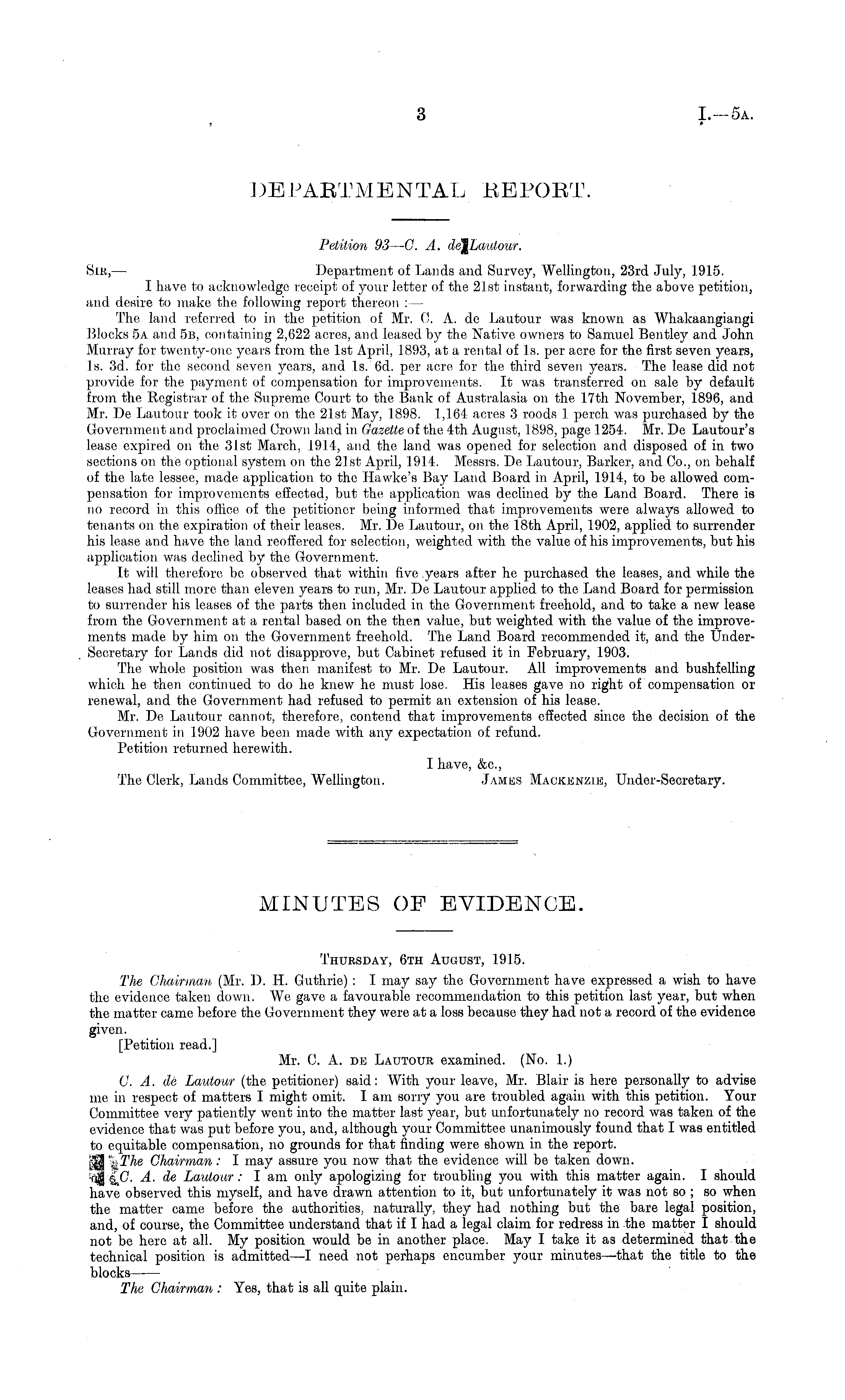 MINUTES OF EVIDENCE. Thursday, 6th August, 1915. The Chairman (Mr. D. H. Guthrie) : I may say the Government have expressed a wish to have the evidence taken down. We gave a favourable recommendation to this petition last year, but when the matter came before the Government they were at a loss because they had not a record of the evidence given. [Petition read.] Mr. C. A. de Lautour examined. (No. 1.) G. A. de Lautour (the petitioner) said: With your leave, Mr. Blair is here personally to advise me in respect of matters I might omit. lam sorry you are troubled again with this petition. Your Committee very patiently wont into the matter last year, but unfortunately no record was taken of the evidence that was put before you, and, although your Committee unanimously found that I was entitled to equitable compensation, no grounds for that finding were shown in the report. 'iM'siThe Chairman: I may assure you now that the evidence will be taken down. <i| IC. A. de Lautour : I am only apologizing for troubling you with this matter again. I should have observed this myself, and have drawn attention to it, but unfortunately it was not so ; so when the matter came before the authorities, naturally, they had nothing but the bare legal position, and, of course, the Committee understand that if I had a legal claim for redress in the matter I should not be here at all. My position would be in another place. May I take it as determined that the technical position is admitted—l need not perhaps encumber your minutes—-that the title to the blocks The Chairman : Yes, that is all quite plain.