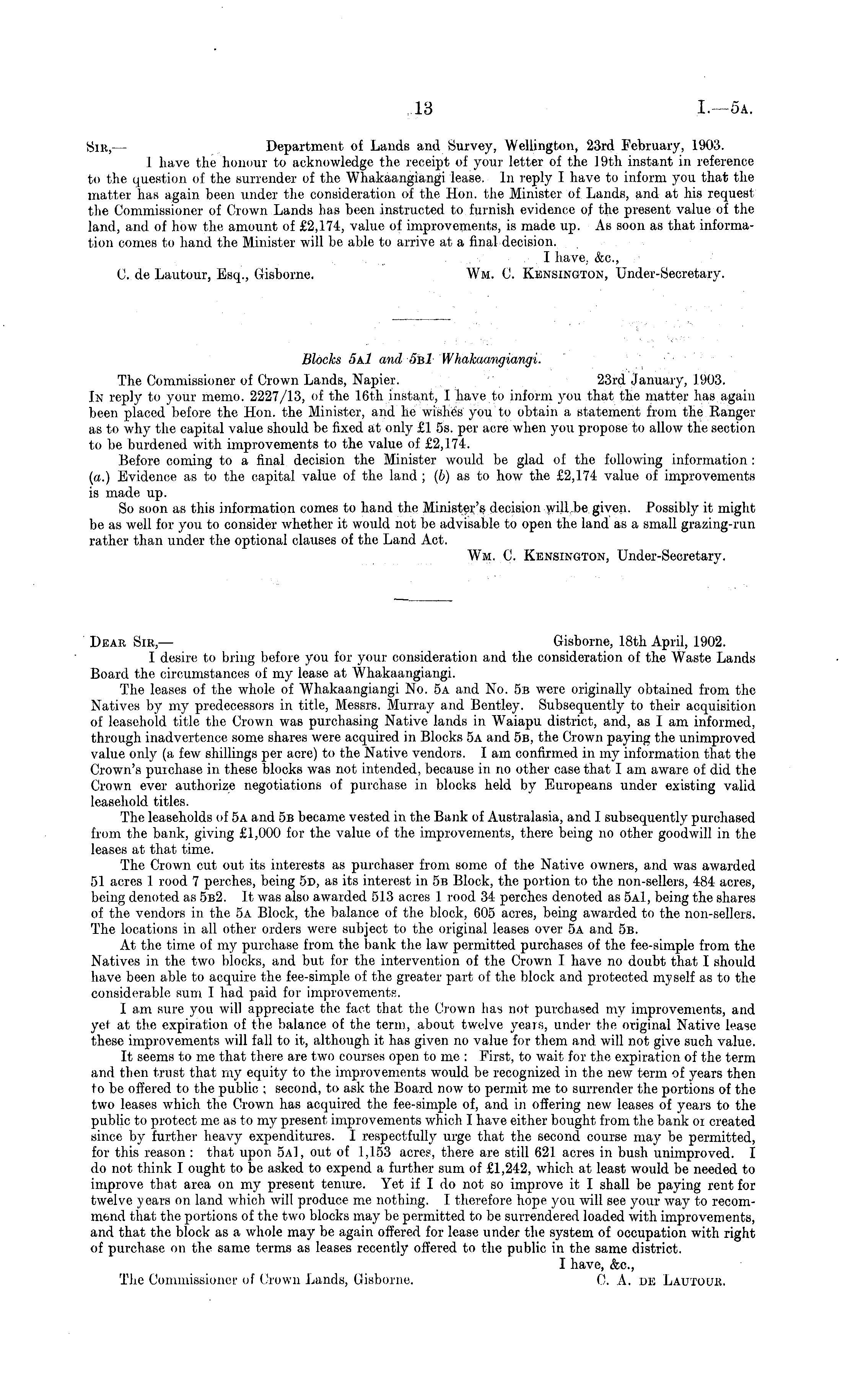 Sir, — Department of Lands and Survey, Wellington, 23rd February, 1903. I have the honour to acknowledge the receipt of your letter of the J9th instant in reference to the question of the surrender of the Whakaangiangi lease. In reply I have to inform you that the matter has again been under the consideration of the Hon. the Minister of Lands, and at his request the Commissioner of Crown Lands has been instructed to furnish evidence of the present value of the land, and of how the amount of £2,174, value of improvements, is made up. As soon as that information comes to hand the Minister will be able to arrive at a final decision. I have, &c, C. de Lautour, Esq., Gisborne. Wm. C. Kensington, Under-Secretary.