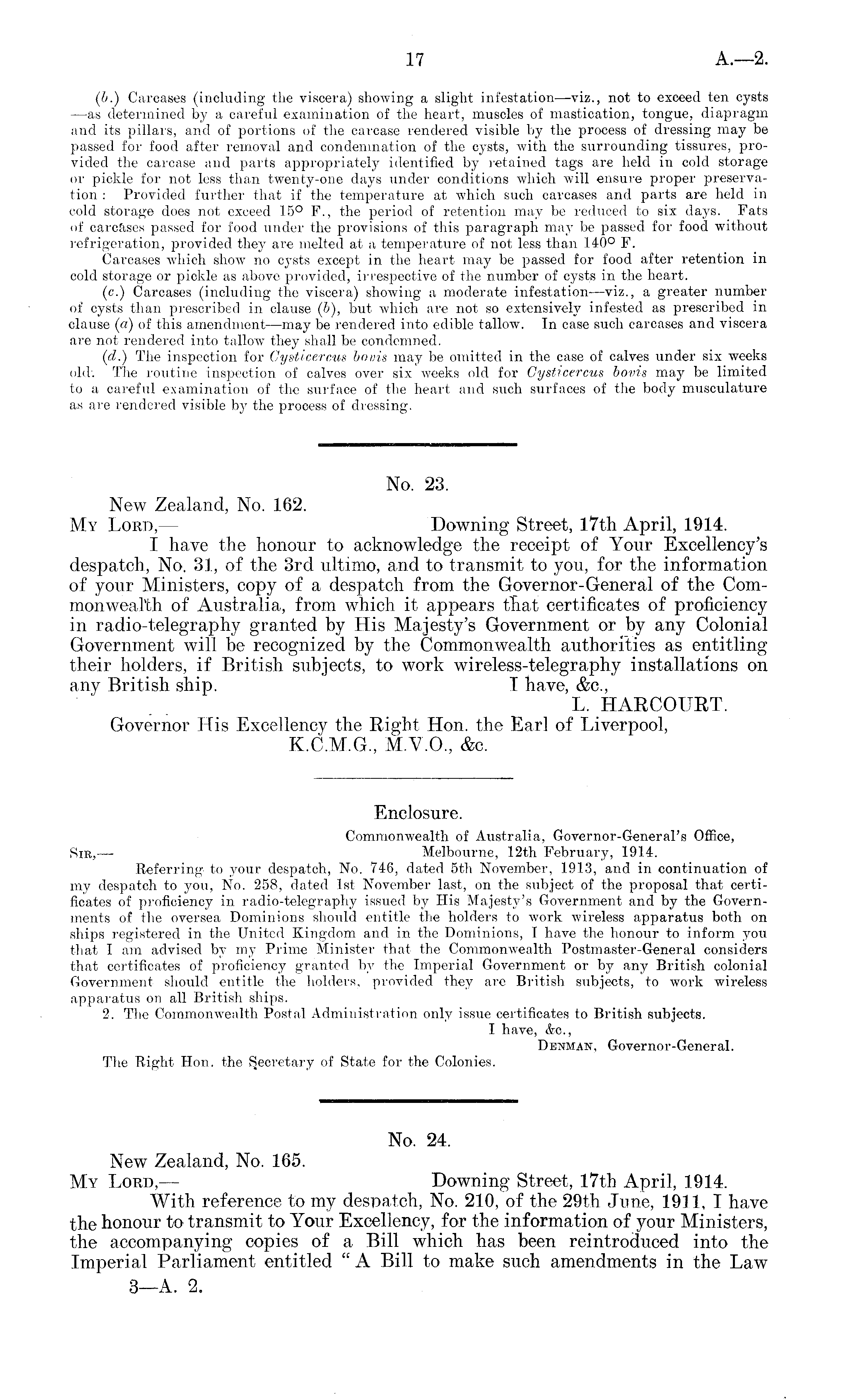 Enclosure. Commonwealth of Australia, Governor-General's Office, Sir, — Melbourne, 12th February, 1914. Referring to your despatch, No. 746, dated sth November, 1913, and in continuation of my despatch to you, No. 258, dated Ist November last, on the subject of the proposal that certificates of proficiency in radio-telegraphy issued by His Majesty's Government and by the Governments of the oversea Dominions should entitle the holders to work wireless apparatus both on ships registered in the United Kingdom and in the Dominions, I have the honour to inform you that I am advised by my Prime Minister that the Commonwealth Postmaster-General considers that certificates of proficiency granted by the Imperial Government or by any British colonial Government should entitle the holders, provided they are British subjects, to work wireless apparatus on all British ships. 2. The Commonwealth Postal Administration only issue certificates to British subjects. I have, &c, Denman, Governor-General. The Right Hon. the Secretary of State for the Colonies.