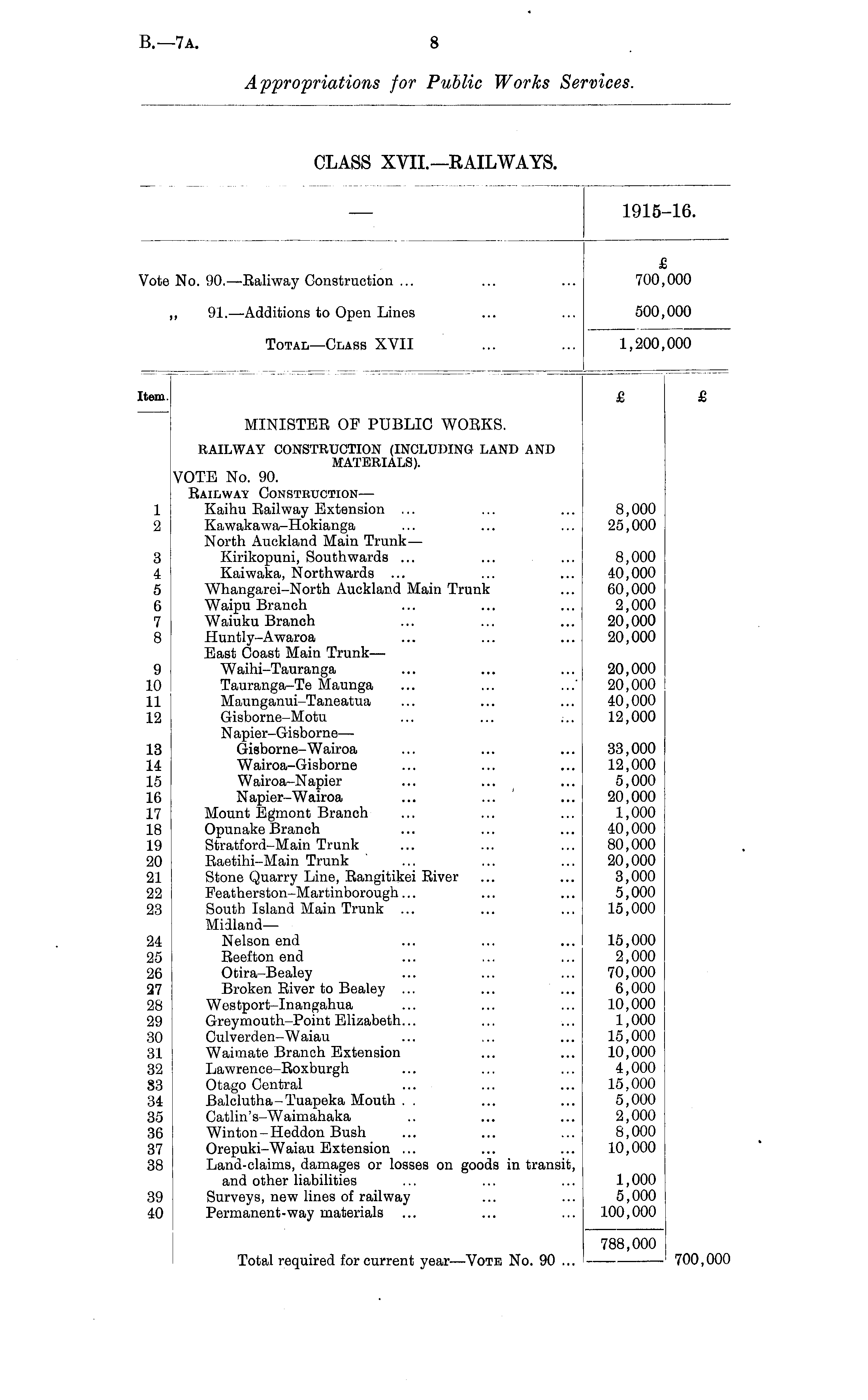 1915-16. r ote No. 90.—Ealiway Construction ... £ 700,000 ,, 91.—Additions to Open Lines 500,000 Total—Class XVII 1,200,000 [tern. £ £ MINISTEE OF PUBLIC WOEKS. RAILWAY CONSTRUCTION (INCLUDING LAND AND MATERIALS). 1 2 3 4 5 6 7 8 9 10 11 12 13 14 15 16 17 18 19 20 21 22 23 VOTE No. 90. Eailway Construction— Kaihu Eailway Extension ... Kawakawa-Hokianga North Auckland Main Trunk— Kirikopuni, Southwards ... Kaiwaka, Northwards ... Whangarei-North Auckland Main Trunk Waipu Branch Waiuku Branch Huntly-Awaroa East Coast Main Trunk— Waihi-Tauranga Tauranga-Te Maunga Maunganui-Taneatua Gisborne-Motu ... ... ;.. Napier-Gisborne— Gisborne-Wairoa Wairoa-Gisborne Wairoa-Napier Napier-Wairoa Mount Egmont Branch Opunake Branch Stratford-Main Trunk Baetihi-Main Trunk Stone Quarry Line, Eangitikei Eiver Featherston-Martinborough... South Island Main Trunk ... MidlandNelson end Eeefton end Otira-Bealey Broken Biver to Bealey ... Westport-Inangahua Greymouth-Point Elizabeth... Culverden-Waiau Waimate Branch Extension Lawrence-Boxburgh Otago Central ... .... Balclutha-Tuapeka Mouth . . Catlin's-Waimahaka Winton-Heddon Bush Orepuki-Waiau Extension ... Land-claims, damages or losses on goods in transit, and other liabilities Surveys, new lines of railway Permanent-way materials 8,000 25,000 8,000 40,000 60,000 2,000 20,000 20,000 20,000 20,000 40,000 12,000 33,000 12,000 5,000 20,000 1,000 40,000 80,000 20,000 3,000 5,000 15,000 24 25 26 27 28 29 30 31 32 83 34 35 36 37 38 15,000 2,000 70,000 6,000 10,000 1,000 15,000 10,000 4,000 15,000 5,000 2,000 8,000 10,000 39 40 1,000 5,000 100,000 Total required for current year—Vote No. 90 ... 788,000 700,000