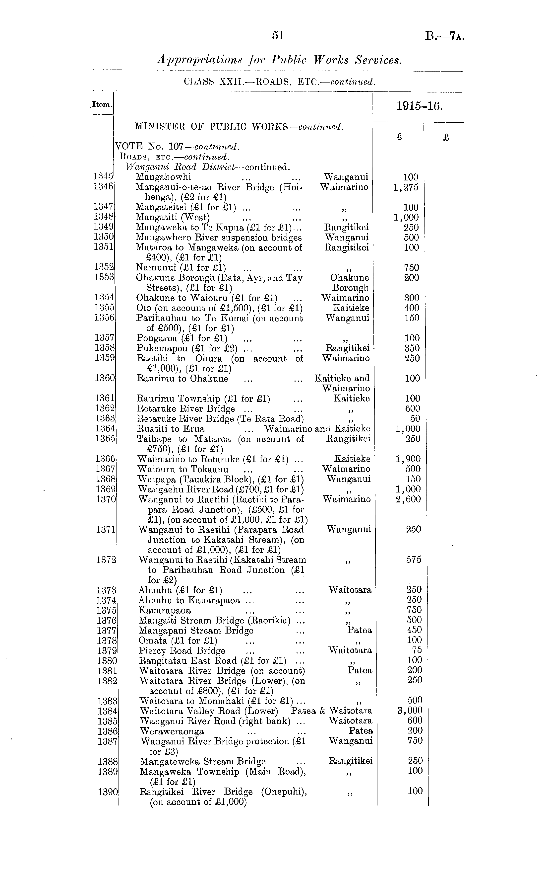 itom. 1915-16. MINISTER OF PUBLIC WORKS— continued. VOTE No, 107- continued. Roads, etc — continued. Wanganui Boad District —continued. Mangahowhi. ... ... Wanganui Manganui-o-te-ao Eiver Bridge (Hoi- Waimarino henga), (£2 for £1) Mangateitei (£1 for £1) ... Mangatiti (West) Mangaweka to Te Kapua (£1 for £1)... Eangitikei Mangawhero Eiver suspension bridges Wanganui Mataroa to Mangaweka (on account of Eangitikei £400), (£1 for £1) Nainunui (£1 for £1) ... ... ,, i Ohakune Borough (Bata, Ayr, and Tay Ohakune Streets), (£1 for £1) Borough Ohakune to Waiouru (£1 for £1) ... Waimarino Oio (on account of £1,500), (£1 for £1) Kaitieke I Parihauhau to Te Komai (on account Wanganui of £500), (£1 for £1) Pongaroa (£1 for £1) ... ... ,, ! Pukemapou (£1 for £2) ... ... Eangitikei I Eaetihi to Ohura (on account of Waimarino £1,000), (£1 for £1) ) Baurimu to Ohakune ... ... Kaitieke and Waimarino Baurimu Township (£1 for £1) ... Kaitieke ! Eetaruke Eiver Bridge ... ... ,, i Eetaruke Eiver Bridge (Te Eata Eoad) ,, I Euatiti to Erua ... Waimarino and Kaitieke ) Taihape to Mataroa (on account of Eangitikei £750), (£1 for £1) ) Waimarino to Eetaruke (£1 for £1) ... Kaitieke 1 Waiouru to Tokaanu ... ... Waimarino 5 Waipapa (Tauakira Block), (£1 for £1) Wanganui ) Wangaehu Eiver Eoad (£700, £1 for £1) ) Wanganui to Eaetihi (Eaetihi to Para- Waimarino para Eoad Junction), (£500, £1 for £1), (on account of £1,000, £1 for £1) L Wanganui to Eaetihi (Parapara Eoad Wanganui Junction to Kakatahi Stream), (on account of £1,000), (£1 for £1) 2 Wanganui to Baetihi (Kakatahi Stream ,, to Parihauhau Eoad Junction (£1 for £2) 3 Ahuahu (£1 for £1) ... ... Waitotara i Ahuahu to Kauarapaoa ... ... ,, 5 Kauarapaoa ... ... „ 3 Mangaiti Stream Bridge (Eaorikia) ... ,, 7 Mangapani Stream Bridge ... Patea 3 Omata (£1 for £1) 9 Piercy Eoad Bridge ... ... Waitotara 0 Eangitatau East Eoad (£1 for £1) ... ,, 1 Waitotara Biver Bridge (on account) Patea 2 Waitotara Eiver Bridge (Lower), (on ,, account of £800), (£l for £1) 3 Waitotara to Momahaki (£1 for £1) ... ,, 4 Waitotara Valley Boad (Lower) Patea & Waitotara 5 Wanganui Eiver Eoad (right bank) ... Waitotara 6 Weraweraonga ... ... Patea 7 Wanganui Biver Bridge protection (£1 Wanganui for £3) 8 Mangateweka Stream Bridge ... Eangitikei 9 Mangaweka Township (Main Eoad), ,, (£1 for £1) 0 Eangitikei Eiver Bridge (Onepuhi), ,, (on account of £1,000) £ 1345 1346 100 1,275 1347 1348 I.'M9 1350 1351 100 1,000 250 500 100 1352 1353 750 200 1354 1355 1356 300 400 150 1357 1358 1359 100 350 250 1360 100 1361 1362 1363 1364 1365 100 600 50 1,000 250 1366 1367 1368 1369 1370 1,900 500 150 1,000 2,600 1371 250 1372 575 1373 1374 1375 1376 1377 1378 1379 1380 1381 1382 250 250 750 500 450 100 75 100 200 250 1383 1384 1385 1386 1387 500 3,000 600 200 750 1388 1389 250 100 1390 100