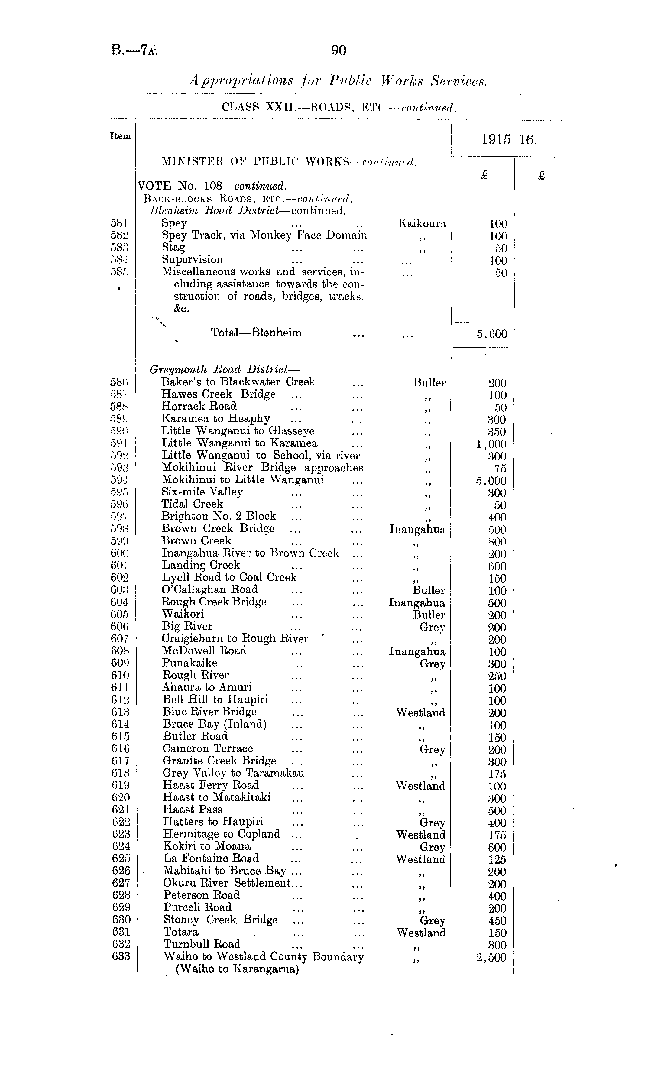 1915-16. item 581 582 583 584 58. r . MINISTER OF PUBLIC WORKS -continued. £ i VOTE No. 108— continued. Back-blocks Roads, etc. — continued. Blenheim Road, District —continued. Spey ... ... Kaikoura 100 Spey Track, via Monkey Face Domain ,, 100 Stag ... ... „ 50 Supervision ... ... ... 100 Miscellaneous works and services, in- ... 50 eluding assistance towards the construction of roads, bridges, tracks, &c. Total—Blenheim ... ... 5,600 • 580 587 588 589 590 591 592 593 591 595 596 597 598 599 600 601 602 603 604 605 606 607 608 609 610 611 612 613 614 615 616 6.17 618 619 620 621 622 623 624 625 626 627 628 629 630 631 632 633 Greymouth Road District — Baker's to Blackwater Creek ... Buller 200 Hawes Creek Bridge ... ... ,, 100 Horrack Road ... ... ,, 50 Karamea to Heaphy ... ... ,, 300 Little Wanganui to Glasseye ... ,, 350 Little Wanganui to Karamea ... ,, 1,000 Little Wanganui to School, via river ,, 300 Mokihinui River Bridge approaches ,, 75 Mokihinui to Little Wanganui ... ,, 5,000 Six-mile Valley ... ... ,, 300 Tidal Creek ... ... ,, 50 Brighton No. 2 Block ... ... „ 400 Brown Creek Bridge ... ... Inangahua 500 Brown Creek ... ... „ 800 Inangahua River to Brown Creek ... ,, 200 Landing Creek ... ... ,, 600 Lyell Road to Coal Creek ... „ 150 O'Callaghan Road ... ... Buller 100 Rough Creek Bridge ... ... Inangahua 500 Waikori ... ... Buller 200 • Big River ... ... Grey 200 Craigieburn to Rough River ... „■ 200 McDowell Road ... ... Inangahua 100 Punakaike ... ... Grey 300 Rough River ... ... „ 250 Ahaura to Amuri ... ... ,, ]00 Bell Hill to Haupiri ... ... ,, 100 Blue River Bridge ... ... Westland 200 Bruce Bay (Inland) ... ... ,, 100 Butler Road ... ... „ 150 Cameron Terrace ... ... Grey 200 ■ Granite Creek Bridge ... ... ,, 300 Grey Valley to Taramakau ... ,, 175 Haast Ferry Road ... ... Westland 100 Haast to Matakitaki ... ... ,, 300 Haast Pass ... ... ,, 500 Hatters to Haupiri ... ... Grey 4()0 Hermitage to Copland ... ... Westland 175 Kokiri to Moana ... ... Grey 600 La Fontaine Road ... ... Westland 125 Mahitahi to Bruce Bay ... ... „ 200 Okuru River Settlement... ... ,, 200 Peterson Road ... ... ,, 400 Purcell Road ... ... „ 200 Stoney Creek Bridge ... ... Grey 450 Totara ... ... Westland 150 Turnbull Road ... ... „ 300 Waiho to Westland County Boundary ,, 2,500 (Waiho to Karangarua)
