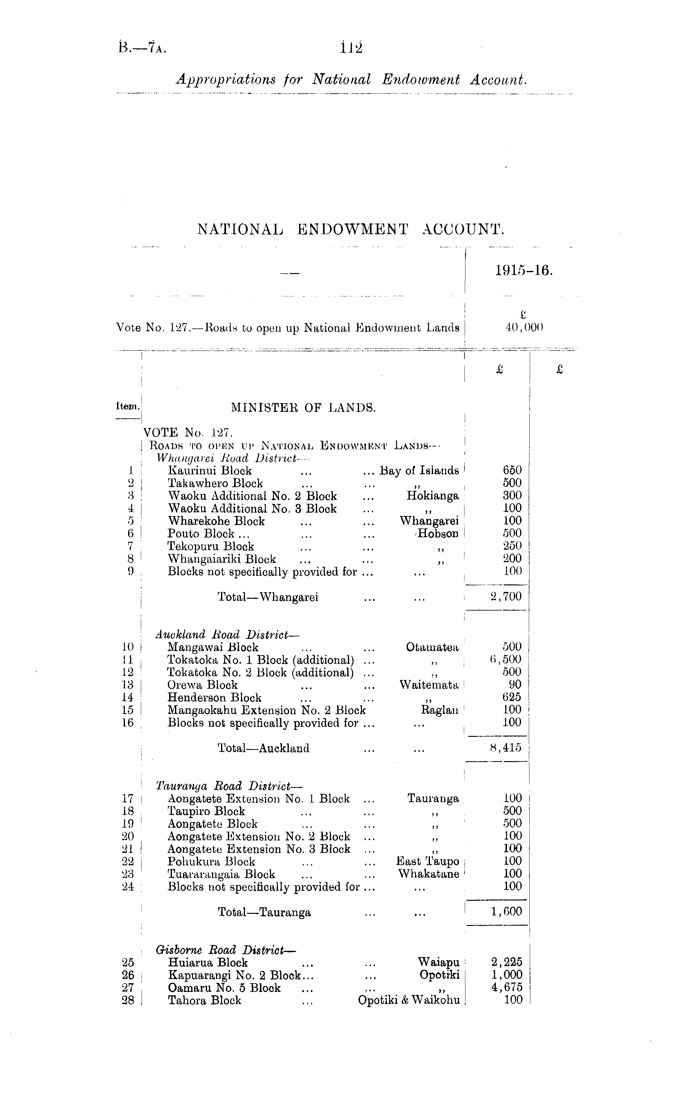 ±</_L.,J-1915-16. e Vote No, 127.—Eoads to open up National Endowment Lands 10,0 £ 10,000 £ £ £ tem. MINISTEE OF LANDS. VOTE No. 127. Boads to open up National Endowment Lands--Whangarei Boad District — 1 Kaurinui Block ... ... Bay of Islatids 650 2 Takawhero Block ... ... „ 500 3 Waoku Additional No. 2 Block ... Hokianga 300 4 Waoku Additional No. 3 Block ... ,, 100 5 Wharekohe Block ... ... Whangarei 100 6 Pouto Block... ... ... Hobson 500 7 ! Tekopuru Block ... ... ,, 250 8 I Whangaiariki Block ... ... „ 200 9 | Blocks not specifically provided for ... ... 100 Total—Whangarei ... ... 2,700 Auckland Boad District — 10 ■ Mangawai Block ... ... Otamatea 500 11 Tokatoka No. 1 Block (additional) ... ,, 6,500 12! Tokatoka No. 2 Block (additional) ... ,, 500 13 Orewa Block ... ... Waitemata 90 14 Henderson Block ... ... ,, 625 15 Mangaokahu Extension No. 2 Block Eaglan 100 16 Blocks not specifically provided for ... ... 100 Total—Auckland ... ... 8,415 Tauranga Boad District — 17 i Aongatete Extension No. 1 Block ... Tauranga 100 18 Taupiro Block ... ... ,, 500 19 Aongatete Block ... ... ,, 500 20 Aongatete Extension No. 2 Block ... ,, 100 21 j Aongatete Extension No. 3 Block ... ,, 100 22 j Pohukura Block ... ... East Taupo 100 23 Tuararangaia Block ... ... Whakatane 1 100 24 Blocks not specifically provided for ... ... 100 Total—Tauranga ... ... 1,600 Gisborne Boad District — 25 Huiarua Block ... ... Waiapu 2,225 26. Kapuarangi No. 2 Block... ... Opotiki 1,000 27 Oamaru No. 5 Block ... ... „ 4,675 28 I Tahora Block ... Opotiki & Waikohu | 100