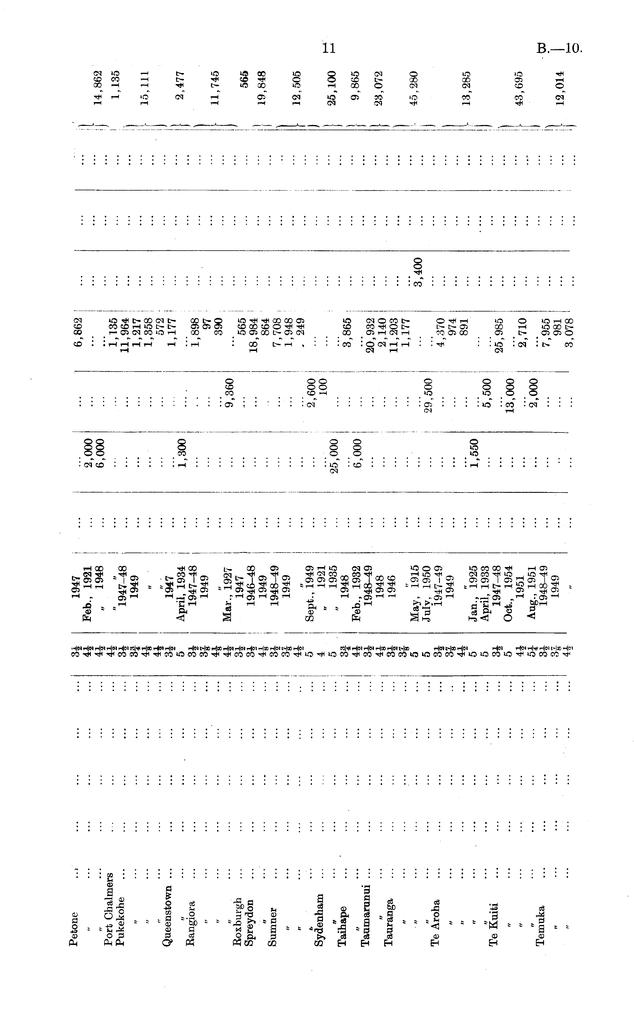 Petone .., Port Chalmers Pukekohe Queenstown ... Rangiora Roxburgh Spreydon Sumner Sydenham si 4i 41 41 31 Si 41 41 31 5 31 41 *8 41 31 3* 41 3i 31 4+ 5 4 5 Sf 41 31 41 Si 31 5 5 31 31 41 5 5 31 5 31 31 41 1947 Feb., 1921 „ 1948 "l947-48 1949 1947 April, 1934 1947-48 1949 Mar., 1927 1947 1946-48 1949 1948-49 1949 Sept., 1949 „ 1921 „ 1935 1948 Feb., 1932 1948-49 1948 1946 2,000 6,000 1,300 25,000 6,000 1,550 9,360 2,600 100 29,500 5,500 13,000 2,000 6,862 1,135 11,964 1,217 1,358 572 1,177 1,898 97 390 565 18,984 864 7,708 1,948 . 249 3,865 20,932 2.140 11,203 1,177 4,'370 974 891 25 ,'985 2,710 7,955 981 3,078 3,400 ) I r -■ 1 i !) I I I \ I I 14,862 1,135 15,111 2,477 11,745 565 19,848 12,505 25,100 9,865 23,072 45,280 t* Taihape „ ... Taumarunui ... Tauranga Te Aroha May. 1915 Julv. 1950 1947-49 1949 I 1 13,285 if ... Te Kuiti Jan., 1925 April, 1933 1947-48 Oct., 1954 1951 Aug., 1951 1948-49 1949 I I 43,695 12,014 a Temuka