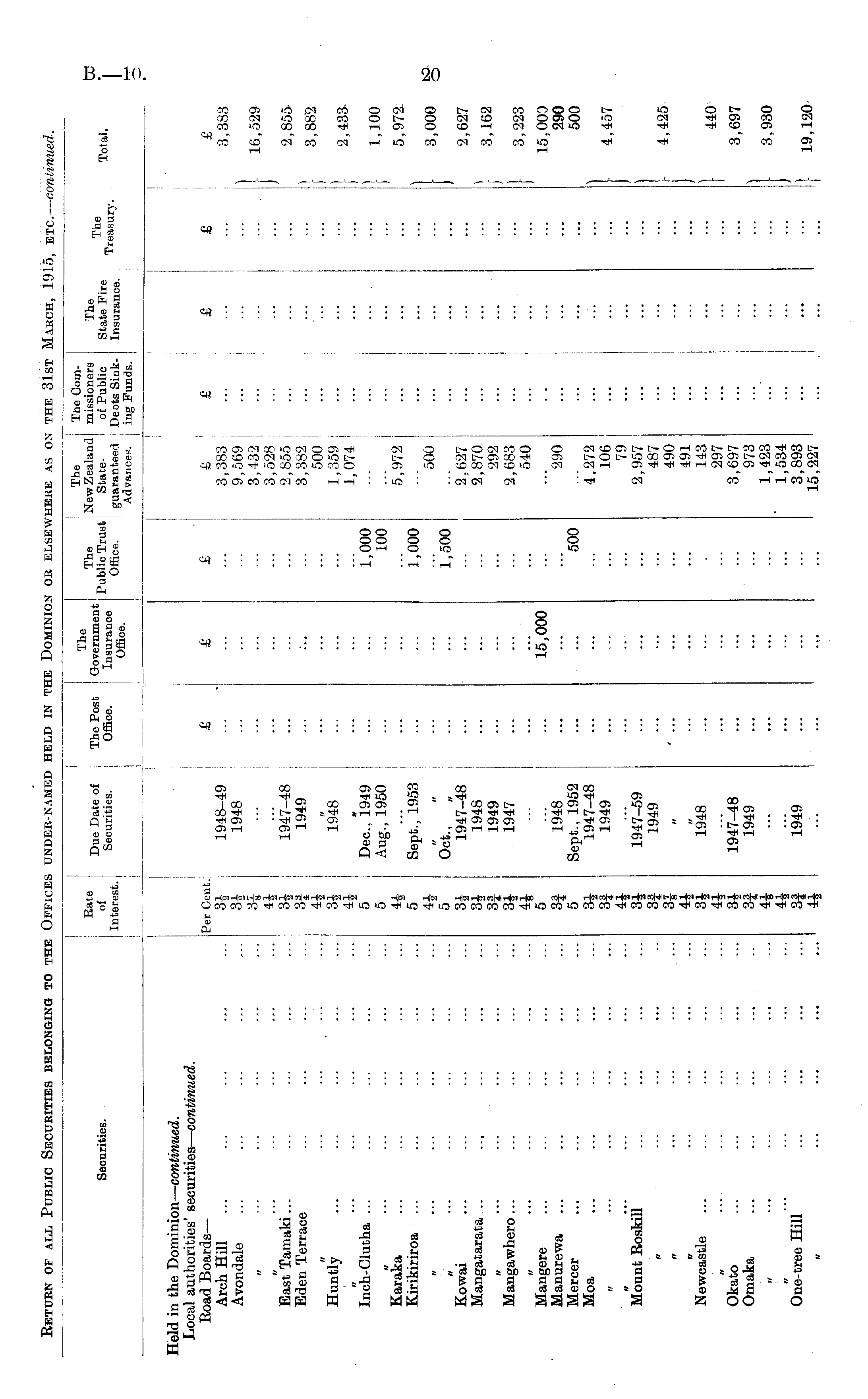 Securities. Rate of Interest. Due Date of Securities. The The The ComThePost Government „ . ,T h " 1 NewZealand missioners The Office. Insurance Pu W>c Trust Stat f, •« f State F.re Offic Office, guaranteed Dents Sink- Insurance. Advances. ing Funds. The Treasury. ; Total. Held in the Dominion — continued. Local authorities' securities — continued. Road Boards — Arch Hill Avondale Per Cent. 3* 31 44 34 3f 44 34 44 5 5 44 5 44 31 31 3i 31 41 5 3i 5 31 3| 41 31 3i 31 41 34 4i 34 3i 41 41 3i 41 1948-49 1948 1947-48 1949 1948 Dec, 1949 Aug., 1950 Sept., 1953 Oct., ", 1947-48 1948 1949 1947 1948 Sept., 1952 1947-48 1949 1947-59 1949 1948 1947-48 1949 1949 £ £ £ 1,000 100 1,000 1,500 i £ 3,383 9,569 3,432 3,528 2,855 j 3,382 500 1,359 1,074 5,972 500 2.627 2,870 292 2,683 540 £ £ £ £ 3,383 ) 16,529 East Tamaki... Eden Terrace it ... ... Huntly it ... ... ... Inch-Clutha ... 1 1 2,855 3,88'2 2,433 1,100 Karaka Kirikiriroa 5,972 tt ... ... ... 1 3,000 Kowai Mangatarata .. .., 2,627 Mangawhero ... J \ 3,162 3,223 „ ... ... ... Mangere Manurewa Mercer Moa 15,'000 15.003 290 500 Mount Roskill tt • ■ • • - • It ' " "5OO '"290 4,272 106 79 2,957 487 490 491 143 297 3,697 973 1,423 1,534 3,893 15,227 ) I 4,457 4,425 440 Newcastle a ... ... ... Okato Omaka 3,697 One-tree Hill J 1 3,930 19,120 it ... .. •