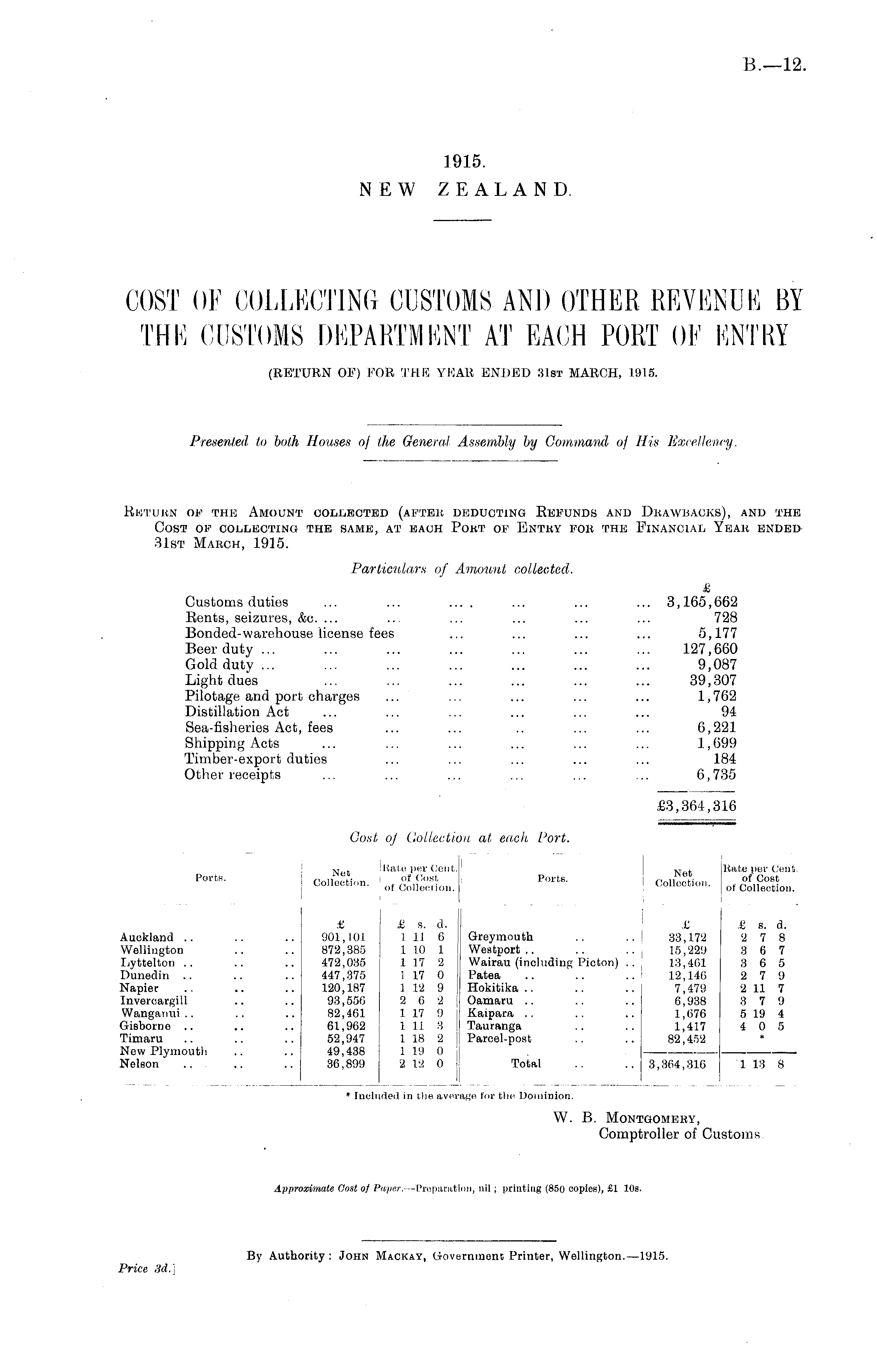 return of the amount collected (after deducting refunds and drawbacks), and the Cost of collecting the same, at each Port of Entry for the Financial Year ended 31st March, 1915. Particulars of Amount collected. a Customs duties ... ... .... ... ... ... 3,165,662 Rents, seizures, &c. ... ... ... ... ... ... 728 Bonded-warehouse license fees ... ... ... ... 5,177 Beer duty... ... ... ... ... ... ... 127,660 Gold duty ... ... ... ... ... ... ... 9,087 Light dues ... ... ... ... ... ... 39,307 Pilotage and port charges ... ... ... ... ... 1,762 Distillation Act ... ... ... ... ... ... 94 Sea-fisheries Act, fees ... ... .. ... ... 6,221 Shipping Acts ... ... ... ... ... ... 1,699 Timber-export duties ... ... ... ... ... 184 Other receipts ... ... ... ... ... ... 6,735 £3,364,316