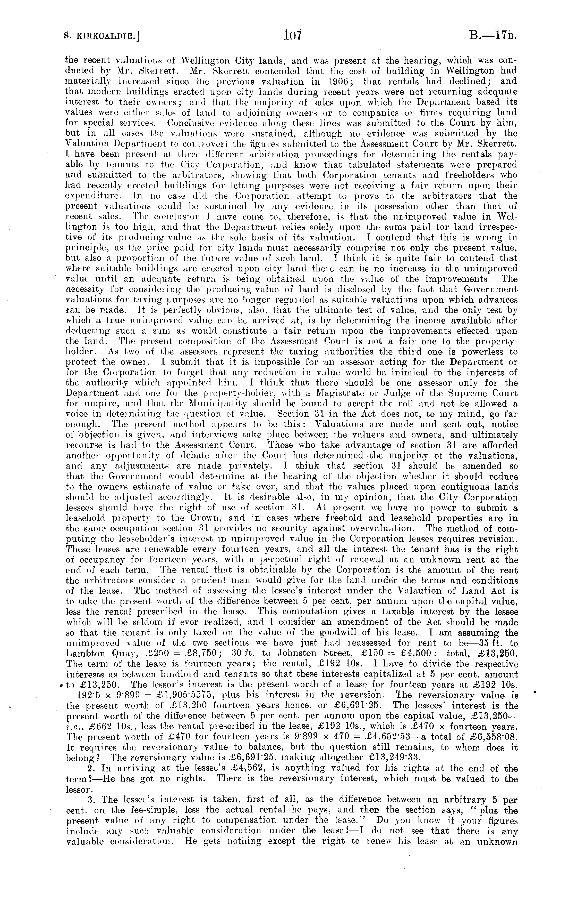 the recent valuations of Wellington City lands, and was present at the hearing, which was conducted by Mr. Skerrett. Mr. Skerrett, contended that the cost of building in Wellington had materially increased since the previous valuation in 1906; that rentals had declined; and that modern buildings erected upon city lands during recent years were not returning adequate interest to their owners; and that the majority of sales upon which the Department based its values were either sales of land to adjoining owners or to companies or firms requiring land for special services. Conclusive evidence along these lines was submitted to the Court by him, but in all eases the valuations were sustained, although no evidence was submitted by the Valuation Department fo controvert the figures submitted to the Assessment Court by Mr. Skerrett. I have been present at three different arbitration proceedings for determining the rentals payable by tenants to the City Corporation, and know that tabulated statements were prepiared and submitted to the arbitrators, showing that both Corporation tenants and freeholders who had recently- erected buildings for letting purposes were not receiving a fair return upon their expenditure. In no case die! the Corporation attempt to prove to the arbitrators that the present valuations could be sustained by any evidence in its possession other than that of recent sales. The conclusion J have come to, therefore, is that the unimproved value in Wellington is too high, and that the Department relies solely upon the sums paid for land irrespective of its producing-value as Hie sole basis of its valuation. I contend that this is wrong in principle, as the price paid for city lands must necessarily comprise not only the present value, but also a proportion of the future value of such land. I think it is quite fair to contend that where suitable buildings are erected upon city land there can be no increase in the unimproved value until an adequate return is being obtained upon the value of the improvements. The necessity for considering the producing-value of land is disclosed by the fact that Government valuations for taxing purposes are no longer regarded as suitable valuations upon which advances tan be made. It is perfectly obvious, also, that the ultimate test of value, and the only test which a true unimproved value can be arrived at, is by determining the income- available after deducting such a sum as would constitute a fair return upon the improvements effected upon the land. The present composition of the Assessment Court is not a fair one to the propertyholder. As two of the assessors represent the taxing authorities the third one is powerless to protect the owner. I submit that it is impossible for an assessor acting for the Department or for the Corporation to forget that any reduction in value would be inimical to the interests of the authority which appointed him. I think that there should be one assessor only for the Department and one for the property-holder, with a Magistrate or Judge of the Supreme Court for umpire, and that the Municipality should be bounel to accept the roll and not be allowed a voice in determining the question of value. Section 31 in the Act does not, to my mind, go far enough. The present method appears to be this : Valuations are made and sent out, notice of objection is given, anil interviews take place between the valuers and owners, anil ultimately recourse is had to the Assessment Court. Those who take advantage of section 31 are afforded another opportunity of debate after the Court has determined the majority of the valuations, and any adjustments are made privately. I think that section 31 should be amended so that the Government would determine at the hearing of the objection whether it should reduce to the owners estimate of value or take over, and that the values placed upon contiguous lands should be adjusted accordingly. It is desirable also, in my opinion, that the City Corporation lessees should have the right of use of section 31. At present we have no power to submit a leasehold property to the Crown, and in eases where freehold and leasehold properties are in the same occupation section 31 provides no security against overvaluation. The method of computing the leaseholder's interest in unimproved value in the Corporation leases requires revision. These leases are renewable every fourteen years, and all the interest the tenant has is the right of occupancy for fourteen years, with a perpetual right of renewal at an unknown rent at the end of each term. The rental that is obtainable by the Corporation is the amount of the rent the arbitrators consider a prudent man would give for the land under the terms and conditions of the lease. The method of assessing the lessee's interest under the Valaution of Land Act is to take the present worth of the difference between 5 per cent, per annum upon the capital value, less the rental prescribed in the lease. This computation gives a taxable interest by the lessee which will be seldom if ever realized, and I consider an amendment of the Act should be made so that the tenant, is only taxed on the value of the goodwill of his lease. I am assuming the unimproved value of the two sections we have just had reassessed for rent, to be —35 ft. to Lambton Quay, £250 = £8,750; 30 ft. to Johnston Street, £150 = £4,500 : total, £13,250. The term of the lease is fourteen, years; the rental, £1,92 10s. I have to divide the respective interests as between landlord and tenants so that these interests capitalized at 5 per cent, amount «■ to £13,250. The lessor's interest is the present worth of a lease for fourteen years at, £192 10s. —192\5 x 9 - 899 = £.1,9055575, plus his interest in the reversion. I.he reversionary value is the present worth of £13,250 fourteen years hence, or £6,69125. The lessees' interest is the present worth of the difference between 5 per cent, per annum upon