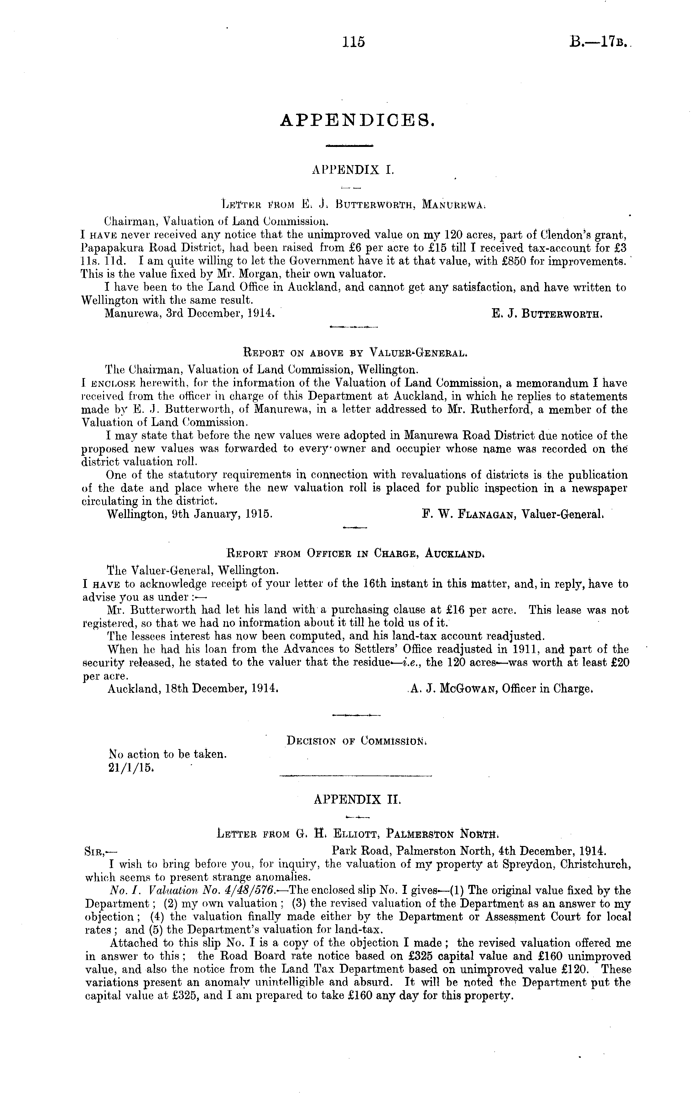 Report on above by Valuer* General. The Chairman, Valuation of Land Commission, Wellington. I enclose herewith, for the information of the Valuation of Land Commission, a memorandum I have received from the officer in charge of this Department at Auckland, in which he replies to statements made by E. J. Butterworth, of Manurewa, in a letter addressed to Mr. Rutherford, a member of the Valuation of Land Commission. I may state that before the new values were adopted in Manurewa Road District due notice of the proposed new values was forwarded to every owner and occupier whose name was recorded on the district valuation roll. One of the statutory requirements in connection with revaluations of districts is the publication of the date and place where the new valuation roll is placed for public inspection in a newspaper circulating in the district. Wellington, 9th January, 1915. P. W. Flanagan, Valuer-General.