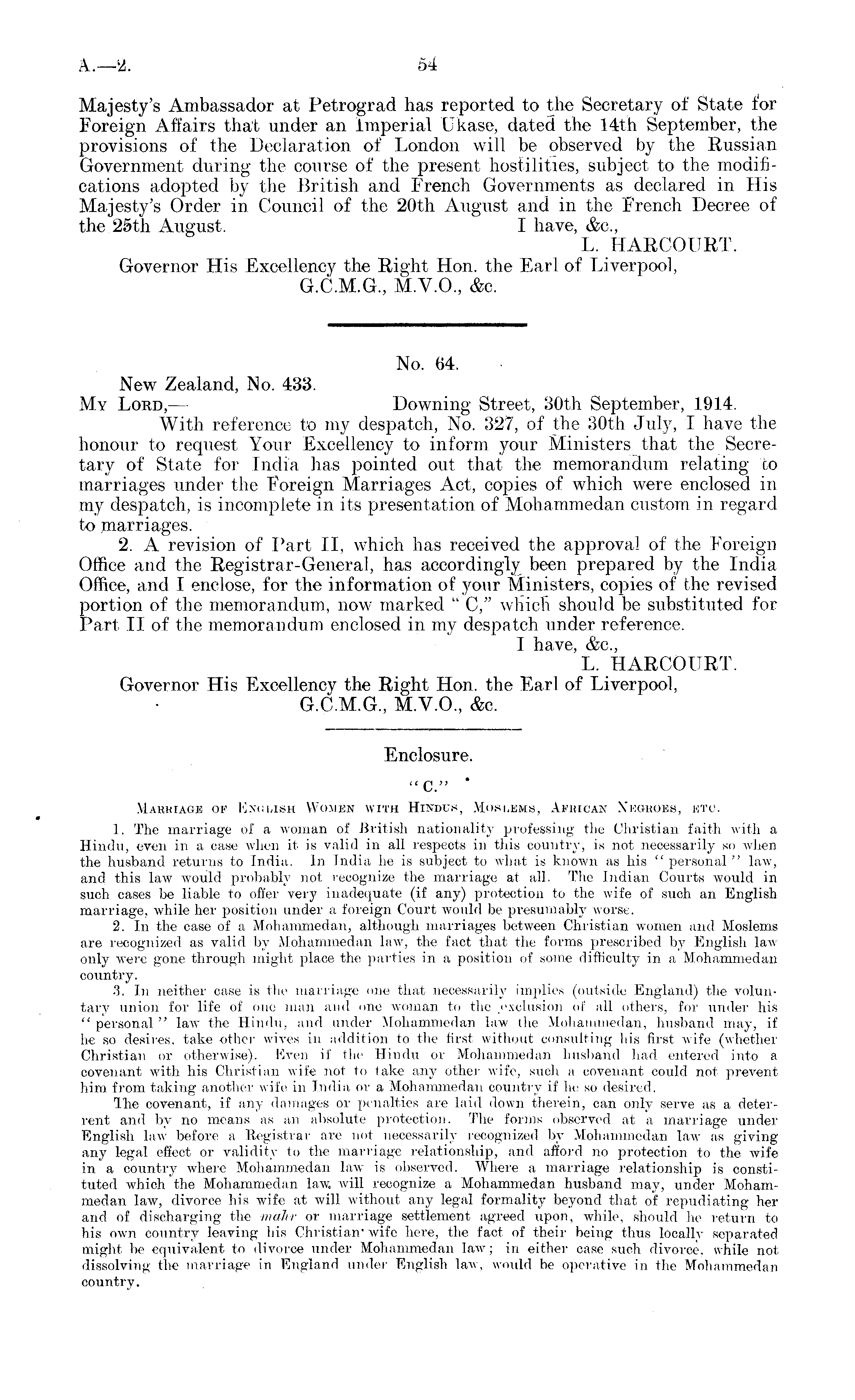 No. 64. New Zealand, No. 433. My Lord, — Downing Street, 30th September, 1914. With reference to my despatch, No. 327, of the 30th July, I have the honour to request Your Excellency to inform your Ministers that the Secretary of State for India has pointed out that the memorandum relating to marriages under the Foreign Marriages Act, copies of which were enclosed in my despatch, is incomplete in its presentation of Mohammedan custom in regard to marriages. 2. A revision of Part 11, which has received the approval of the Foreign Office and the Registrar-General, has accordingly been prepared by the India Office, and I enclose, for the information of your Ministers, copies of the revised portion of the memorandum, now marked " C," which should be substituted for Part II of the memorandum enclosed in my despatch under reference. I have, &c, L. HARCOURT. Governor His Excellency the Right Hon. the Earl of Liverpool, G.C.M.G., M.V.0., &c.