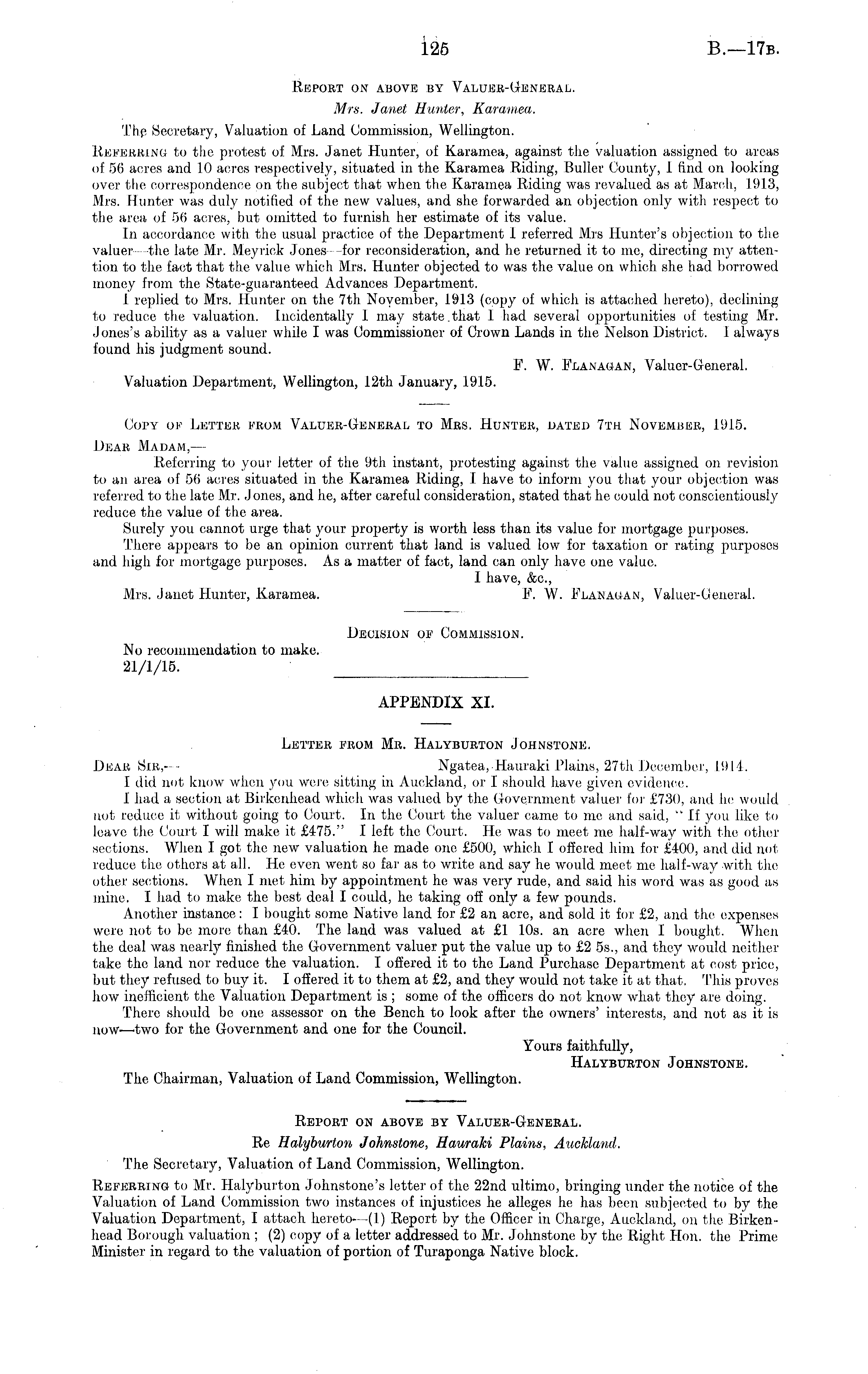 APPENDIX XI. Letter from Mr. Halyburton Johnstone. Dear Sir, — Ngatea, -Hauraki Plains, 27th, December, 1911. I did not know when you wore sitting in Auckland, or I should have given evidence. I had a section at Birkenhead which was valued by the Government valuer for £730, and he would not reduce it without going to Court, In the Court the valuer came to me and said, "If you like to leave the Court I will make it £475." I left the Court. He was to meet me half-way with the other sections. When I got the new valuation he made one £500, which I offered him for £400, and did not reduce the others at all. lie even went so far as to write and say he would meet me half-way with the other sections. When I met him by appointment he was very rude, and said his word was as good as mine. I had to make the best deal I could, he taking off only a few pounds. Another instance: I bought some Native land for £2 an acre, and sold it for £2, and the expenses were not to be more than £40. The land was valued at £1 10s. an acre when I bought. When the deal was nearly finished the Government valuer put the value up to £2 55., and they would neither take the land nor reduce the valuation. I offered it to the Land Purchase Department at cost, price, but they refused to buy it. I offered it to them at £2, and they would not take it at that, This proves how inefficient the Valuation Department is ; some of the officers do not know what they are doing. There should be one assessor on the Bench to look after the owners' interests, and not as it is now—two for the Government and one for the Council. Yours faithfully, Halyburton Johnstone. The Chairman, Valuation of Land Commission, Wellington. Report on above by Valuer-General. Re Halyburton Johnstone, Hauraki Plains, Auckland. The Secretary, Valuation of Land Commission, Wellington. Referring to Mr. Halyburton Johnstone's letter of the, 22nd ultimo, bringing under the notice of the Valuation of Land Commission two instances of injustices he alleges he has been subjected to by the Valuation Department, I attach hereto- -(1) Report by the Officer in Charge, Auckland, on the Birkenhead Borough valuation ; (2) copy of a letter addressed to Mr. Johnstone by the Right Hon. the Prime Minister in regard to the valuation of portion of Turaponga Native block.