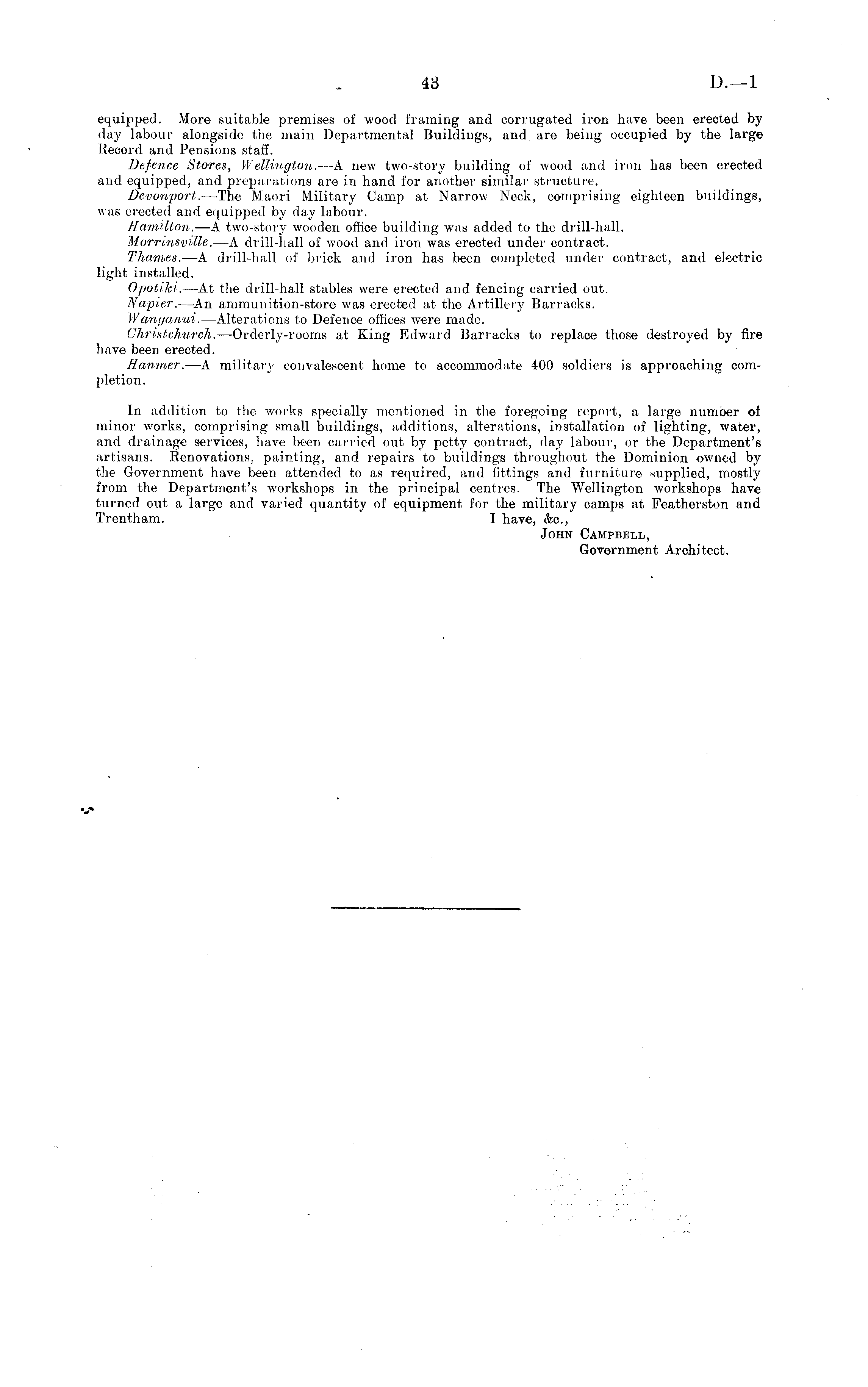 equipped. More suitable premises of wood framing and corrugated iron have been erected by day labour alongside the main Departmental Buildings, and are being occupied by the large Record and Pensions staff. Defence Stores, Wellington. —A new two-story building of wood and iron has been erected and equipped, and preparations are in hand for another similar structure. Devoupori. —The Maori Military Camp at Narrow Neck, comprising eighteen buildings, was erected and equipped by day labour. Hamilton. —A two-story wooden office building was added to the drill-hall. MorrinsvMe. —A drill-hall of wood and iron was erected under contract. Thames. —A drill-hall of brick and iron has been completed under contract, and electric light installed. Opotiki. —At the drill-hall stables were erected and fencing carried out. Napier. —An ammunition-store was erected at the Artillery Barracks. Wanganui. —Alterations to Defence offices were made. Christchurch. —Orderly-rooms at King Edward Barracks to replace those destroyed by fire have been erected. Hanmer. —A military convalescent home to accommodate 400 soldiers is approaching completion. In addition to the works specially mentioned in the foregoing report, a large number of minor works, comprising small buildings, additions, alterations, installation of lighting, water, and drainage services, have been carried out by petty contract, day labour, or the Department's artisans. Renovations, painting, and repairs to buildings throughout the Dominion owned by the Government have been attended to as required, and fittings and furniture supplied, mostly from the Department's workshops in the principal centres. The Wellington workshops have turned out a large and varied quantity of equipment for the military camps at Featherston and Trentham. T have, &c, John Campbell, Government Architect.
