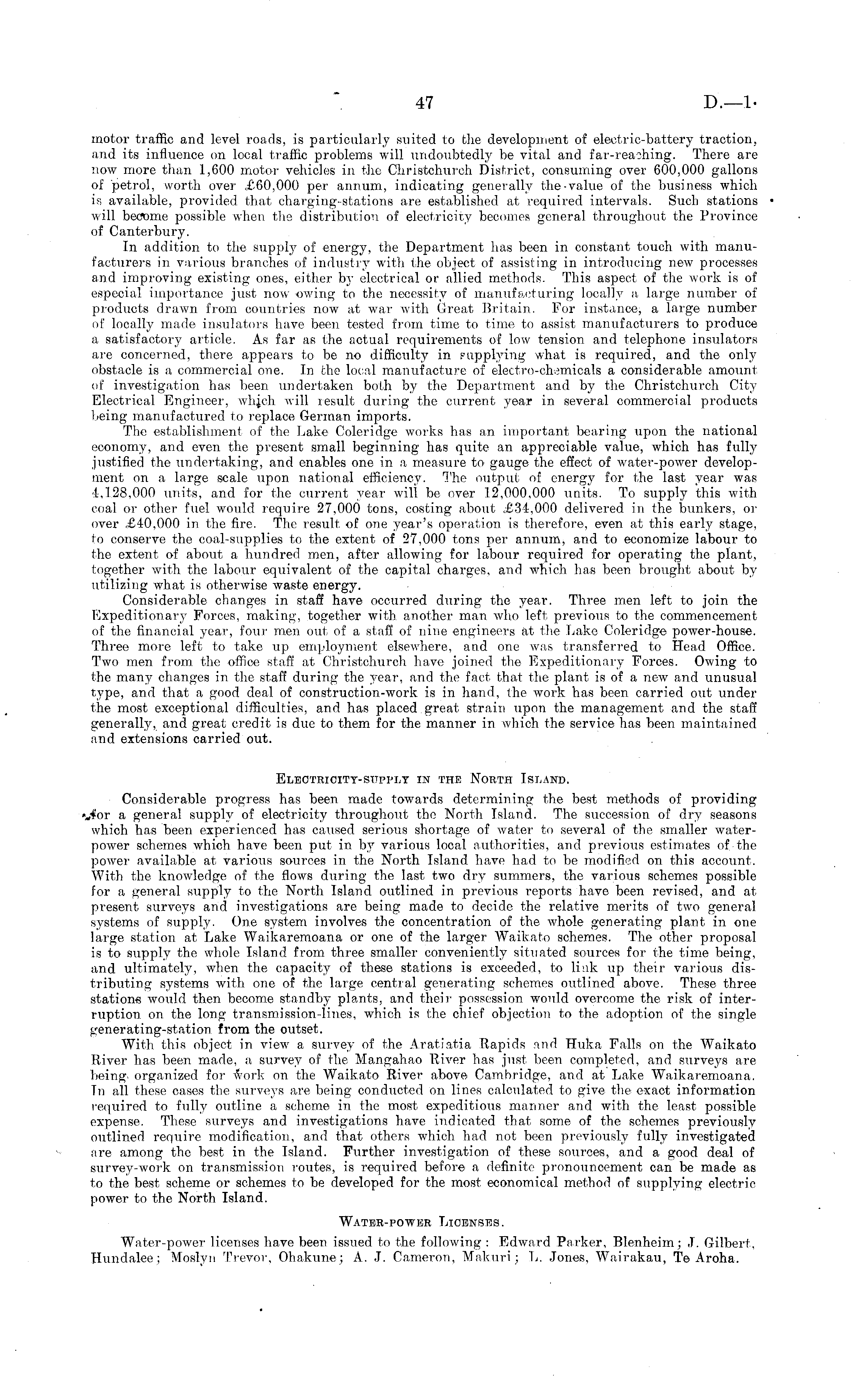 motor traffic and level roads, is particularly suited to the development of electric-battery traction, and its influence on local traffic problems will undoubtedly be vital and far-reaching. There are now more than 1,600 motor vehicles in the Christchurch District, consuming over 600,000 gallons of 'petrol, worth over £60,000 per annum, indicating generally the-value of the business which is available, provided that charging-stations are established at required intervals. Such stations will become possible when the distribution of electricity becomes general throughout the Province of Canterbury. In addition to the supply of energy, the Department has been in constant touch with manufacturers in various branches of industry with the object of assisting in introducing new processes and improving existing ones, either by electrical or allied methods. This aspect of the work is of especial importance just now owing to the necessity of manufacturing locally a large number of products drawn from countries now at war with Creat Britain. For instance, a large number of locally made insulators have been tested from time to time to assist manufacturers to produce a satisfactory article. As far as the actual requirements of low tension and telephone insulators are concerned, there appears to be no difficulty in supplying what is required, and the only obstacle is a commercial one. In the local manufacture of electro-chemicals a considerable amount of investigation has been undertaken both by the Department and by the Christchurch City Electrical Engineer, whjch will result during the current year in several commercial products being manufactured to replace German imports. The establishment of the Lake Coleridge works has an important bearing upon the national economy, and even the present small beginning has quite an appreciable value, which has fully justified the undertaking, and enables one in a measure to gauge the effect of water-power development on a, large scale upon national efficiency. The output of energy for the last year was 4,128,000 units, and for the current year will be over 12,000,000 units. To supply this with coal or other fuel would require 27,000 tons, costing about £34,000 delivered in the bunkers, or over £40,000 in the fire. The result of one year's operation is therefore, even at this early stage, to conserve the coal-supplies to the extent of 27,000 tons per annum, and to economize labour to the extent of about a hundred men, after allowing for labour required for operating the plant, together with the labour equivalent of the capital charges, and which has been brought about by utilizing what is otherwise waste energy. Considerable changes in staff have occurred during the year. Three men left to join the Expeditionary Forces, making, together with another man who left previous to the commencement of the financial year, four men out of a staff of nine engineers at the Lake Coleridge power-house. Three more left to take up employment elsewhere, and one was transferred to Head Office. Two men from the office staff at Christchurch have joined the Expeditionary Forces. Owing to the many changes in the staff during the 3-ear, and the fact that the plant is of a new and unusual type, and that a good deal of construction-work, is in hand, the work has been carried out under the most exceptional difficulties, and has placed great strain upon the management and the staff generally, and great credit is due to them for the manner in which the service has been maintained and extensions carried out. Electricity-sttpply in the North Island. Considerable progress has been made towards determining the best methods of providing *Jtor a general supply of electricity throughout the North Island. The succession of dry seasons which has been experienced has caused serious shortage of water to several of the smaller waterpower schemes which have been put in by various local authorities, and previous estimates of the power available at various sources in the North Island have had to be modified on this account. With the knowledge of the flows during the last two dry summers, the various schemes possible for a general supply to the North Island outlined in previous reports have been revised, and at present surveys and investigations are being made to decide the relative merits of two general systems of supply. One system involves the concentration of the whole generating plant in one large station at Lake Waikaremoana or one of the larger Waikato schemes. The other proposal is to supply the whole Island from three smaller conveniently situated sources for the time being, and ultimately, when the capacity of these stations is exceeded, to link up their various distributing systems with one of the large central generating schemes outlined above. These three stations would then become standby plants, and their possession would overcome the risk of interruption on the long transmission-lines, which is the chief objection to the adoption of the single generating-station from the outset. With this object in view a survey of the Aratiatia Rapids and Huka Falls on the AVaikato River has been made, a survey of the Mangahao River has just been completed, and surveys are being, organized for work on the Waikato River above Cambridge, and at Lake Waikaremoana. In all these cases the surveys are being conducted on lines calculated to give the exact information required to fully outline a scheme in the most expeditious mariner and with the least possible expense. These surveys and investigations have indicated that some of the schemes previously outlined require modification, and that others which had not been previously fully investigated are among the best in the Island. Further investigation of these sources, and a good deal of survey-work on transmission routes, is required before a definite pronouncement can be made as to the best scheme or schemes to be developed for the most economical method of s