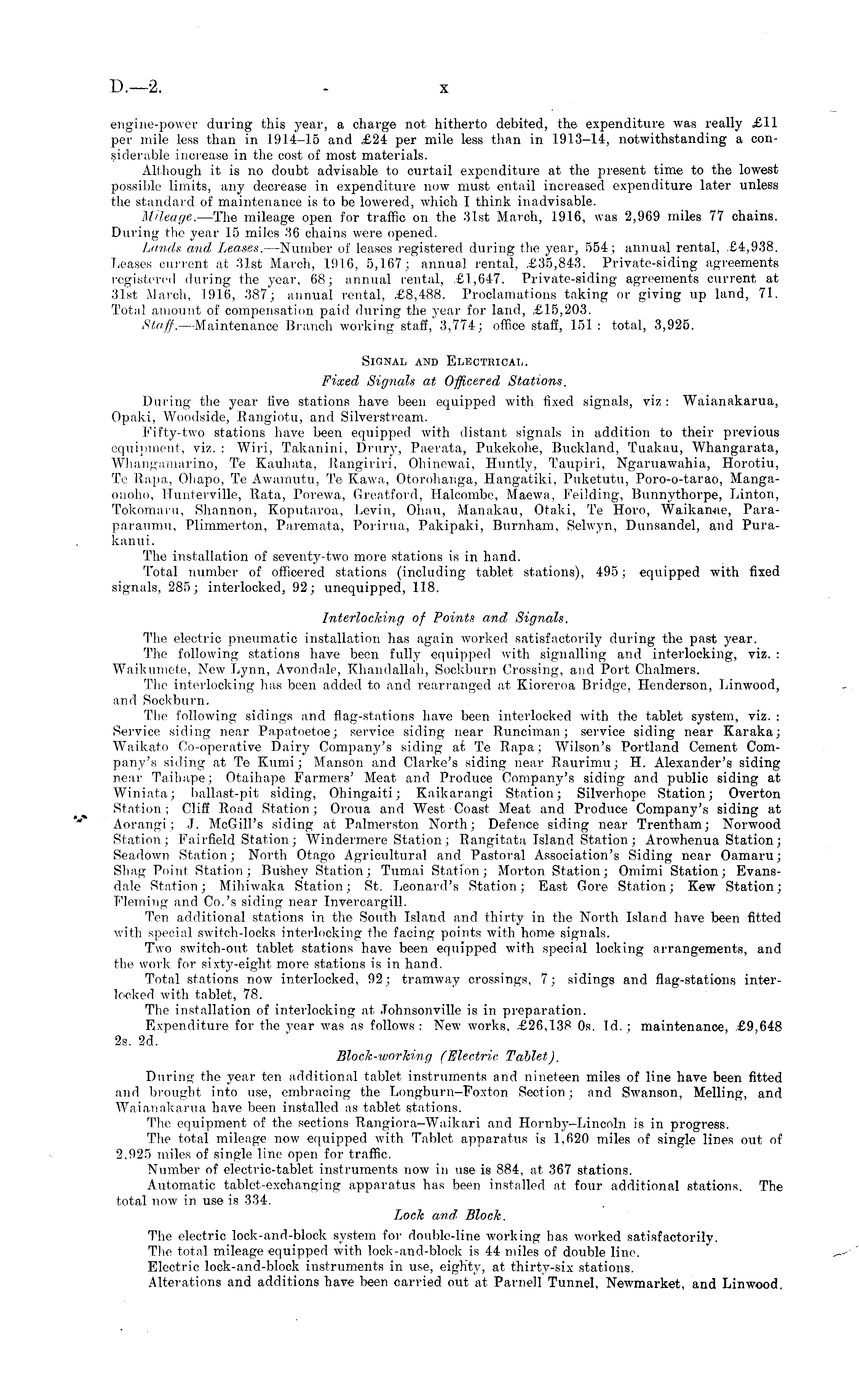 engine-power during this year, a charge not hitherto debited, the expenditure was really £11 per mile less than in 1914-15 and £24 per mile less than in 1913-14, notwithstanding a considerable increase in the cost of most materials. Although it is no doubt advisable to curtail expenditure at the present time to the lowest possible limits, any decrease in expenditure now must entail increased expenditure later unless the standard of maintenance is to be lowered, which I think inadvisable. Mileage. —The mileage open for traffic on the 31st March, 1916, was 2,969 miles 77 chains. During the year 15 miles 36 chains were opened. Lands and Leases. —Number of leases registered during the year, 554; annual rental, £4,938. Leases current at 31st March, 1916, 5,167; annual rental, £35,843. Private-siding agreements registered during the year, 68; annual rental, £1,647. Private-siding agreements current at 31st March, 1916, 387; annual rental, £8,488. Proclamations taking or giving up land, 71. Total amount of compensation paid during the year for land, £15,203. Staff. —Maintenance Branch working staff, 3,774; office staff, 151 : total, 3,925. Signal and Electrical. Fixed Signals at Officered Stations. During the year five stations have been equipped with fixed signals, viz: Waianakarua, Opaki, Woodside, Rangiotu, and Silverstream. Fifty-two stations have been equipped with distant signals in addition to their previous equipment, viz. : Wiri, Takanini, Drury, Paerata, Pukekohe, Buckland, Tuakau, Whangarata, Whangamarino, Te Kauhata, Rangiriri, Ohinewai, Huntly, Taupiri, Ngaruawahia, Horotiu, Te Rapa, Ohapo, Te Awamutu, Te Kawa, Otorohanga, Hangatiki, Puketutu, Poro-o-tarao, Mangaouoho, Hunterville, Rata, Porewa, Greatford, Halcombe, Maewa, Feilding, Bunnythorpe, Linton, Tokomaru, Shannon, Koputaroa, Levin, Ohau, Manakau, Otaki, Te Horo, Waikan-ae, Paraparaumu, Plimmerton, Paremata, Porirua, Pakipaki, Burnham, Selwyn, Dunsandel, and Purakanui. The installation of seventy-two more stations is in hand. Total number of officered stations (including tablet stations), 495; equipped with fixed signals, 285; interlocked, 92; unequipped, 118. Interlocking of Points and Signals. The electric pneumatic installation has again worked satisfactorily during the past year. The following stations have been fully equipped with signalling and interlocking, viz. : Waikumete, New Lynn, Avondale, Khandallah, Sockburn Crossing, and Port Chalmers. The interlocking has been added to and rearranged at Kioreroa Bridge, Henderson, Linwood, and Sockburn. The following sidings and flag-stations have been interlocked with the tablet system, viz. : Service siding near Papatoetoe; service siding near Runciman; service siding near Karaka; Waikato Co-operative Dairy Company's siding at Te Papa; Wilson's Portland Cement Company's siding at Te Kumi; Manson and Clarke's siding near Raurimu; H. Alexander's siding near Taihape; Otaihape Farmers' Meat and Produce Company's siding and public siding at Winiata; ballast-pit siding, Ohingaiti; Kaikarangi Station; Silverhope Station; Overton Station; Cliff Road Station; Oroua and West Coast Meat and Produce Company's siding at Aorangi; J. McGill's siding at Palmerston North; Defence siding near Trentham; Norwood Station; Fairfield Station; Windermere Station; Rangitata Island Station ; Arowhenua Station; Seadown Station; North Otago Agricultural and Pastoral Association's Siding near Oamaru; Shag Point Station; Bu'shey Station; Tumai Station; Morton Station; Omimi Station; Evansdale Station; Mihiwaka Station; St. Leonard's Station; East Gore Station; Kew Station; Fleming and Co.'s siding near Invercargill. Ten additional stations in the South Island and thirty in the North Island have been fitted with special switch-locks interlocking the facing points with home signals. Two switch-out tablet stations have been equipped with special locking arrangements, and the work for sixty-eight more stations is in hand. Total stations now interlocked, 92; tramway crossings, 7; sidings and flag-stations interlocked with tablet, 78. The installation of interlocking at Johnsonville is in preparation. Expenditure for the year was as follows : New works, £26,13£ os. Id. ; maintenance, £9,648 2s. 2d. Block-working (Electric Tablet). During the year ten additional tablet instruments and nineteen miles of line have been fitted and brought into use, embracing the Longburn-Foxton Section; and Swanson, Melling, and Waianakarua have been installed as tablet stations. The equipment of the sections B,angiora-Waikari and Hornby-Lincoln is in progress. The total mileage now equipped with Tablet apparatus is 1,620 miles of single lines out of 2,925 miles of single line open for traffic. Number of electric-tablet instruments now in use is 884, at 367 stations. Automatic tablet-exchanging apparatus has been installed at four additional stations. The total now in use is 334. Lock and Block. The electric lock-and-block system for double-line working has worked satisfactorily. The total mileage equipped with lock-and-block is 44 miles of double line. Electric lock-and-block instruments in use, eighty, at thirty-six stations. Alterations and additions have been carried out at Parnell Tunnel, Newmarket, and Linwood.