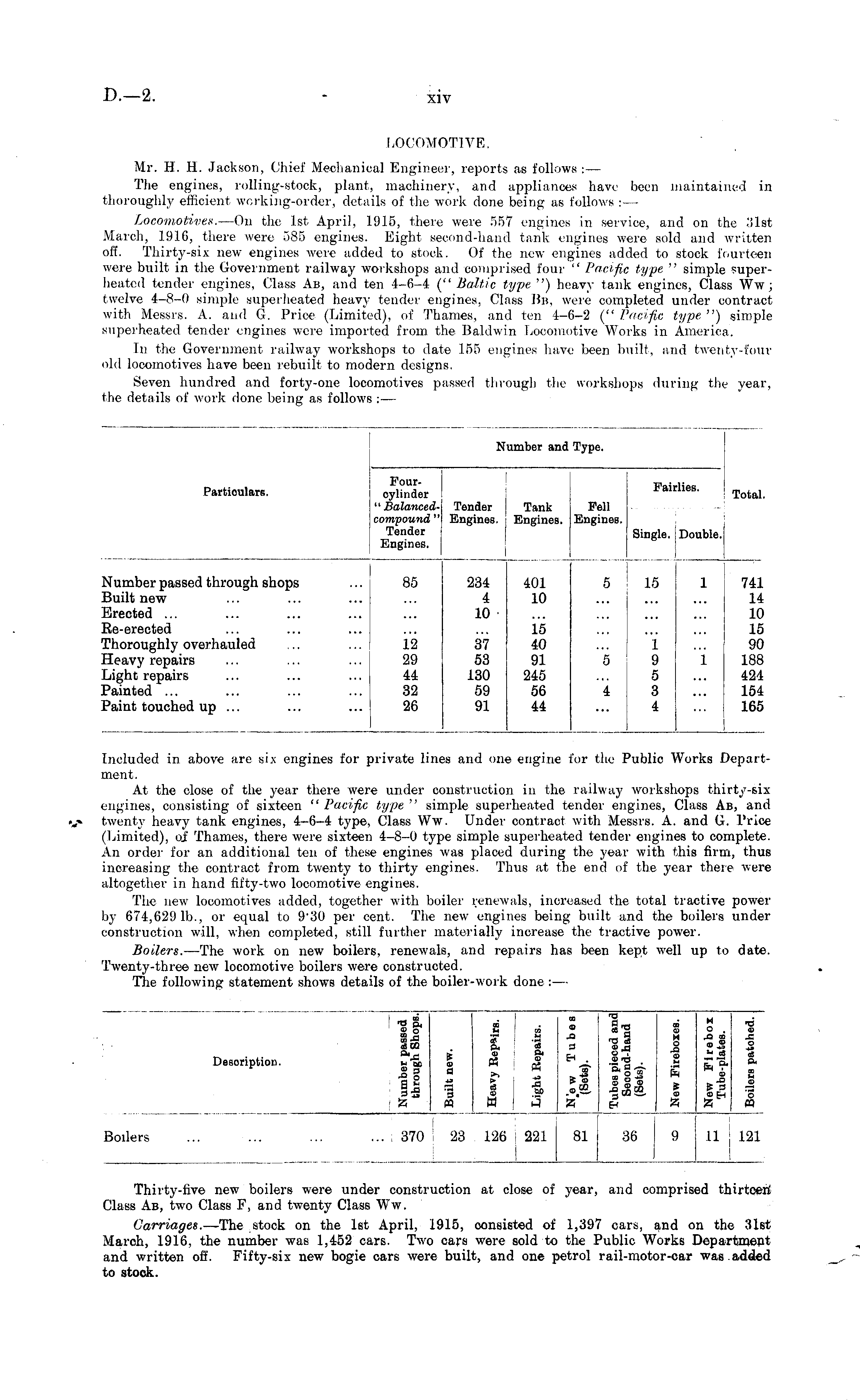 LOCOMOTIVE. Mr. H. H. Jackson, Chief Mechanical Engineer, reports as follows :— The engines, rolling-stock, plant, machinery, and appliances have been maintained in thoroughly efficient working-order, details of the work done being as follows :— Tjocomotives. —On the Ist April, 1915, there were 557 engines in service, and on the 31st March, 1916, there were 585 engines. Eight second-hand tank engines were sold and written off. Thirty-six new engines were added to stock. Of the new engines added to stock fourteen were built in the Government railway workshops and comprised four " Pacific type " simple superheated tender engines, Class Ab, and ten 4-6-4 (" Baltic type ") heavy tank engines, Class Ww ; twelve 4-8-0 simple superheated heavy tender engines, Class Bb, were completed under contract with Messrs. A. and G. Price (Limited), of Thames, and ten 4-6-2 (" Pacific type ") simple superheated tender engines were imported from the Baldwin Locomotive Works in America. In the Government railway workshops to date 155 engines have been built, and twenty-four old locomotives have been rebuilt to modern designs. Seven hundred and forty-one locomotives passed through the workshops during the year, the details of work done being as follows : —