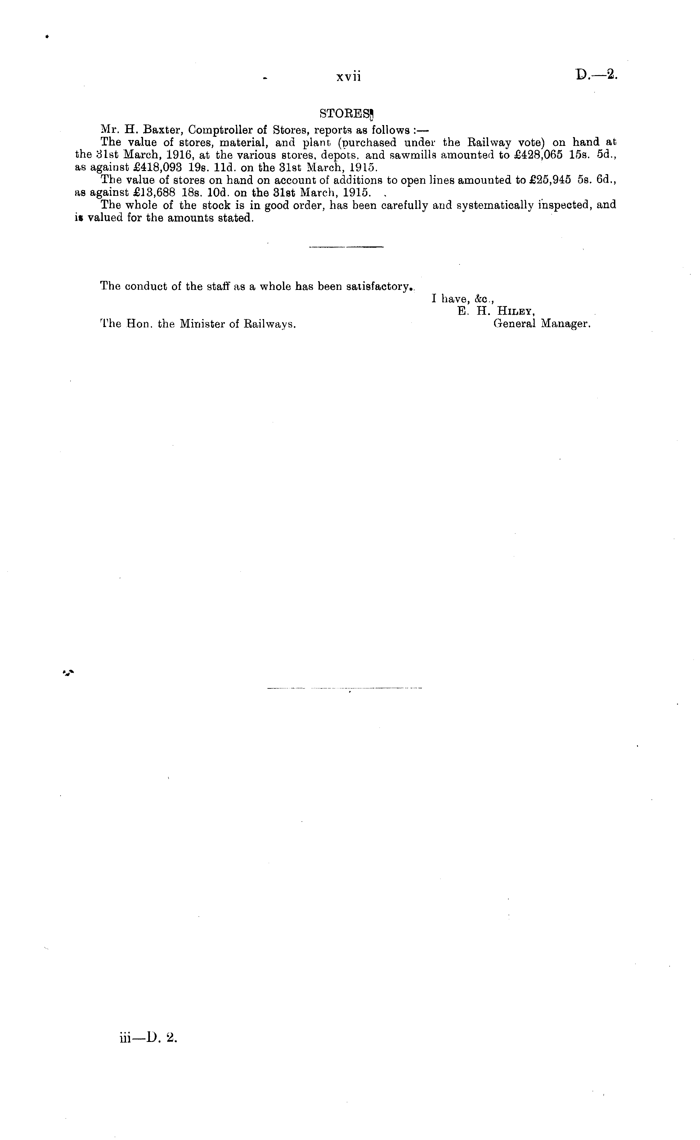 The conduct of the staff as a whole has been satisfactory. I have, &c, E. H. Hiley, The Hon. the Minister of Railways. General Manager.