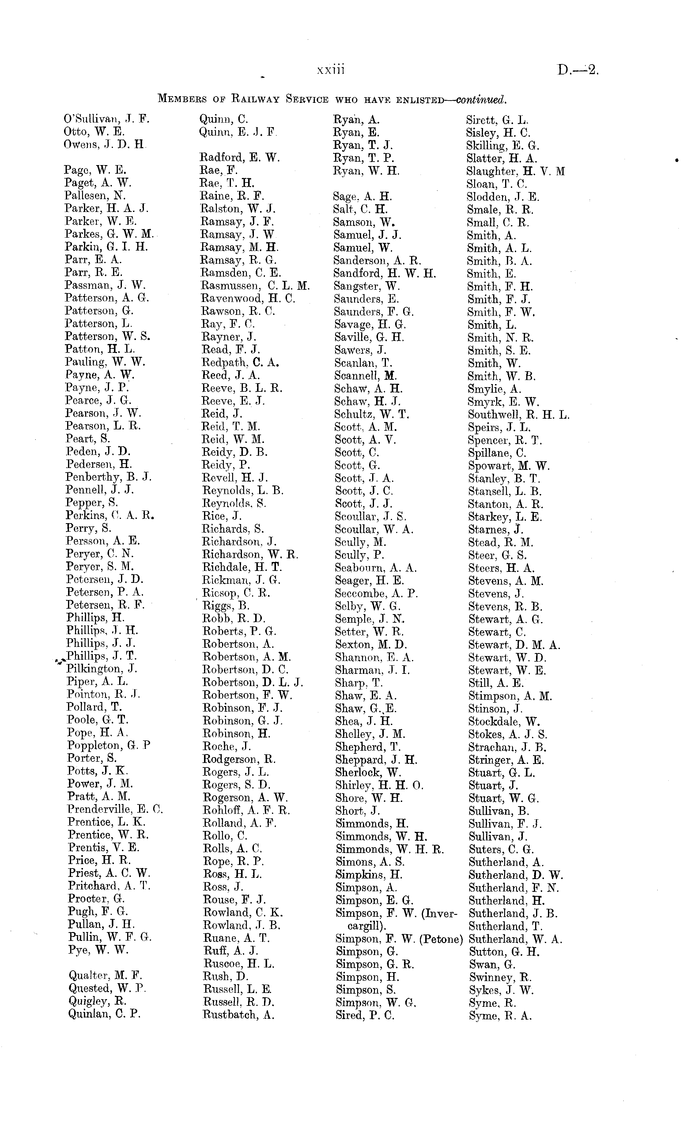 Members of Railway Service who have enlisted— continued,. O'Sullivan, J. F. Quinn, C. Ryan, A. Sirett, G. L. Otto, W. E. Quinn, E. J. F Ryan, E. Sisley, H. C. Owens, J. D. H Ryan, T. J. Shilling, E. G. Radford, E. W. Ryan, T. P. Shatter, H. A. Page, W. E. Rae, F. Ryan. W. H. Slaughter, H. V. M Paget, A. W. Rae, T. H. Sloan, T. C. Pallesen, N. Raine, R. F. Sage. A. H. Slodden, J. E. Parker, H. A. J. Ralston, W. J. Salt, C. H. Smale, R. R. Parker, W. E. Ramsay, J. F. Samson, W. Small, C. R. Parkes, G. W. M. Ramsay, J. W Samuel, J. J. Smith, A. Parkin, G. I. H. Ramsay, M. H. Samuel, W. Smith, A. L. Parr, E. A. Ramsay, R. G. Sanderson, A. R. Smith, B. A. Parr, R. E. Ramsden, C. E. Sandford, H. W. H. Smith, E. Passman, J. W. Rasmussen, C. L. M. Sangster, W. Smith, F. H. Patterson, A. G. Ravenwood, H. C. Saunders, E. Smith, F. J. Patterson, G. Rawson, R. C. Saunders, F. G. Smith, F. W. Patterson, L. Ray, F. C. Savage, H. G. Smith, L. Patterson, W. S. Rayner, J. Saville, G. H. Smith, N. R. Patton, H. L. Read, F. J. Sawers, J. Smith, S. E. Pauling, W. W. Redpath, C. A. Scanlan, T. Smith, W. Payne, A. W. Reed, J. A. Scanned, M. Smith, W. B. Payne, J. P. Reeve, B. L. R. SchaW, A. H. Smylie, A. Pearce, J. G. Reeve, E. J. Schaw, H. J. Smyrk, E. W. Pearson, J. W. Reid, J. Schultz, W. T. Southwell, R. H. L Pearson, L. R. Reid, T. M. Scott, A. M. Speirs, J. L. Peart, S. Reid, W. M. Scott, A. V. Spencer, R. T. Pcden, J. D. Reidy, D. B. Scott, C. Spillane, C. Pedersen, H. Reidy, P. Scott, G. Spowart, M. W. Penberthy, B. J. Revell, H. J. Scott, J. A. Stanley, B. T. Penned, J. J. Reynolds, L. B. Scott, J. C. Stansell, L. B. Pepper, S. Reynolds, S. Scott, J. J. Stanton, A. R. Perkins, C. A. R. Rice, J. Scoullar, J. S. Starkey, L. E. Perry, S. Richards, S. Scoullar, W. A. Starnes, J. Persson, A. E. Richardson. J. Scully. M. Stead, R. M. Peryer, C. N. Richardson, W. R. Scully, P. Steer, G. S. Peryer, S. M. Richdale, H. T. Seabourn, A. A. Steers, H. A. Petersen, J. D. Rickman, J. G. Seager, H. E. Stevens, A. M. Petersen, P. A. Ricsop, C. R. Seccombe, A. P. Stevens, J. Petersen, R. F. Riggs, B. Selbv, W. G. Stevens, R. B. Phillips, H. Robb, R. D. Semple, J. N. Stewart, A. G. Phillips, J. H. Roberts, P. G. Setter, W. R. Stewart, C. Phillips, J. J. Robertson, A. Sexton, M. D. Stewart, D. M. A. J. T. Robertson, A. M. Shannon, E. A. Stewart, W. D. " Pilkington, J. Robertson, D. C. Sharman, J. I. Stewart, W. E. Piper, A. L. Robertson, D. L. J. Sharp, T. Still, A. E. Pointon, R. J. Robertson, F. W. Shaw, E. A. Stimpson, A. M. Pollard, T. Robinson, F. J. Shaw, G. E. Stinson, J. Poole, G. T. Robinson, G. J. Shea, J. H. Stockdale, W. Pope, H. A. Robinson, H. Shelley, J. M. Stokes, A. J. S. Poppleton, G. P Roche, J. Shepherd, T. Strachan, J. B. Porter, S. Rodgerson, R. Sheppard, J. H. Stringer, A. E. Potts, J. K. Rogers, J. L. Sherlock, W. Stuart, G. L. Power, J. M. Rogers, S. D. Shirley, H. H. 0. Stuart, J. Pratt, A. M. Rogerson, A. W. Shore, W. H. Stuart, W. G. Prenderville, E. C. Rohloff, A. F. R. Short, J. Sullivan, B. Prentice, L. K. Rolland, A. F. Simmonds, H. Sullivan, F. J. Prentice, W. R. Rollo, C. Simmonds, W. H. Sullivan, J. Prentis, V. E. Rolls, A. C. Simmonds, W. H. R. Suters, C. G. Price, H. R. Rope, R. P. Simons, A. S. Sutherland, A. Priest, A. C. W. Ross, H. L. SimpHns, H. Sutherland, D. W. Pritchard, A. T. Ross, J. Simpson, A. Sutherland, F. N. Procter, G. Rouse, F. J. Simpson, E. G. Sutherland, H. Pugh, F. G. Rowland, C. K. Simpson, F. W. (Inver- Sutherland, J. B. Pullan, J. H. Rowland, J. B. cargill). Sutherland, T. Pullin, W. F. G. Ruane, A. T. Simpson. F. W. (Petone) Sutherland, W. A. Pye, W. W. Ruff, A. J. Simpson, G. Sutton, G. H. Ruscoe, H. L. Simpson, G. R. Swan, G. Quarter, M. F. Rush, D. Simpson, H. Swinney, R. Quested, W. P. Russell, L. E. Simpson, S. Sykes. j. W. Quigley, R. Russell, R. D. Simpson, W. G. Syme, R. Quinlan, C. P. Rustbatch, A. Sired, P. C. Syme, R. A.