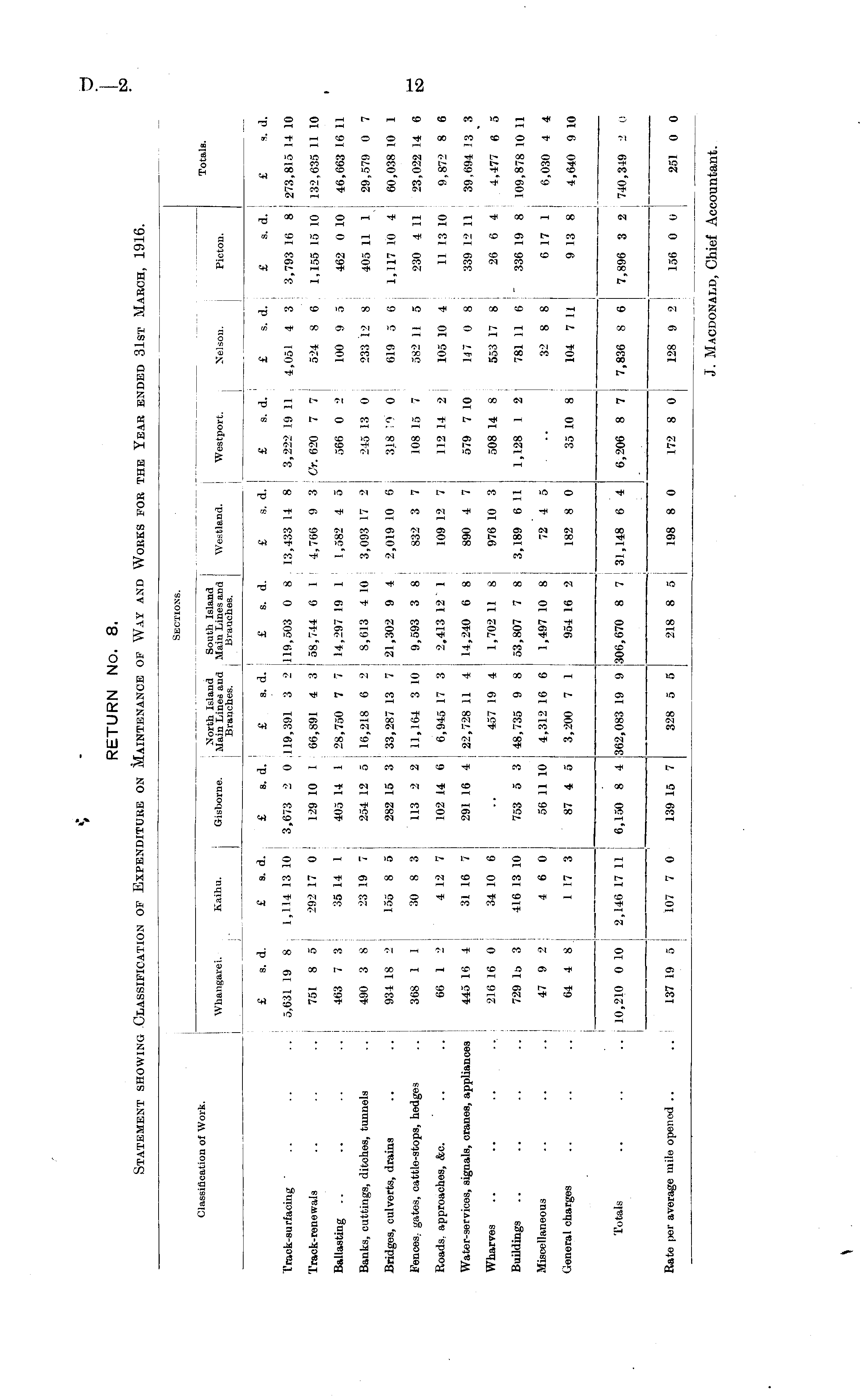 RETURN No. 8. Statement showing classification of Expenditure on Maintenance of Way and Works for the Year ended 31st March, 1916.
