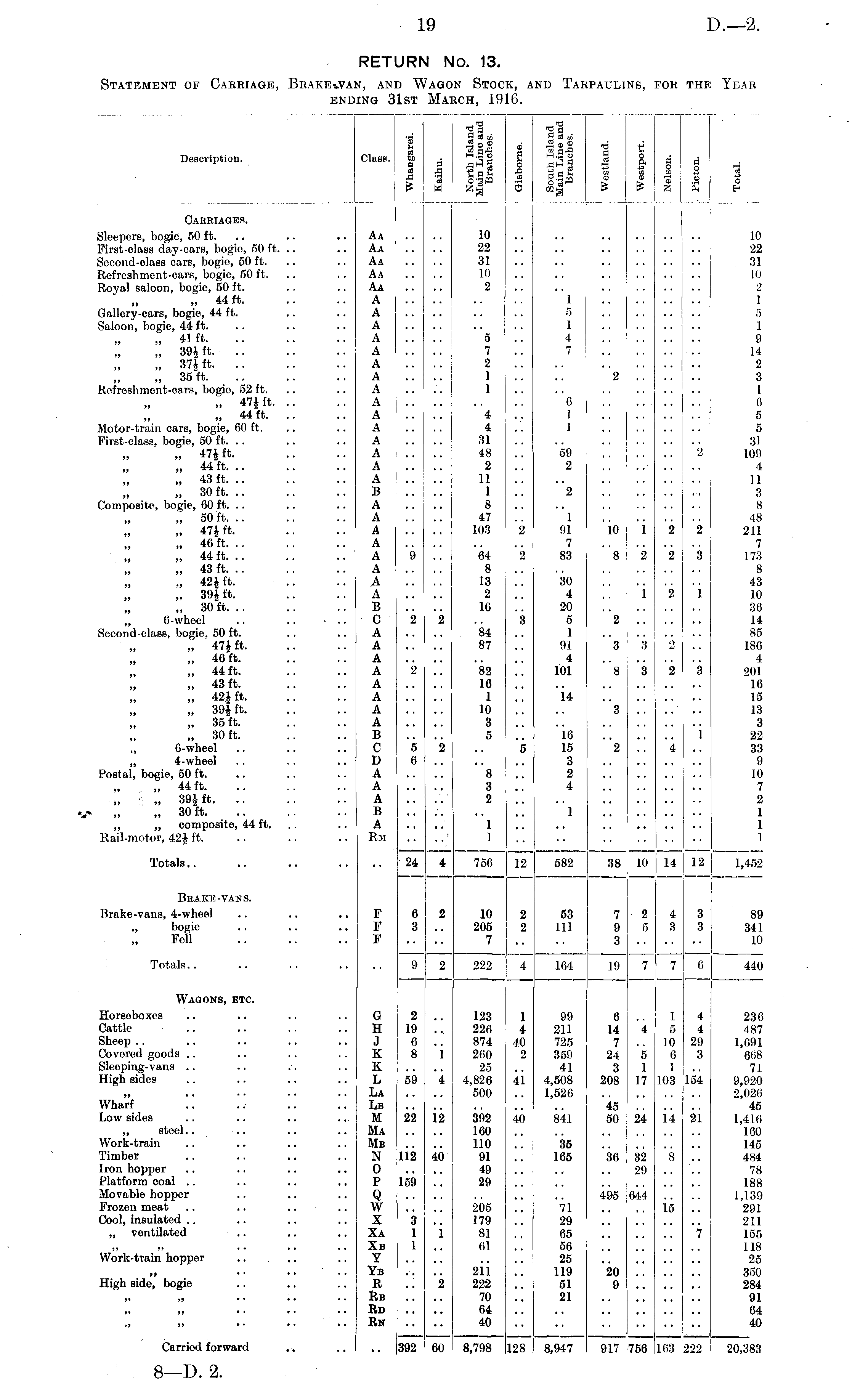 RETURN No. 13. Statement of Carriage, Brake-van, and Wagon Stock, and Tarpaulins, for the Year ending 31st March, 1916.