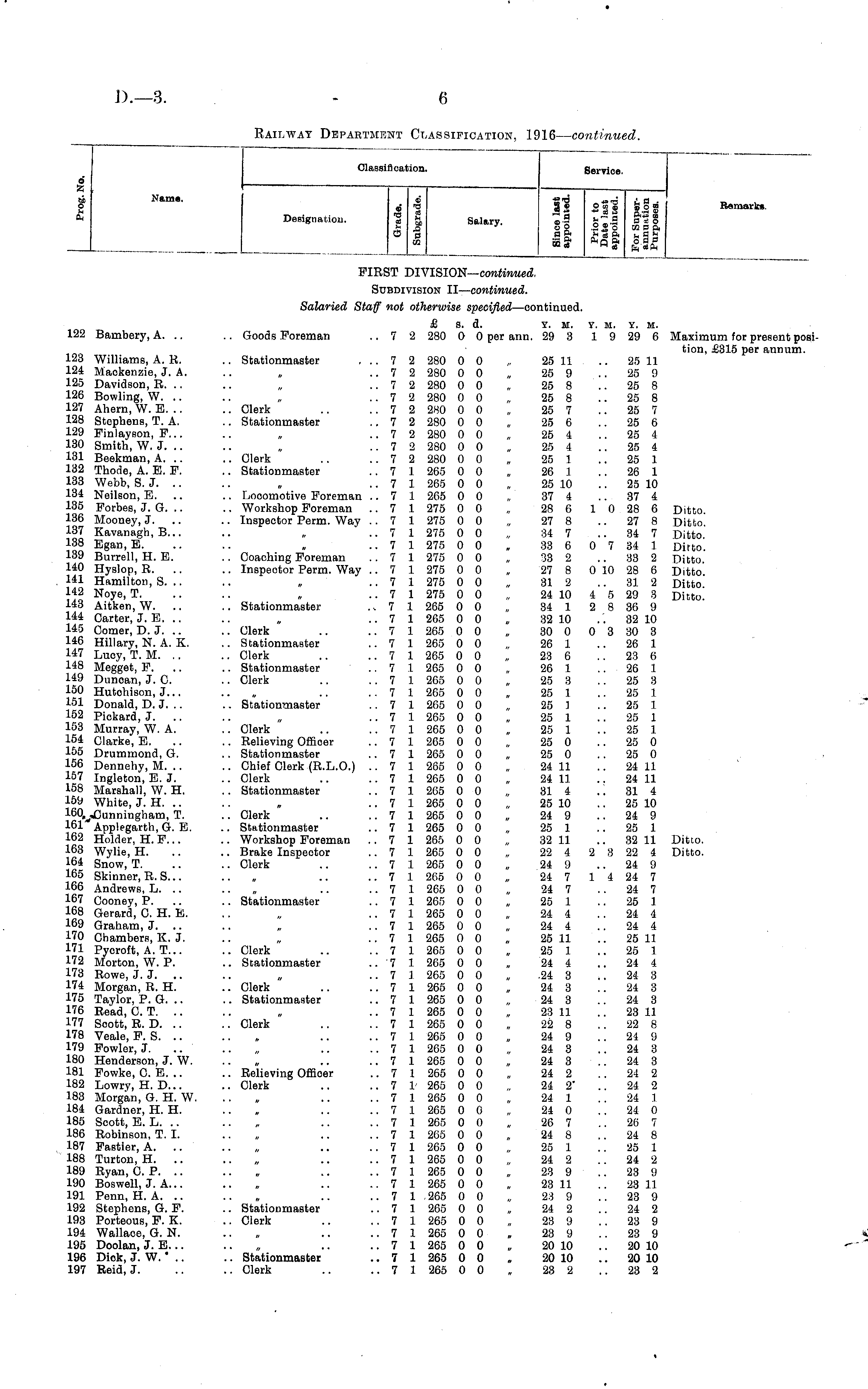 Classification. Service. 6 g , 1 ! T ■ si Name. cj 12-13 .3-: ,* a . „ g „• -3 3| oS? S§» Remarks. A Designation. | | Salary. g| gtl ff £ __ J* Bg 1 *a& |S£ i 11 s%i So 0.3 a a * s a 11 lit P s3 O WPft u S tj Remarks. FIRST DIVISION— continued. Subdivision II— continued. Salaried Staff not otherwise specified —continued. £ 8. d. Y. M. Y. M. Y. M. 122 Bambery, A. .. .. Goods Foreman .. 7 2 280 0 0 per ann. 29 3 1 9 29 6 Maximum for present posi tion, £315 per annum. 123 Williams, A. R. .. Stationmaster ... 7 2 380 0 0 „ 25 1.1 .. 25 11 124 Mackenzie, J. A. .. „ .. 7 2 280 0 0 „ 25 9 25 9 125 Davidson, R. .. .. „ .. 7 2 280 0 0 ,, 25 8 25 8 126 Bowling, W. .. .. „ .. 7 2 280 0 0 „ 25 8 25 8 127 Ahem, W. E. .. .. Clerk .. .. 7 2 280 0 0 „ 25 7 .. 25 7 128 Stephens, T. A. .. Stationmaster .. 7 2 280 0 0 „ 25 6 .. 25 6 129 Finlayson, F... .. „ .. 7 2 280 0 0 „ 25 4 ..25 4 130 Smith, W. J. .. .. „ .. 7 2 280 0 0 „ 25 4 25 4 131 Beekman, A. .. .. Clerk .. .. 7 2 280 0 0 „ 25 1 25 1 132 Thode, A. E. P. .. Stationmaater .. 7 1 265 0 0 „ 26 1 .. 26 1 133 Webb, S. J. .. .. „ .. 7 1 265 0 0 „ 25 10 .. 25 10 134 Neilson, E. .. .. Locomotive Foreman .. 7 1 265 0 0 „ 37 4 .. 37 4 135 Forbes, J. G. .. .. Workshop Foreman .. 7 1 275 0 0 „ 28 6 1 0 28 6 Ditto 136 Mooney, J. .. .. Inspector Perm. Way .. 7 1 275 0 0 „ 27 8 .. 27 8 Ditto 137 Kavanagh, B... .. „ .. 7 1 275 0 0 „ 34 7 34 7 Ditto 138 Egan, E. .. .. „ .. 7 1 275 0 0 38 6 0 7 34 1 Ditto. 139 Burrell, H. E. .. Coaching Foreman .. 7 1 275 0 0 „ 33 2 .. 33 2 Ditto 140 Hyslop, R. .. .. Inspeotor Perm. Way .. 7 1 275 0 0 , 27 8 0 10 28 6 Ditto 1*1 Hamilton, S. .. .. „ .. 7 1 275 0 0 31 2 .. 31 2 Ditto 142 Noye, T. .. .. „ .. 7 1 275 0 0 24 10 4 5 29 3 Ditto. 1*3 Aitken, W. .. .. Stationmaster .. 7 1 265 0 0 „ 34 1 2 8 36 9 144 Carter, J. E. .. .. „ .. 7 1 265 0 0 „ 32 10 .. 32 10 145 Comer, D. J. .. .. Clerk .. .. 7 1 265 0 0 „ 30 0 0 3 30 3 146 Hillary, N. A. K. .. Stationmaster .. 7 1 265 0 0 „ 26 1 .. 26 1 147 Lucy, T. M. .. .. Clerk .. .. 7 1 265 0 0 „ 23 6 .. 23 6 148 Megget, P. .. Stationmaater .. 7 1 265 0 0 „ 26 1 .. 26 1 149 Dunoan, J. C. .. Clerk .. .. 7 1 265 0 0 „ 25 3 25 3 150 Hutchison, J... .. .. .. 7 1 265 0 0 , 25 1 25 1 151 Donald, D. J. .. .. Stationmaater .. 7 1 265 0 0 „ 25 1 .. 25 1 152 Pickard, J. .. .. „ .. 7 1 265 0 0 „ 25 1 25 1 153 Murray, W. A. .. Clerk .. .. 7 1 265 0 0 „ 25 1 .. 25 1 154 Clarke, E. .. .. Relieving Offioer .. 7 1 265 0 0 „ 25 0 .. 25 0 155 Drummond, G. .. Stationmaster .. 7 1 265 0 0 „ 25 0 .. 25 0 156 Dennehy, M. .. .. Chief Clerk (R.L.O.) .. 7 1 265 0 0 „ 24 11 .. 24 11 157 Ingleton, E. J. .. Clerk .. .. 7 1 365 0 0 „ 24 11 .. 24 11 158 Marshall, W. H. .. Stationmaster .. 7 1 265 0 0 „ 31 4 .. 31 4 159 White, J. H. .. .. „ .. 7 1 265 0 0 „ 25 10 .. 25 10 T. .. Clerk .. .. 7 1 265 0 0 „ 24 9 .. 24 9 161 Applegarth, G. E. .. Stationmaster .. 7 1 265 0 0 „ 25 1 .. 25 1 162 Holder, H. F... .. Workshop Foreman .. 7 1 265 0 0 „ 32 1.1 .. 32 11 Ditto. 163 Wylie, H. .. .. Brake Inspector .. 7 1 265 0 0 „ 22 4 2 3 22 4 Ditto. !64 Snow, T. .. .. Clerk .. .. 7 1 265 0 0 „ 24 9 .. 24 9 165 Skinner, R. S... .. „ .. .. 7 1 265 0 0 „ 24 7 1 4 24 7 166 Andrews, L. .. .. „ .. .. 7 1 265 0 0 24 7 24 7 167 Cooney, P. .. .. Stationmaster .. 7 1 265 0 0 „ 25 1 25 1 168 Gerard, C. H. E. .. „ .. 7 1 265 0 0 „ 24 4 24 4 169 Graham, J. .. .. „ .. 7 1 265 0 0 „ 24 4 24 4 170 Chambers, K.J. .. „ .. 7 1 265 0 0 „ 25 11 .. 25 11 171 Pycroft, A. T... .. Clerk .. .. 7 1 265 0 0 „ 25 1 25 1 172 Morton, W. P. .. Stationmaster .. 7 1 265 0 0 „ 24 4 .. 24 4 173 Rowe, J.J... .. „ .. 7 1 265 0 0 „ .24 3 .. 24 8 174 Morgan, R. H. .. Clerk .. .. 7 1 265 0 0 „ 24 3 .. 24 3 175 Taylor, P. G. .. .. Stationmaster .. 7 1 265 0 0 „ 24 3 .. 24 3 176 Read, C. T. .. .. „ .. 7 1 265 0 0 23 11 .. 23 11 177 Scott, R. D. .. .. Clerk .. .. 7 1 265 0 0 , 22 8 22 8 178 Veale, P. S. .. .. „ .. .. 7 1 265 0 0 , 24 9 ..249 179 Fowler, J. .. .. „ .. .. 7 1 265 0 0 „ 24 3 24 3 180 Henderson, J. W. .. „ .. .. 7 1 265 0 0 , 24 3 24 3 181 Fowke, C. E. .. .. Relieving Offioer .. 7 1 265 0 0 „ 24 2 .. 24 2 182 Lowry, H. D... .. Clerk .. .. 7 1' 265 0 0 „ 24 2' .. 24 2 183 Morgan, G. H. W. .. , .. .. 7 1 265 0 0 „ 24 1 24 1 184 Gardner, H. H. .. , .. .. 7 1 265 0 0 „ 24 0 24 0 185 Scott, E. L. .. .. „ .. .. 7 1 265 0 0 „ 26 7 26 7 186 Robinson, T. I. .. „ .. .. 7 1 265 0 0 „ 24 8 24 8 187 Pastier, A. .. .. „ .. .. 7 1 265 0 0 „ 25 1 25 1 188 Turton, H. .. .. ,, .. .. 7 1 265 0 0 „ 24 2 .. 24 2 189 Ryan, C. P. .. .. , .. .. 7 1 265 0 0 „ 23 9 23 9 190 Boswell, J. A... .. „ .. .. 7 1 265 0 0 „ 23.11 ..23 11 191 Penn, H. A. .. .. „ .. .. 7 1 .265 0 0 „ 23 9 ..239 192 Stephens, G. P. .. Stationmaater .. 7 1 265 0 0 „ 24 2 .. 24 2 193 Porteous, F. K. .. Clerk .. .. 7 1 265 0 0 , 23 9 .. 23 9 194 Wallace, G. N. .. „ .. .. 7 1 265 0 0 „ 23 9 23 9 195 Doolan, J. E... .. „ .. .. 7 1 265 0 0 „ 20 10 20 10 196 Dick, J. W." .. .. Stationmaster .. 7 1 265 0 0 „ 20 10 .. 20 10 197 Reid, J. .. .. Clerk .. .. 7 1 265 0 0 „ 23 2 .. 23 2